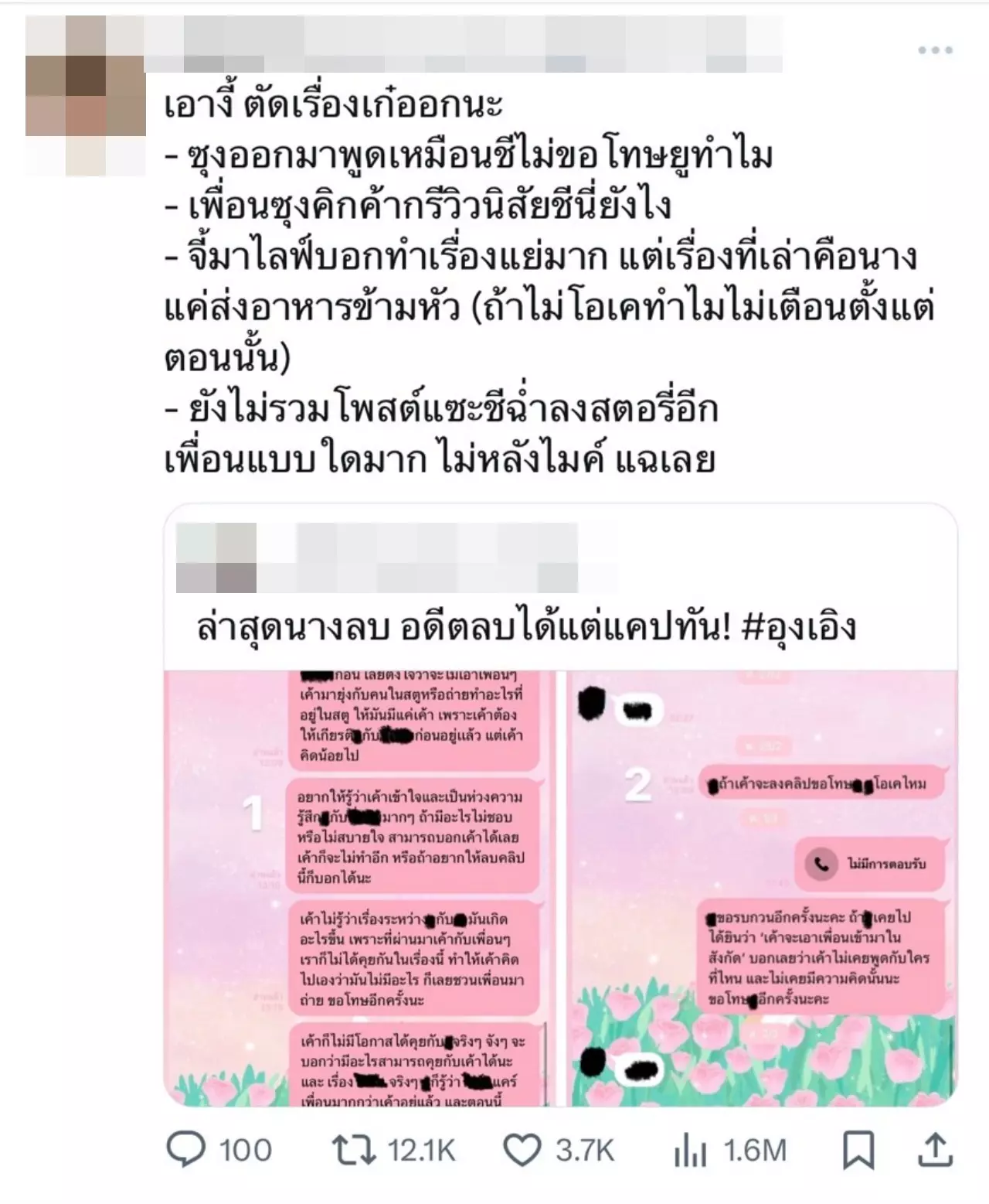 หลังจากก่อนหน้านี้ อุงเอิง ได้งัดหลักฐานแชตไลน์ที่พยายามติดต่อขอโทษ ครีม และ ยู SPD ตั้งแต่วันที่ 26 ก.พ. 67 ก่อนขออโหสิกรรม เก๋ไก๋ และทุกคนที่ได้รับผลกระทบ ผ่านไอจีส่วนตัว uu.eung ในวันที่ 7 มี.ค 67 เป็นการยืนยันว่า อุงเอิงได้ขอโทษจริง ชาวเน็ตจึงมองว่าเรื่องนี้สวนทางกับที่ ซุง เคยพูดในไลฟ์