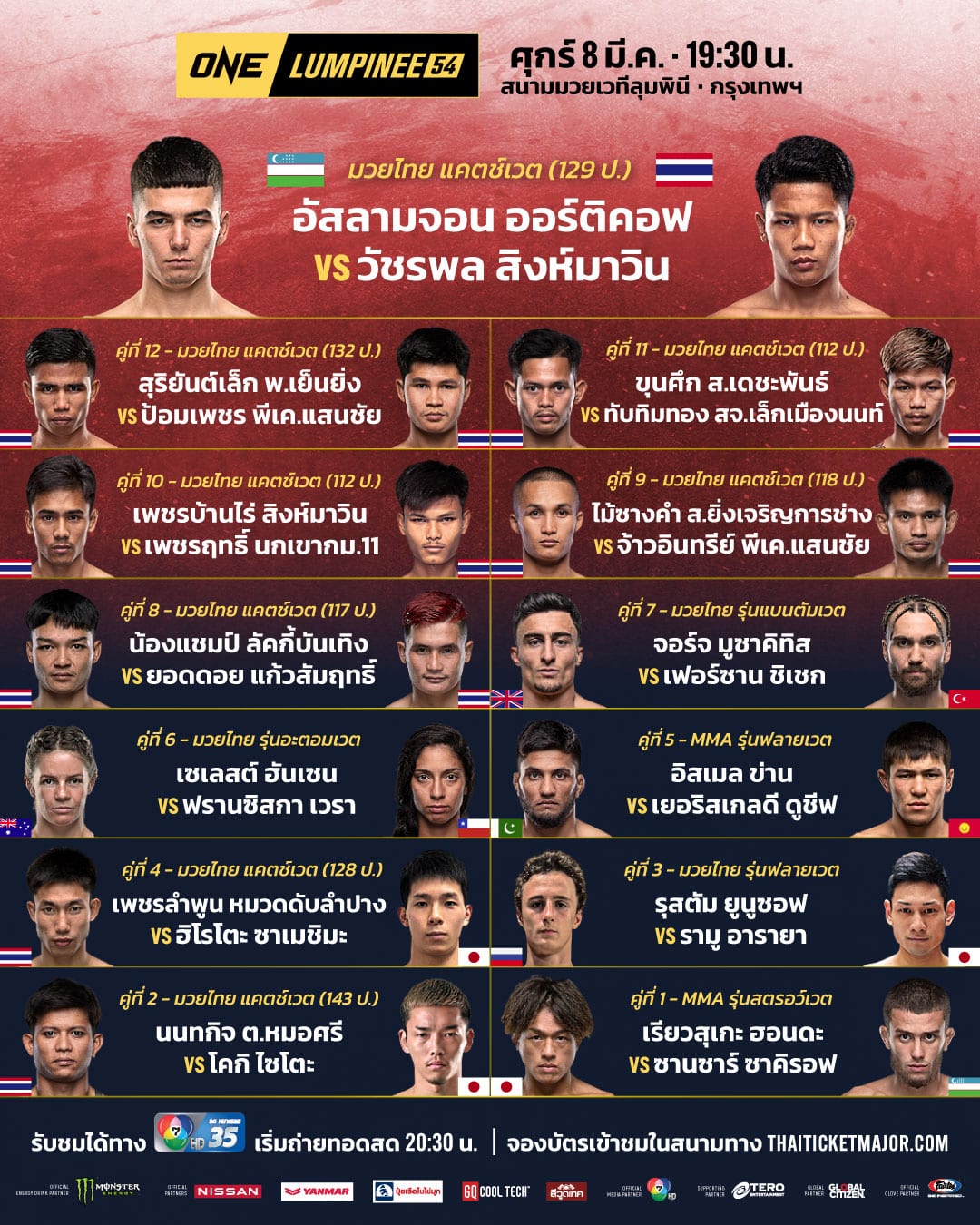 โปรแกรมมวย ONE ลุมพินี 54 สัปดาห์นี้ คู่เอก “อัสลามจอน ออร์ติคอฟ” วันเดอร์คิด วัย 20 ปี จากอุซเบกิสถาน เล็งเก็บชัย 4 ไฟต์ติด เปิดหน้าปะทะแกร่ง “วัชรพล สิงห์มาวิน” มวยเข่าปลายแรง วัย 21 ปี จากสงขลา ที่ผ่านไป 2 ไฟต์ยังสะกดคำว่าแพ้ใครไม่เป็นเหมือนกัน โดยจะพบกันในกติกามวยไทย พิกัดเฉพาะ (แคตช์เวต) 129 ป.
