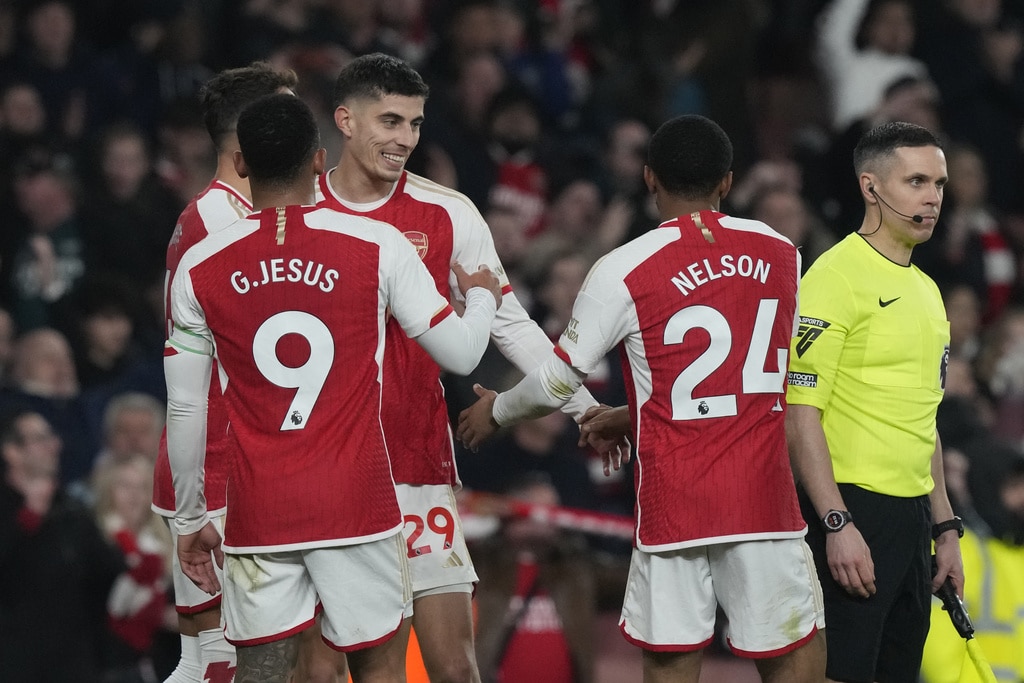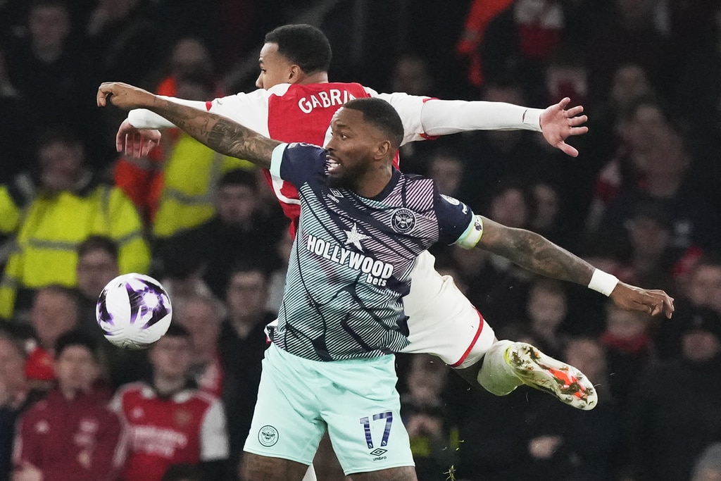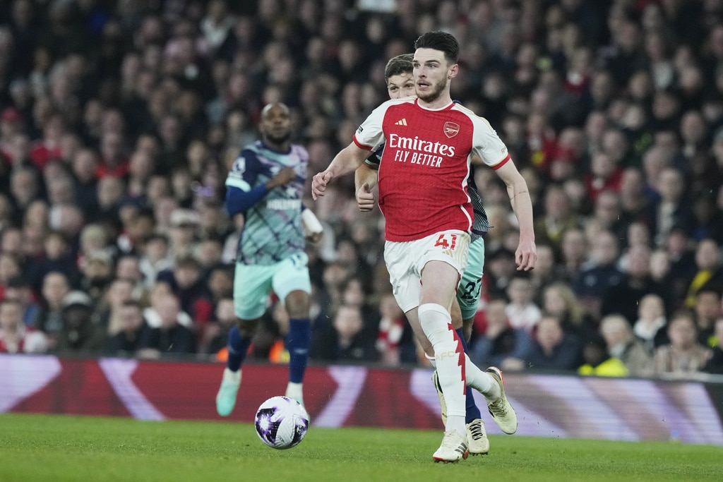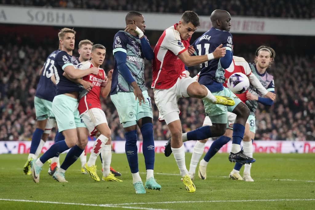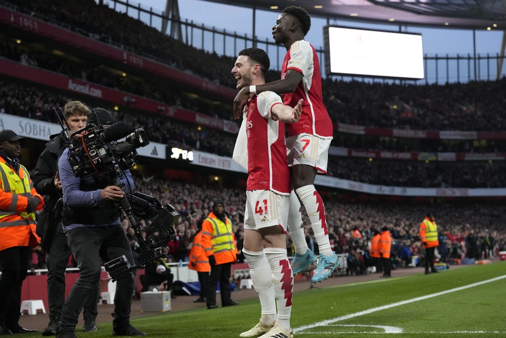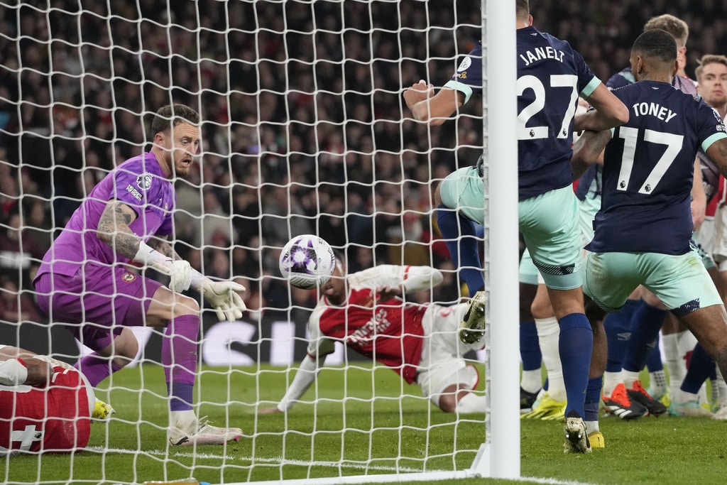 Arsenal’s Declan Rice, centre left, celebrates with Bukayo Saka after scoring the opening goal during the English Premier League soccer match between Arsenal and Brentford at the Emirates Stadium in London, England, Saturday, March 9, 2024. (AP Photo/Frank Augstein)Arsenal’s Kai Havertz, centre, celebrates with teammates after the English Premier League soccer match between Arsenal and Brentford at the Emirates Stadium in London, England, Saturday, March 9, 2024. (AP Photo/Frank Augstein)Arsenal’s Kai Havertz, right, challenges for the ball during the English Premier League soccer match between Arsenal and Brentford at the Emirates Stadium in London, England, Saturday, March 9, 2024. (AP Photo/Frank Augstein)Brentford’s goalkeeper Mark Flekken, left, makes a save during the English Premier League soccer match between Arsenal and Brentford at the Emirates Stadium in London, England, Saturday, March 9, 2024. (AP Photo/Frank Augstein)Players challenge for the ball during the English Premier League soccer match between Arsenal and Brentford at the Emirates Stadium in London, England, Saturday, March 9, 2024. (AP Photo/Frank Augstein)Arsenal’s Gabriel, top, and Brentford’s Ivan Toney challenge for the ball during the English Premier League soccer match between Arsenal and Brentford at the Emirates Stadium in London, England, Saturday, March 9, 2024. (AP Photo/Frank Augstein)Arsenal’s Declan Rice controls the ball during the English Premier League soccer match between Arsenal and Brentford at the Emirates Stadium in London, England, Saturday, March 9, 2024. (AP Photo/Frank Augstein)Arsenal’s Kai Havertz, left, and Brentford’s Vitaly Janelt challenge for the ball during the English Premier League soccer match between Arsenal and Brentford at the Emirates Stadium in London, England, Saturday, March 9, 2024. (AP Photo/Frank Augstein)Arsenal’s Jorginho, centre, celebrates after Declan Rice scored the opening goal during the English Premier League soccer match between Arsenal and Brentford at the Emirates Stadium in London, England, Saturday, March 9, 2024. (AP Photo/Frank Augstein)
