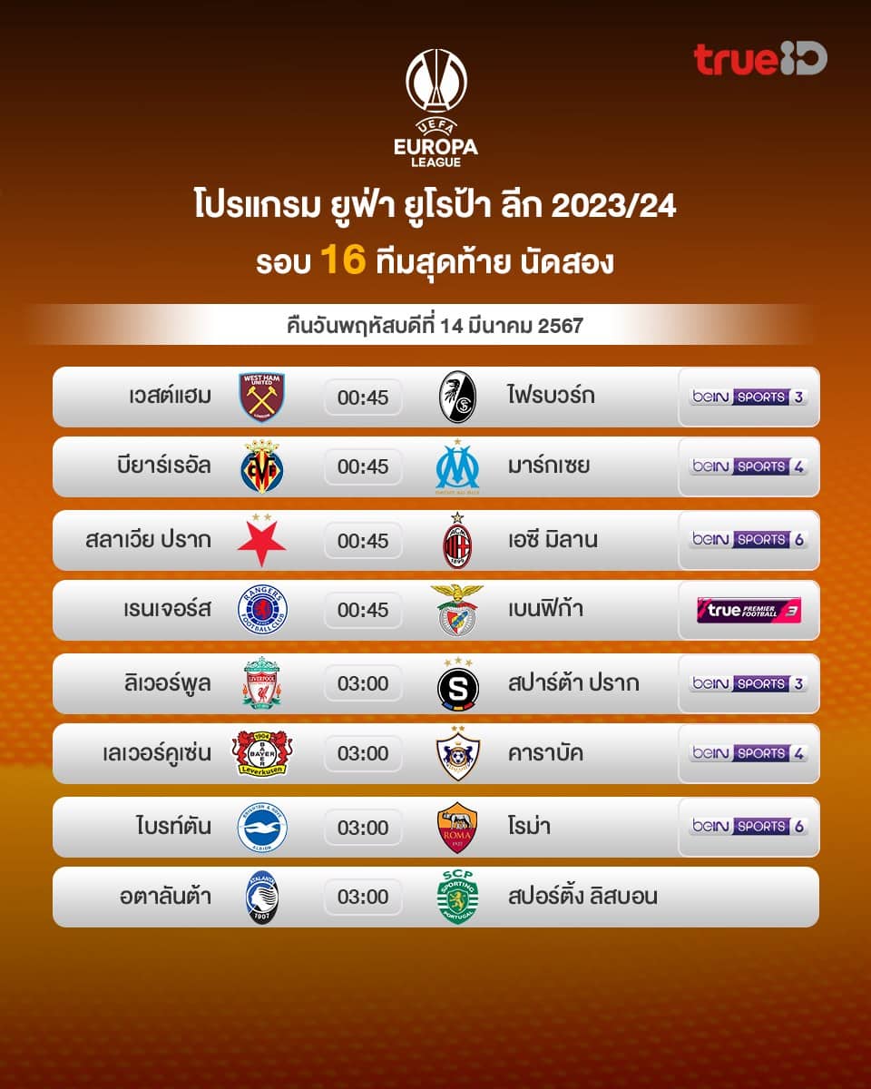 ยูโรป้า ลีก รอบ 16 ทีมสุดท้าย นัดสอง 2023/24 วันที่ 14 มีนาคม 2567