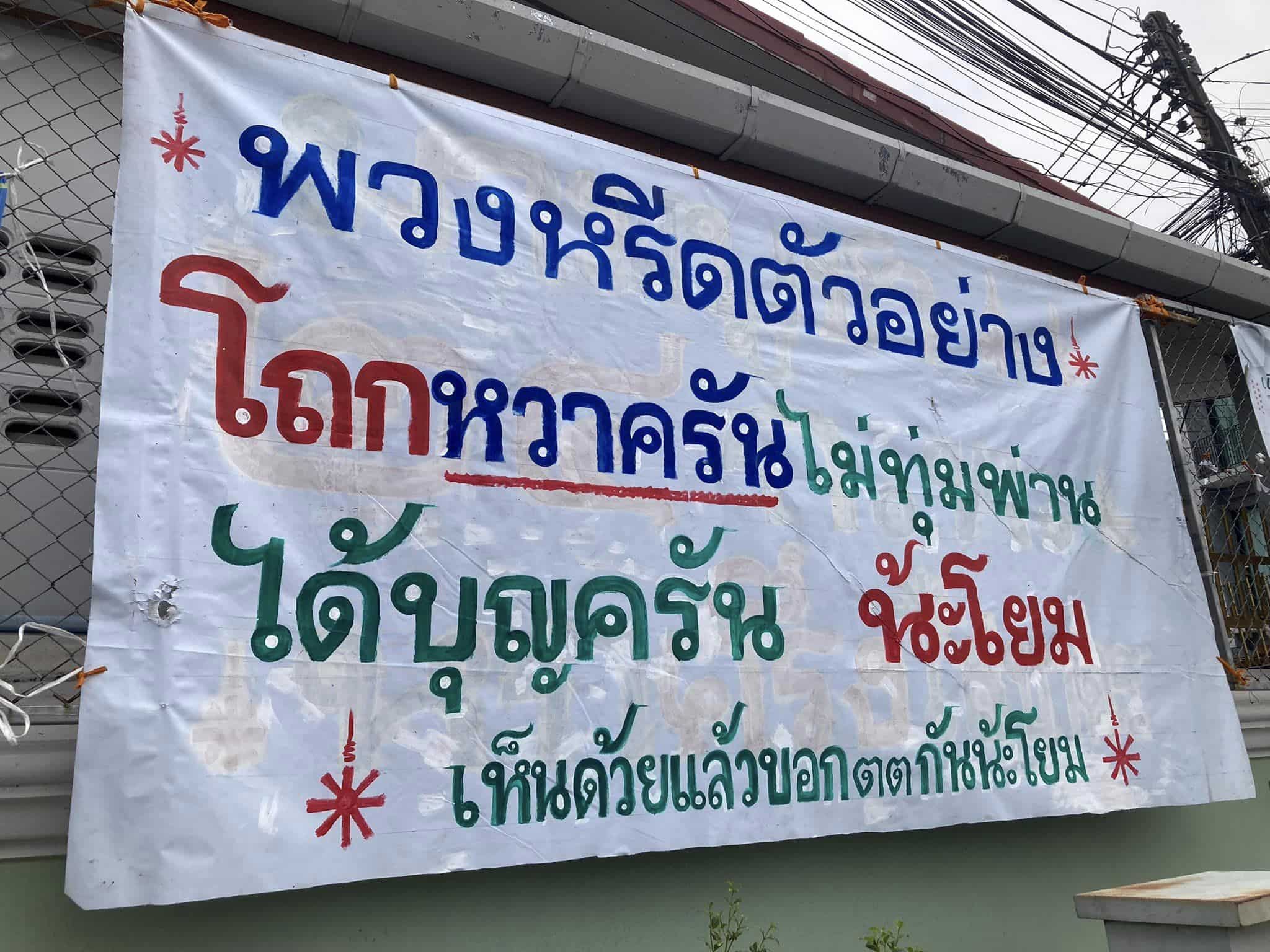 ข้อความบนป้ายสีขาวขนาดใหญ่แขวนอยู่เขียนว่า “พวงหรีดตัวอย่าง โถกหวาครัน ไม่ทุ่มพ่าน ได้บุญครัน น้ะโยม เห็นด้วยแล้วบอก ตต กันน้ะโยม”