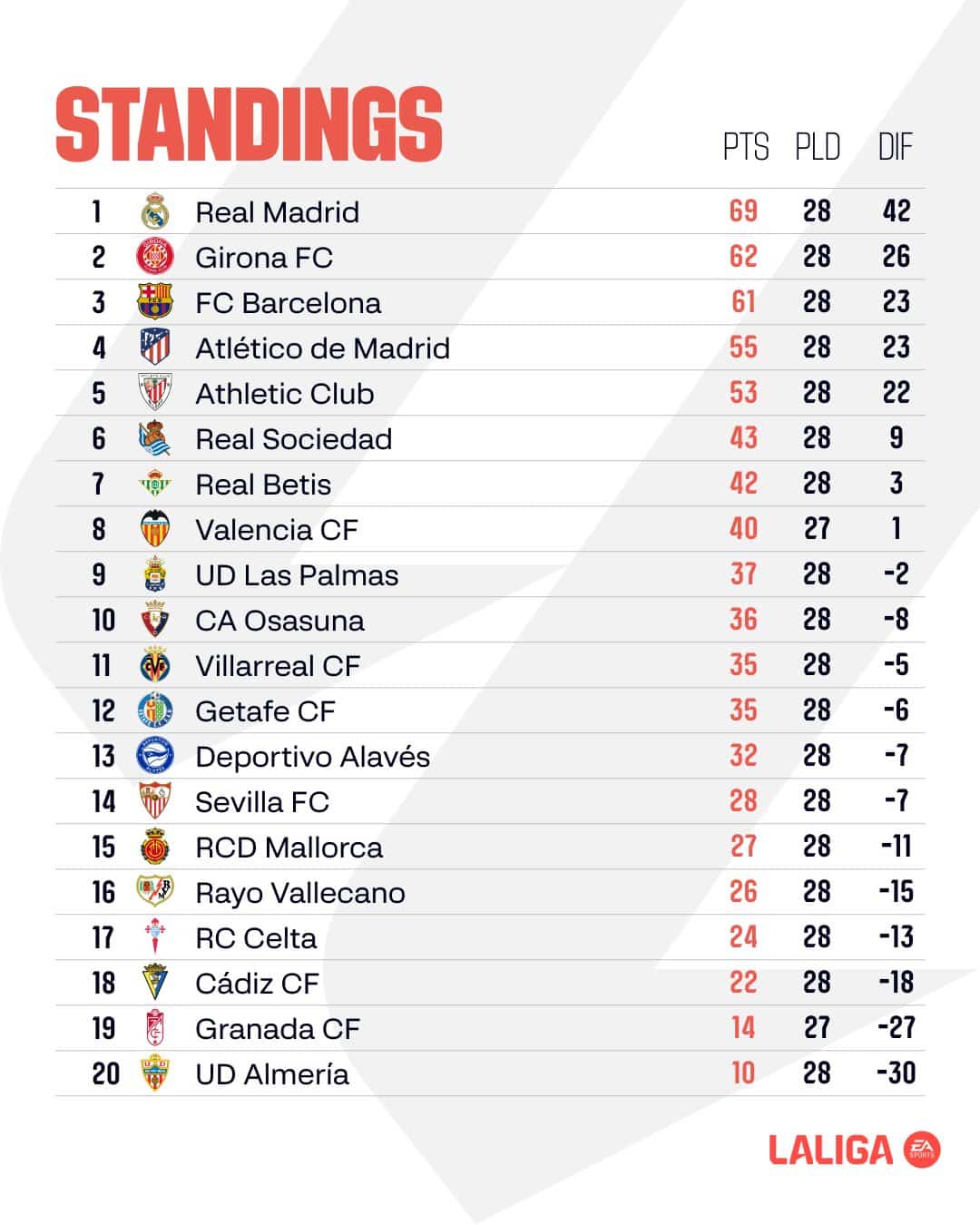 อันดับ ตารางคะแนน ลาลีกา สเปน 2023/24 หลังจบแมตซ์เดย์ที่ 28 โดย 5 อันดับเป็นไปตามลำดับมีดังนี้ (อัปเดตวันที่ 12 มีนาคม 2567)