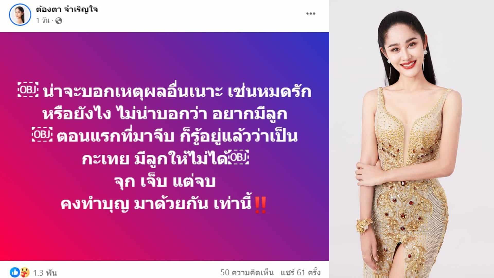 ครูต้องตา อดีตผู้เข้าประกวดมิสทิฟฟานี่ 2016 ถูกแฟนทหารทิ้ง จบสัมพันธ์รัก 8 ปี เพราะอีกฝ่ายอยากสร้างครอบครัว แต่เจ้าตัวมีลูกให้ไม่ได้ ช้ำใจ เปิดแชตแฟนหนุ่ม ขอให้เราเป็นแค่เพื่อนกันก็พอ