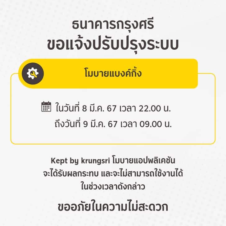 - ธนาคารกรุงศรี ปิดปรับปรุงระบบ มีนาคม 2567 โอนเงินไม่ได้