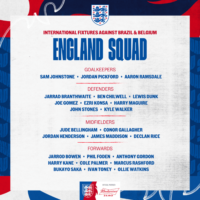 รายชื่อนักเตะ ทีมชาติอังกฤษ ชุดอุ่นเครื่องฟีฟ่าเดย์เดือน มีนาคม 2567