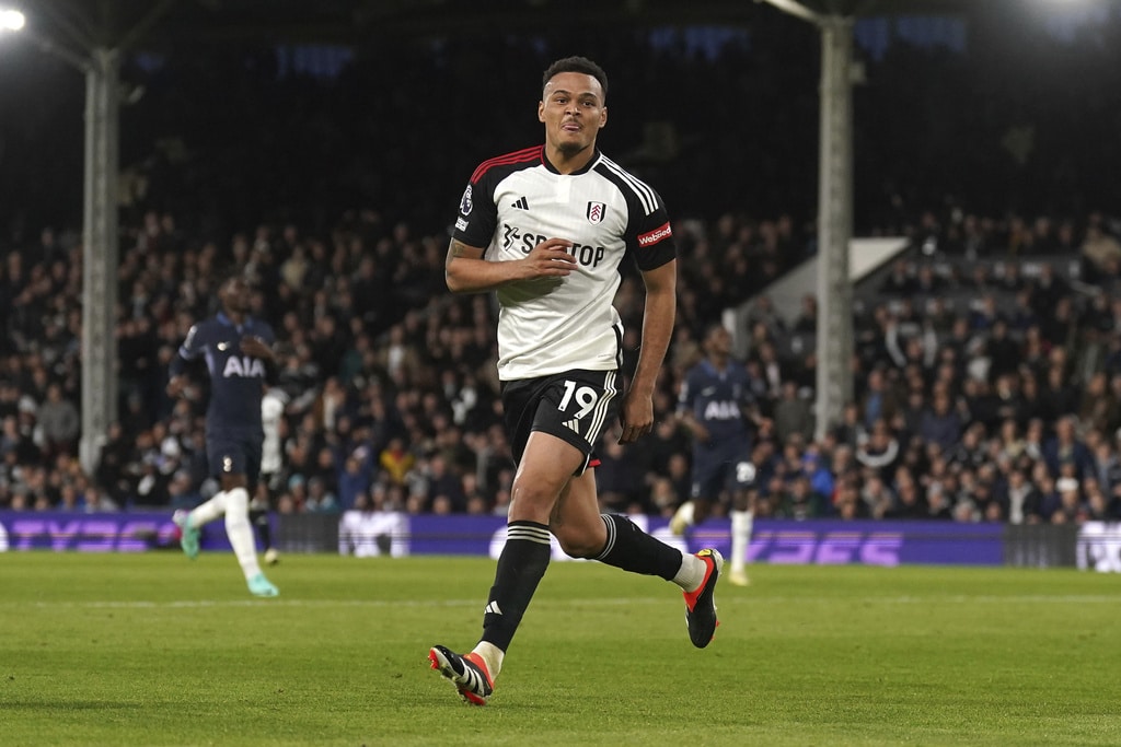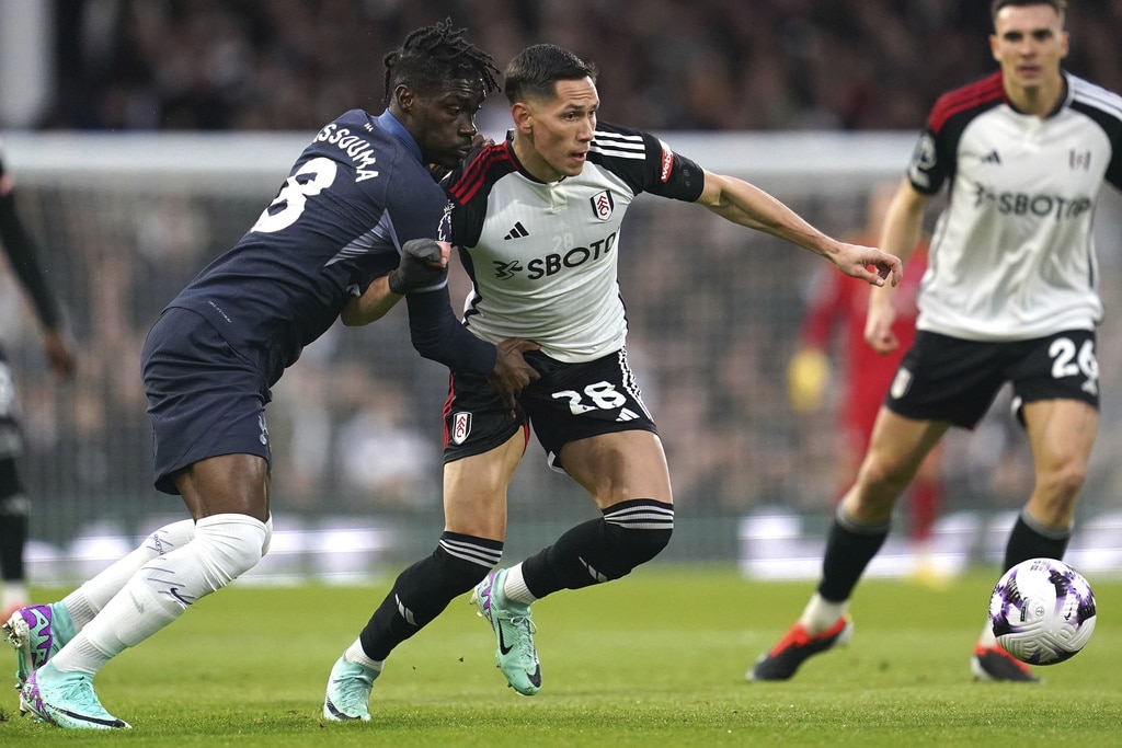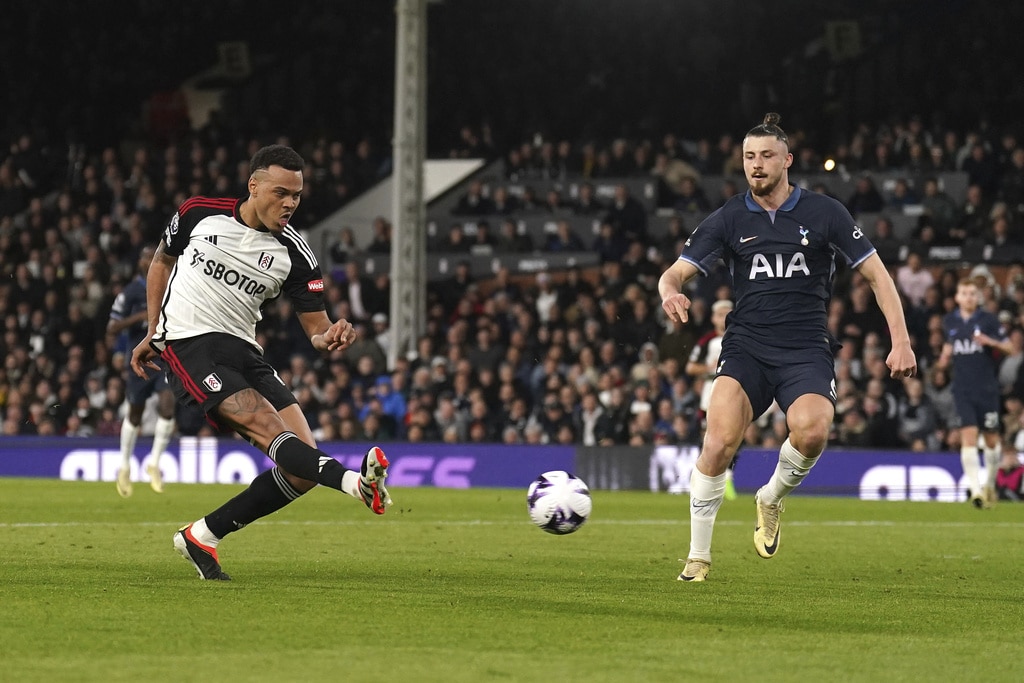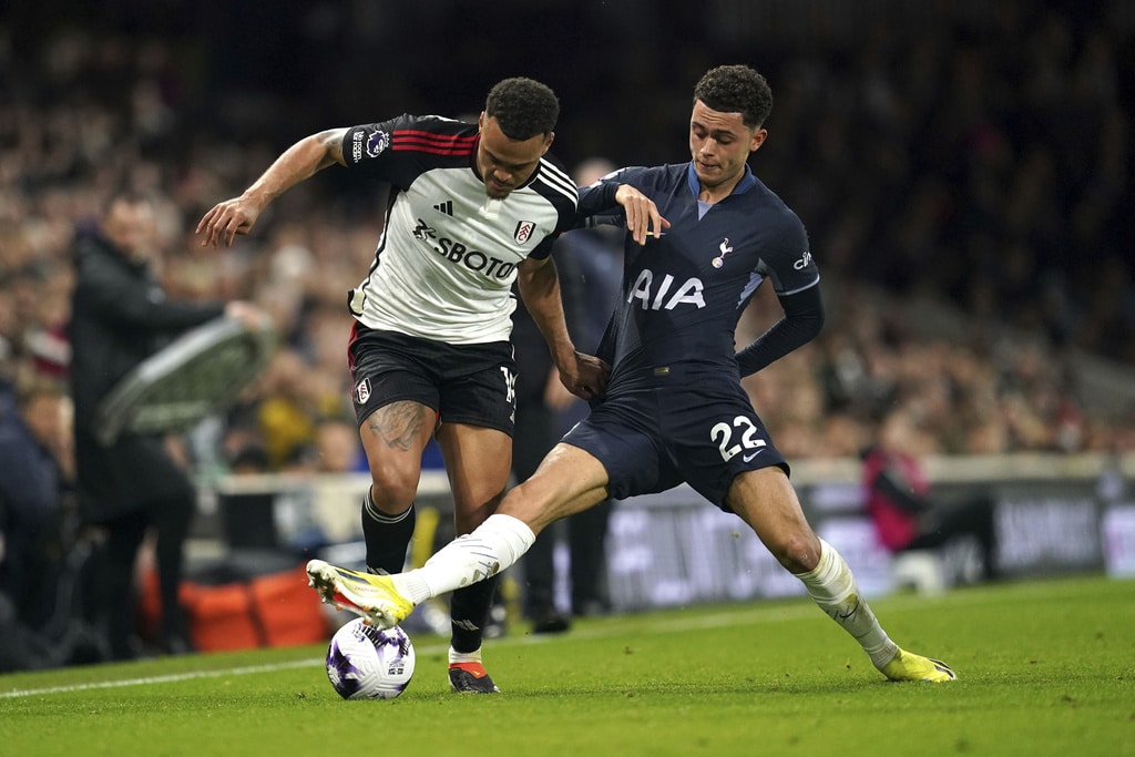 Tottenham Hotspur’s Yves Bissouma, left, and Fulham’s Sasa Lukic, center, challenge for the ball during a Premier League soccer match between FC Fulham and Tottenham Hotspur in London, England, Saturday, March 16, 2024. (Adam Davy/PA via AP)Fulham’s Rodrigo Muniz, left, and Tottenham Hotspur’s Brennan Johnson, right, challenge for the ball during a Premier League soccer match between FC Fulham and Tottenham Hotspur in London, England, Saturday, March 16, 2024. (Adam Davy/PA via AP)Fulham’s Rodrigo Muniz celebrates after scoring the opening goal during a Premier League soccer match between FC Fulham and Tottenham Hotspur in London, England, Saturday, March 16, 2024. (Adam Davy/PA via AP)Fulham’s Rodrigo Muniz, left, scores the opening goal during a Premier League soccer match between FC Fulham and Tottenham Hotspur in London, England, Saturday, March 16, 2024. (Adam Davy/PA via AP)Tottenham Hotspur’s Destiny Udogie, left, and Yves Bissouma, right, battle for the ball with Fulham’s Sasa Lukic, center, during a Premier League soccer match between FC Fulham and Tottenham Hotspur in London, England, Saturday, March 16, 2024. (Adam Davy/PA via AP)
