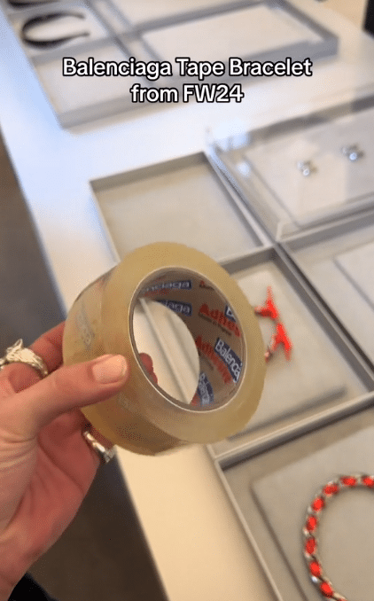 ฮือฮาไปทั่ววงการแฟชั่น เมื่อแบรนด์แฟชันระดับโลก บาลองเซียก้า (Balenciaga) เปิดตัวเครื่องประดับ หนึ่งในคอลเลกชันใหม่ Fall/Winter2024 กลางงาน Paris Fashion Week ที่จัดขึ้นเมื่อวันที่ 5 มีนาคม 2567 ที่ผ่านมา ซึ่งสินค้าสุดว้าวที่เอาทำตัวพ่อตัวแม่แฟชันทั้งโลกตะลึงก็คือ กำไลข้อมือ “Tape Bracelet” ที่ไม่ว่าจะดูยังไงก็ไม่ต่างจาก สก็อตเทปใส ที่หาซื้อได้ตามร้านเครื่องเขียนแถวบ้าน ราคาเริ่มต้นตั้งแต่ 20 บาทในยี่ห้อทั่ว ๆ ไป และราคาไม่ต่ำกว่า 50 – 80 บาท สำหรับสินค้าคุณภาพดี เหนียว-ติดแน่น