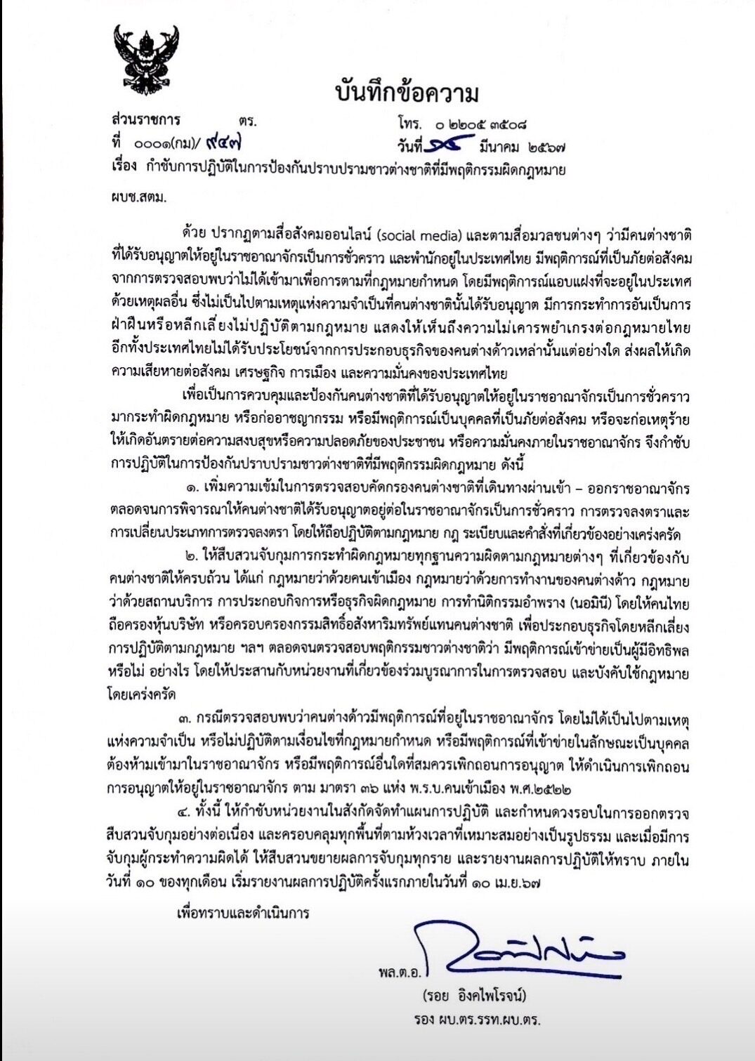 พล.ต.อ.รอย อิงคไพโรจน์ รอง ผบ.ตร. และ รรท.ผบ.ตร. เซ็นหนังสือลมนาม คำสั่งบันทึกข้อความส่วนราชการ ตร. เมื่อวันที่ 14 มีนาคม ที่ผ่านมา กำชับการปฏิบัติในการป้องกันปราบปรามชาวต่างชาติที่มีพฤติกรรมผิดกฎหมาย ถึง ผบช.สตม. โดยมีใจความระบุว่า ด้วย ปรากฏตามสื่อสังคมออนไลน์ (social media) และตามสื่อมวลชนต่างๆ ว่ามีคนต่างชาติที่ได้รับอนุญาตให้อยู่ในราชอาณาจักรเป็นการชั่วคราว และพำนักอยู่ในประเทศไทย มีพฤติการณ์ที่เป็นภัยต่อสังคม