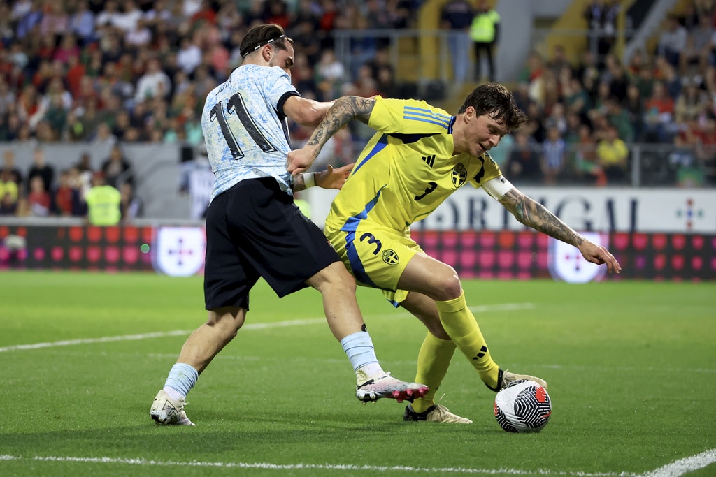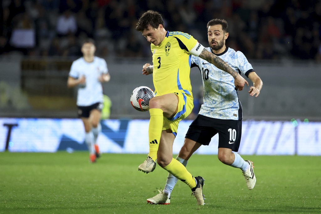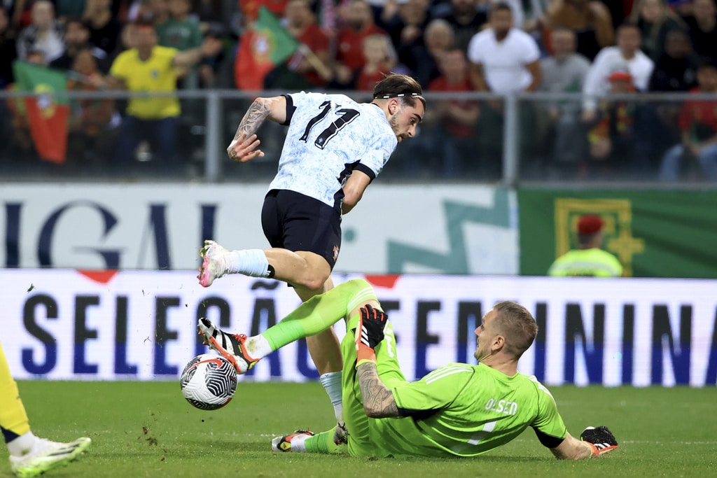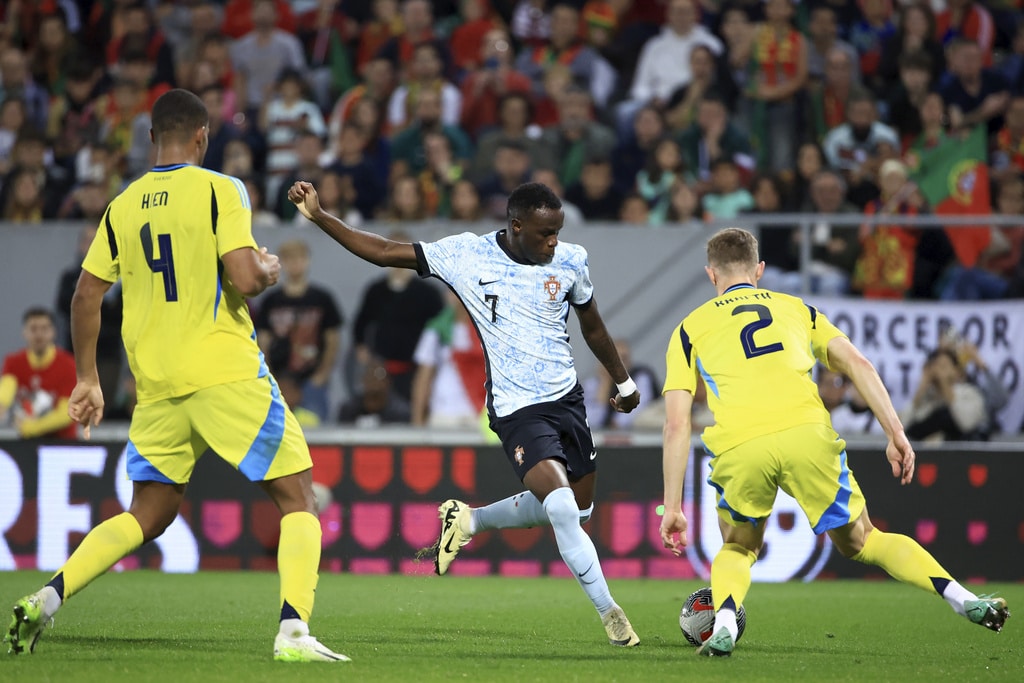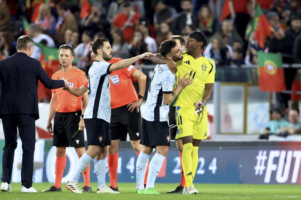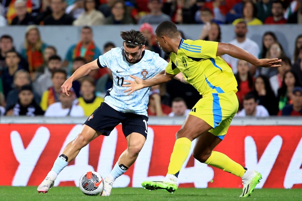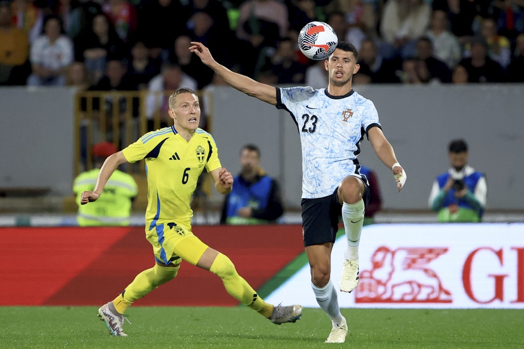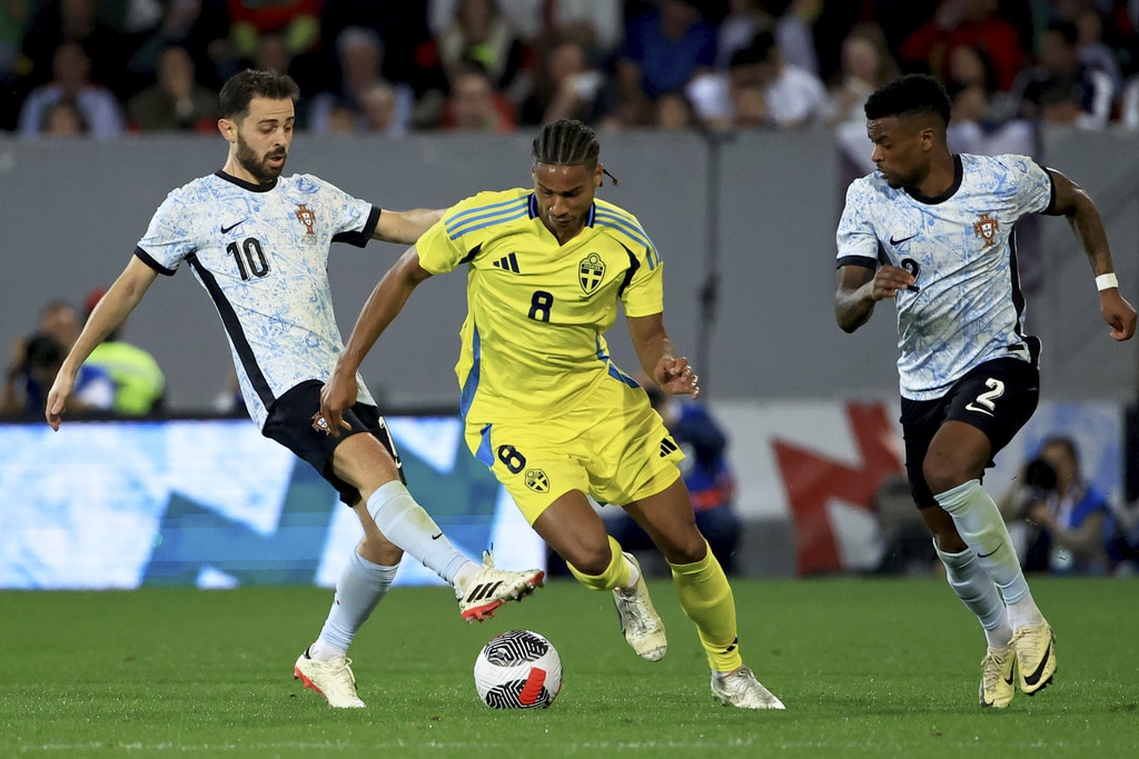 Portugal’s Rafael Leao, left, celebrates after scoring the opening goal during a friendly soccer match between Portugal and Sweden at the D. Afonso Henriques stadium in Guimaraes, Portugal, Thursday, March 21, 2024. (AP Photo/Luis Vieira)Sweden’s Viktor Gyokeres runs back to his side of the pitch after scoring his team’s first goal during a friendly soccer match between Portugal and Sweden at the D. Afonso Henriques stadium in Guimaraes, Portugal, Thursday, March 21, 2024. (AP Photo/Luis Vieira)Portugal’s Bruno Fernandes embraces Sweden’s Anthony Elanga at the end of a friendly soccer match between Portugal and Sweden at the D. Afonso Henriques stadium in Guimaraes, Portugal, Thursday, March 21, 2024. Portugal won 5-2. (AP Photo/Luis Vieira)Portugal’s Matheus Nunes controls the ball as Sweden’s Ludwig Augustinsson looks on during a friendly soccer match between Portugal and Sweden at the D. Afonso Henriques stadium in Guimaraes, Portugal, Thursday, March 21, 2024. (AP Photo/Luis Vieira)Portugal’s Bruma, center, takes a shot during a friendly soccer match between Portugal and Sweden at the D. Afonso Henriques stadium in Guimaraes, Portugal, Thursday, March 21, 2024. (AP Photo/Luis Vieira)Portugal’s Jota Silva vies for the ball with Sweden’s Victor Lindelof, right, during a friendly soccer match between Portugal and Sweden at the D. Afonso Henriques stadium in Guimaraes, Portugal, Thursday, March 21, 2024. (AP Photo/Luis Vieira)Portugal’s Jota Silva steps on the leg of Sweden goalkeeper Robin Olsen making a save during a friendly soccer match between Portugal and Sweden at the D. Afonso Henriques stadium in Guimaraes, Portugal, Thursday, March 21, 2024. (AP Photo/Luis Vieira)Sweden’s Victor Lindelof controls the ball in front of Portugal’s Bernardo Silva, right, during a friendly soccer match between Portugal and Sweden at the D. Afonso Henriques stadium in Guimaraes, Portugal, Thursday, March 21, 2024. (AP Photo/Luis Vieira)Portugal’s Jota Silva, left, tries to dribble the ball past Sweden’s Isak Hien during a friendly soccer match at the D. Afonso Henriques stadium in Guimaraes, Portugal, Thursday, March 21, 2024. (AP Photo/Luis Vieira)Portugal’s Bernardo Silva, left, vies for the ball with Sweden’s Jens Cajuste during a friendly soccer match between Portugal and Sweden at the D. Afonso Henriques stadium in Guimaraes, Portugal, Thursday, March 21, 2024. (AP Photo/Luis Vieira)