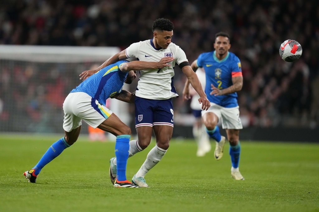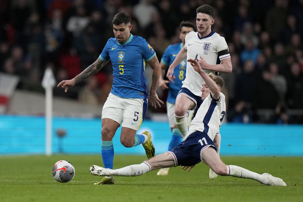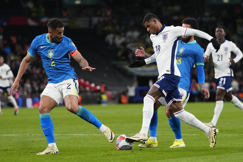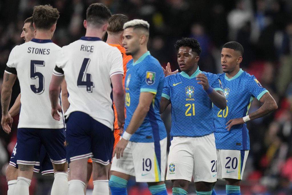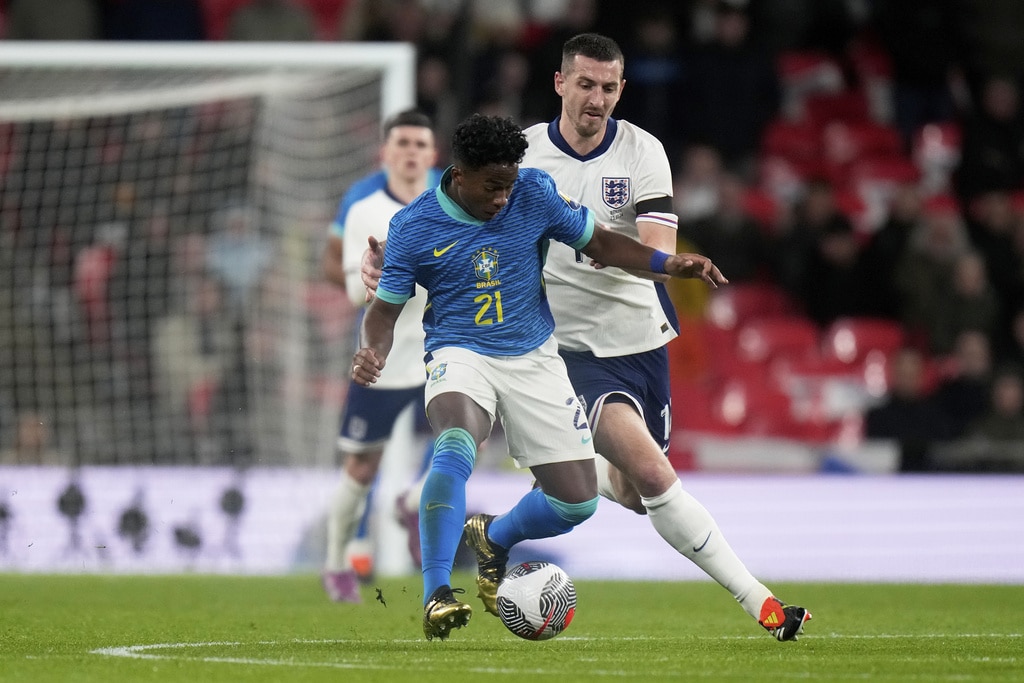 England’s Harry Maguire challenges for the ball with Brazils’ Lucas Paqueta during an international friendly soccer match between England and Brazil, at the Wembley Stadium in London, Saturday, March 23, 2024. (AP Photo/Kirsty Wigglesworth)Brazil’s Endrick, 2nd right, shakes hands with England goalkeeper Jordan Pickford, in the background, at the end of a friendly soccer match between England and Brazil at Wembley Stadium in London, Saturday, March 23, 2024. Kendrick scored the goal in Brazil’s 1-0 win. (AP Photo/Alastair Grant)England’s Lewis Dunk, right, vies for the ball with Brazil’s Endrick during a friendly soccer match between England and Brazil at Wembley Stadium in London, Saturday, March 23, 2024. (AP Photo/Alastair Grant)England’s Marcus Rashford challenges for the ball with Brazils’ Danilo during an international friendly soccer match between England and Brazil, at the Wembley Stadium in London, Saturday, March 23, 2024. (AP Photo/Kirsty Wigglesworth)Brazils’ Savio challenges for the ball with England’s Marcus Rashford during an international friendly soccer match between England and Brazil, at the Wembley Stadium in London, Saturday, March 23, 2024. (AP Photo/Kirsty Wigglesworth)Brazil’s Endrick celebrates after scoring the opening goal, while England goalkeeper Jordan Pickford reacts in the background, during a friendly soccer match between England and Brazil at Wembley Stadium in London, Saturday, March 23, 2024. (AP Photo/Alastair Grant)England’s Ollie Watkins challenges for the ball with Brazils’ Fabricio Bruno during an international friendly soccer match between England and Brazil, at the Wembley Stadium in London, Saturday, March 23, 2024. (AP Photo/Kirsty Wigglesworth)England’s Anthony Gordon tries to tackle Brazil’s Bruno Guimaraes, left, during a friendly soccer match between England and Brazil at Wembley Stadium in London, Saturday, March 23, 2024. (AP Photo/Alastair Grant)England’s Anthony Gordon tries to tackle Brazil’s Bruno Guimaraes, left, during a friendly soccer match between England and Brazil at Wembley Stadium in London, Saturday, March 23, 2024. (AP Photo/Alastair Grant)England’s Ollie Watkins challenges for the ball with Brazils’ Fabricio Bruno during an international friendly soccer match between England and Brazil, at the Wembley Stadium in London, Saturday, March 23, 2024. (AP Photo/Kirsty Wigglesworth)