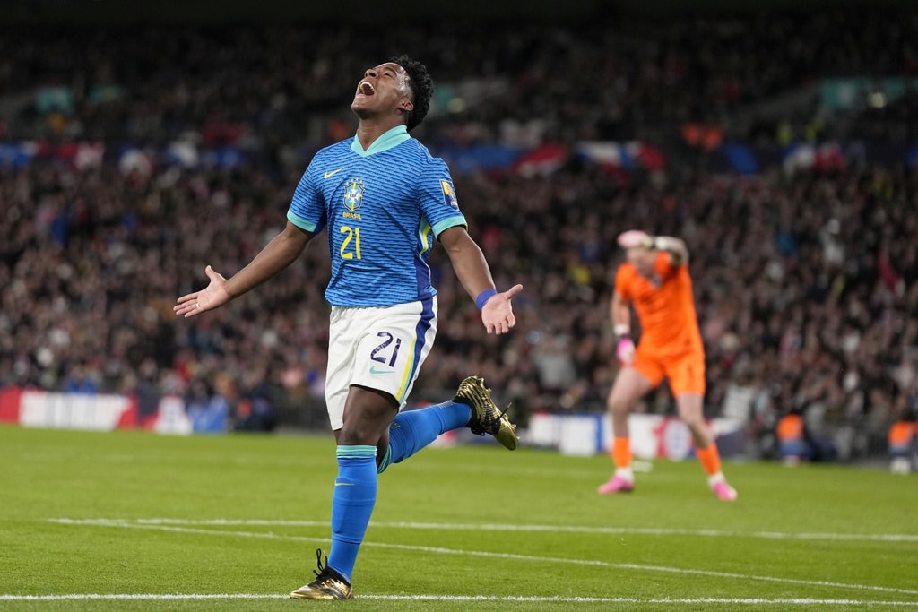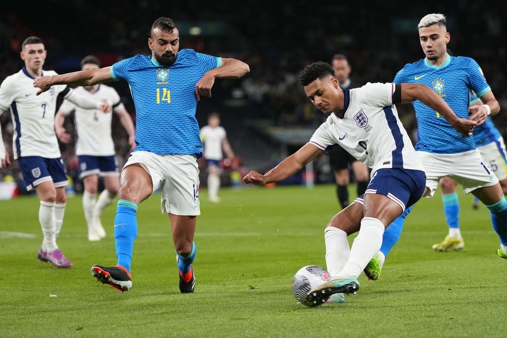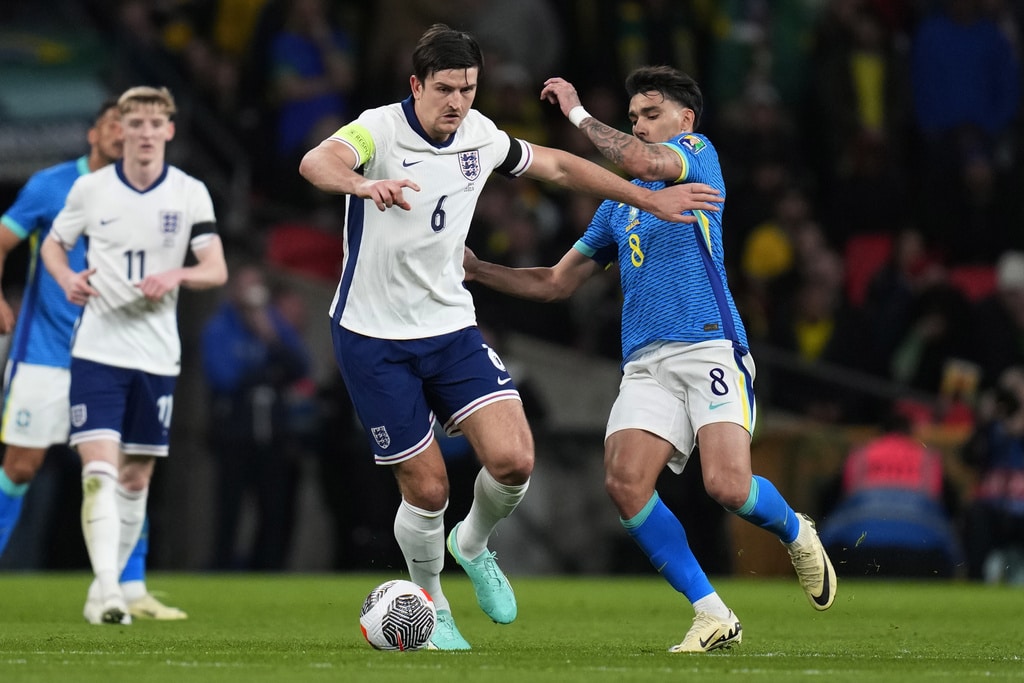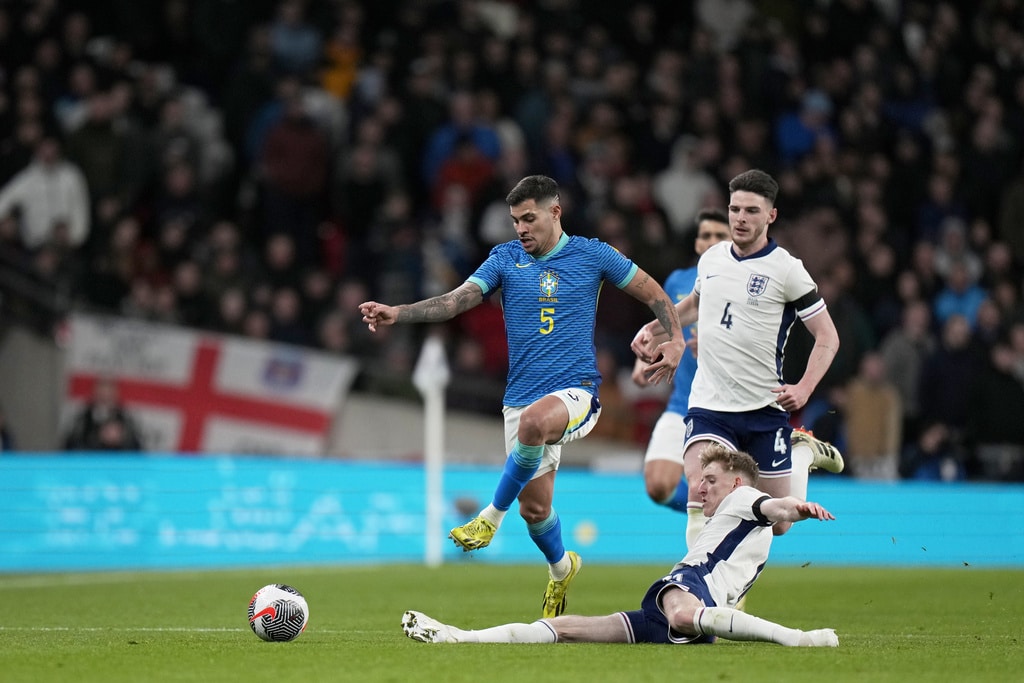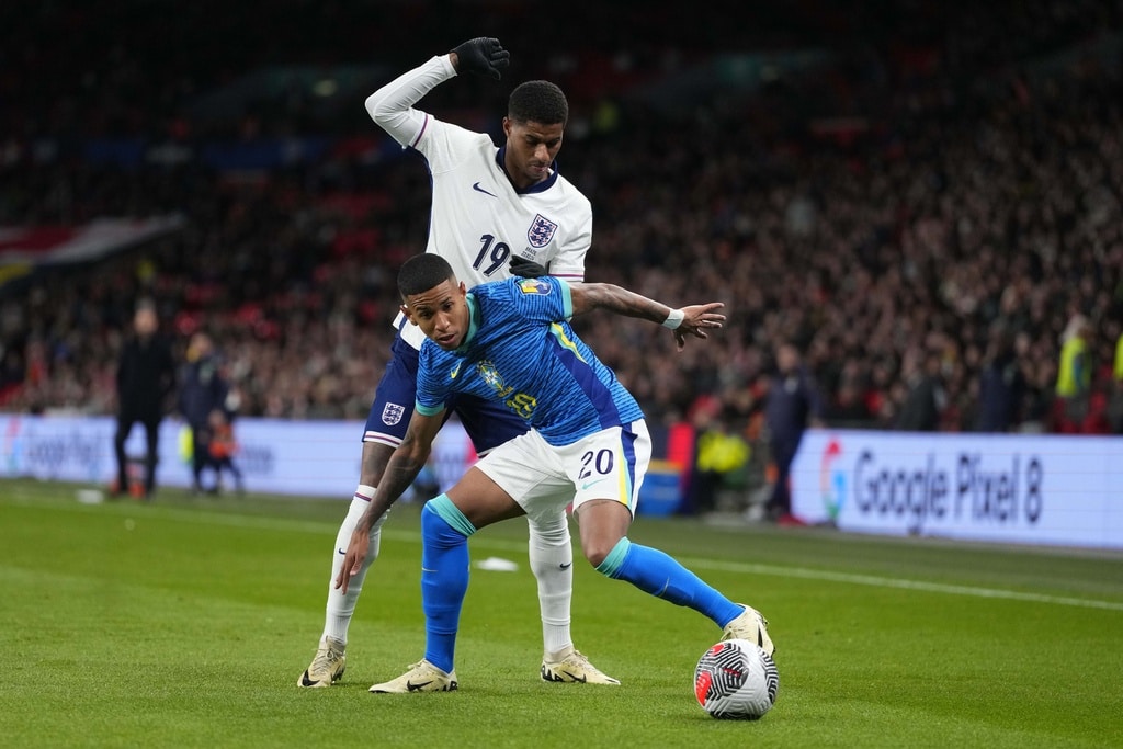 England’s Harry Maguire challenges for the ball with Brazils’ Lucas Paqueta during an international friendly soccer match between England and Brazil, at the Wembley Stadium in London, Saturday, March 23, 2024. (AP Photo/Kirsty Wigglesworth)Brazil’s Endrick, 2nd right, shakes hands with England goalkeeper Jordan Pickford, in the background, at the end of a friendly soccer match between England and Brazil at Wembley Stadium in London, Saturday, March 23, 2024. Kendrick scored the goal in Brazil’s 1-0 win. (AP Photo/Alastair Grant)England’s Lewis Dunk, right, vies for the ball with Brazil’s Endrick during a friendly soccer match between England and Brazil at Wembley Stadium in London, Saturday, March 23, 2024. (AP Photo/Alastair Grant)England’s Marcus Rashford challenges for the ball with Brazils’ Danilo during an international friendly soccer match between England and Brazil, at the Wembley Stadium in London, Saturday, March 23, 2024. (AP Photo/Kirsty Wigglesworth)Brazils’ Savio challenges for the ball with England’s Marcus Rashford during an international friendly soccer match between England and Brazil, at the Wembley Stadium in London, Saturday, March 23, 2024. (AP Photo/Kirsty Wigglesworth)Brazil’s Endrick celebrates after scoring the opening goal, while England goalkeeper Jordan Pickford reacts in the background, during a friendly soccer match between England and Brazil at Wembley Stadium in London, Saturday, March 23, 2024. (AP Photo/Alastair Grant)England’s Ollie Watkins challenges for the ball with Brazils’ Fabricio Bruno during an international friendly soccer match between England and Brazil, at the Wembley Stadium in London, Saturday, March 23, 2024. (AP Photo/Kirsty Wigglesworth)England’s Anthony Gordon tries to tackle Brazil’s Bruno Guimaraes, left, during a friendly soccer match between England and Brazil at Wembley Stadium in London, Saturday, March 23, 2024. (AP Photo/Alastair Grant)England’s Anthony Gordon tries to tackle Brazil’s Bruno Guimaraes, left, during a friendly soccer match between England and Brazil at Wembley Stadium in London, Saturday, March 23, 2024. (AP Photo/Alastair Grant)England’s Ollie Watkins challenges for the ball with Brazils’ Fabricio Bruno during an international friendly soccer match between England and Brazil, at the Wembley Stadium in London, Saturday, March 23, 2024. (AP Photo/Kirsty Wigglesworth)