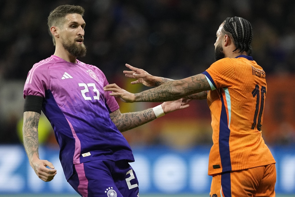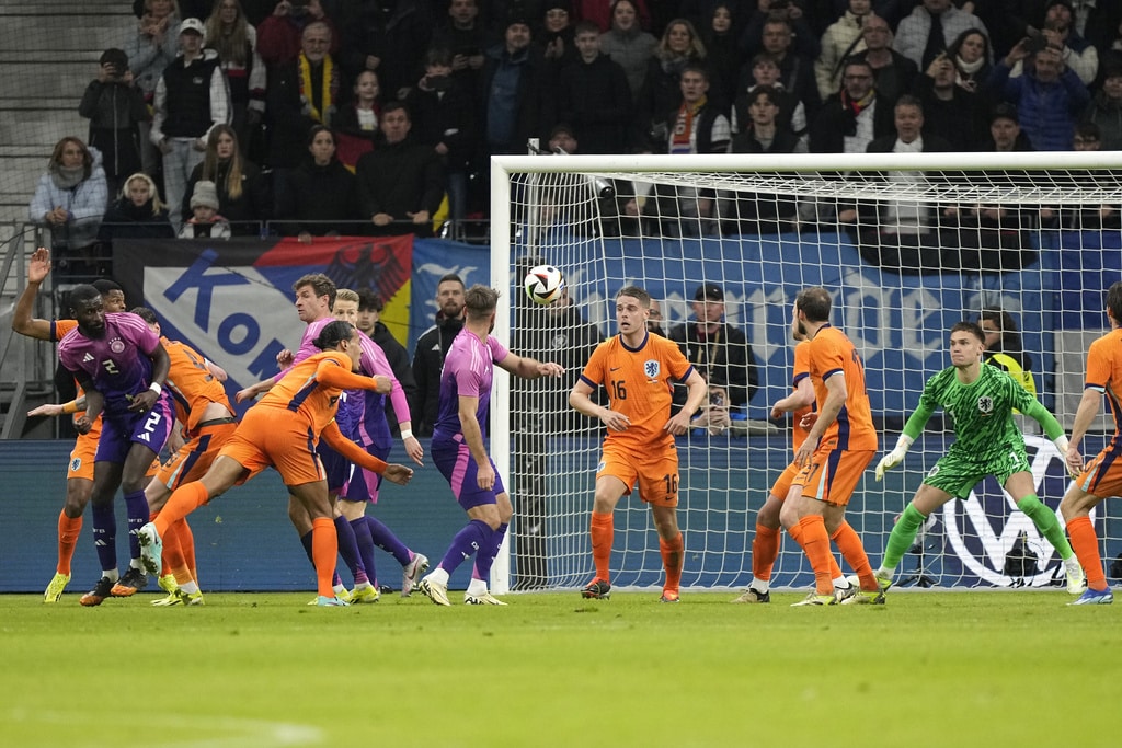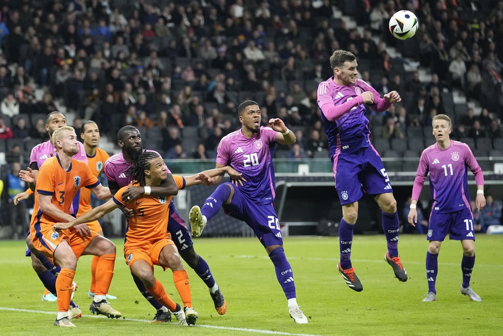 Netherlands’ Matthijs de Ligt, center, challenges Germany’s Florian Wirtz during the international friendly soccer match between Germany and Netherlands at the Deutsche Bank Park in Frankfurt, Germany on Tuesday, March 26, 2024. (AP Photo/Martin Meissner)Germany’s Thomas Mueller, left, celebrates after Niclas Fuellkrug, center, scored the winning goal during the international friendly soccer match between Germany and The Netherlands in Frankfurt, Germany, Tuesday, March 26, 2024. (AP Photo/Martin Meissner)Germany’s Pascal Gross, 2nd right, leaps up for a header during the international friendly soccer match between Germany and Netherlands at the Deutsche Bank Park in Frankfurt, Germany on Tuesday, March 26, 2024. (AP Photo/Martin Meissner)Germany’s goalkeeper Marc-Andre ter Stegen, left, hugs Germany’s Antonio Rudiger after the international friendly soccer match between Germany and Netherlands at the Deutsche Bank Park in Frankfurt, Germany on Tuesday, March 26, 2024. (AP Photo/Martin Meissner)Netherlands’ Matthijs de Ligt, right, challenges Germany’s Chris Führich during the international friendly soccer match between Germany and Netherlands at the Deutsche Bank Park in Frankfurt, Germany on Tuesday, March 26, 2024. (AP Photo/Martin Meissner)Germany’s Niclas Fullkrug, center, scores his sides second goal during the international friendly soccer match between Germany and Netherlands at the Deutsche Bank Park in Frankfurt, Germany on Tuesday, March 26, 2024. (AP Photo/Martin Meissner)Germany’s Pascal Gross, left, and Germany’s Benjamin Henrichs, right, challenge Netherlands’ Cody Gakpo during the international friendly soccer match between Germany and Netherlands at the Deutsche Bank Park in Frankfurt, Germany on Tuesday, March 26, 2024. (AP Photo/Martin Meissner)Germany’s Pascal Gross, left, and Germany’s Benjamin Henrichs, right, challenge Netherlands’ Cody Gakpo during the international friendly soccer match between Germany and Netherlands at the Deutsche Bank Park in Frankfurt, Germany on Tuesday, March 26, 2024. (AP Photo/Martin Meissner)Germany’s Jamal Musiala, right, challenges Netherlands’ Cody Gakpo during the international friendly soccer match between Germany and Netherlands at the Deutsche Bank Park in Frankfurt, Germany on Tuesday, March 26, 2024. (AP Photo/Martin Meissner)Netherlands’ Memphis Depay, right, pushes Germany’s Robert Andrich during the international friendly soccer match between Germany and Netherlands at the Deutsche Bank Park in Frankfurt, Germany on Tuesday, March 26, 2024. (AP Photo/Martin Meissner)