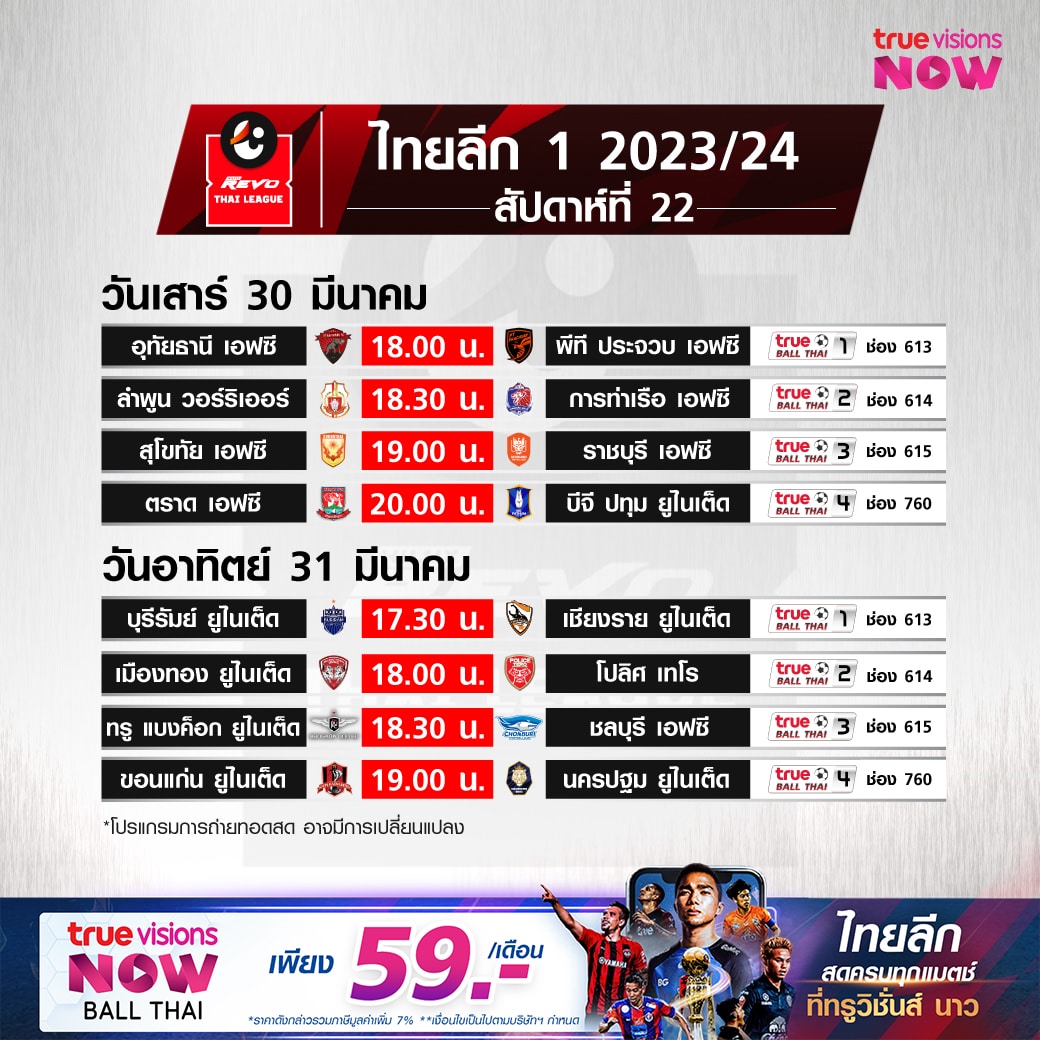 ตารางแข่งขัน รีโว่ 2023/24 ไทยลีก โปรแกรมฟุตบอลไทยลีก สัปดาห์ที่ 22 ทุกคู่ถ่ายทอดสดทาง AIS Play และ True Ball Thai