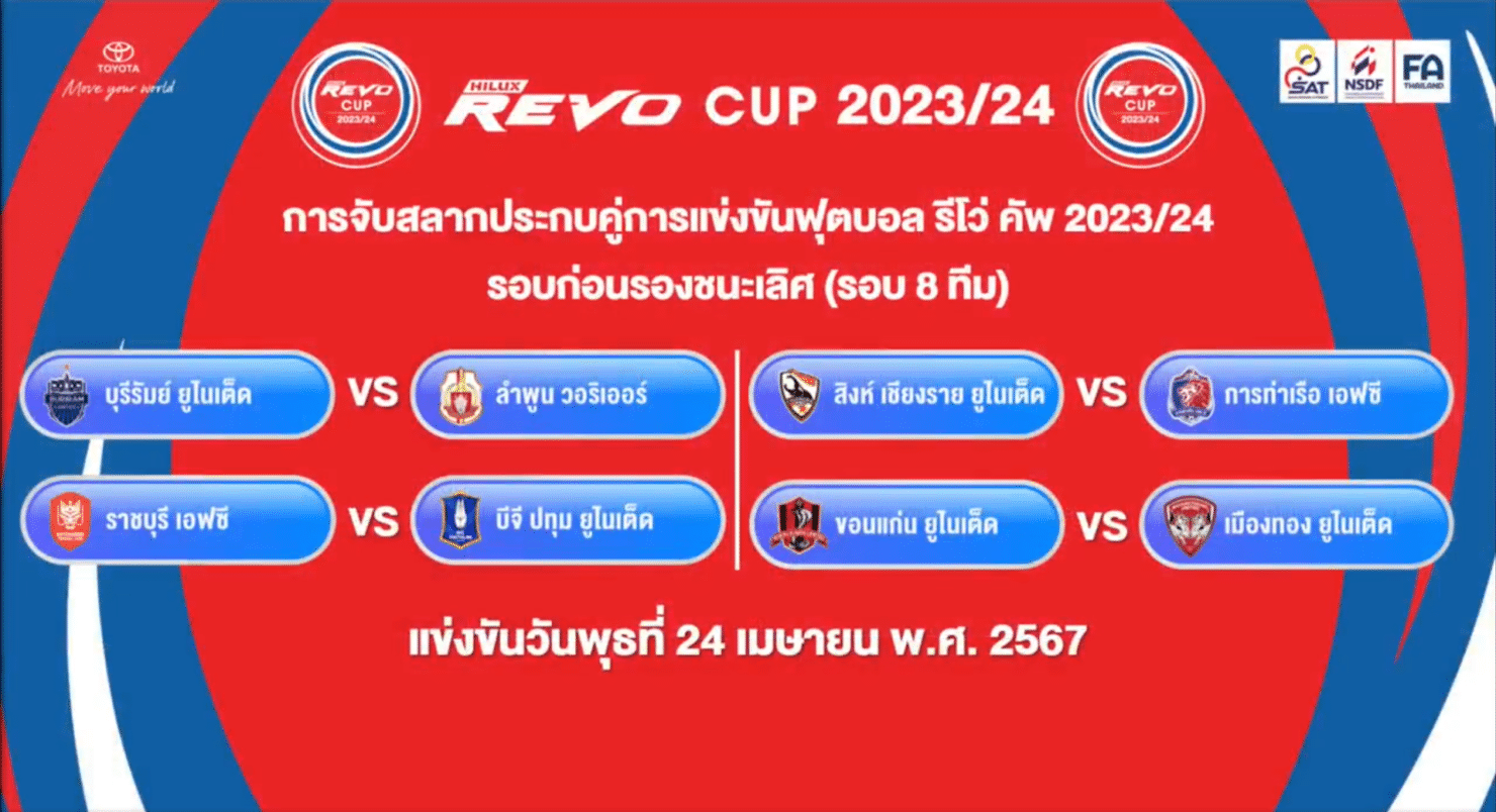 สรุปผลการจับสลากรอบ 8 ทีมสุดท้าย รีโว่ คัพ 2023/24 ออกมาเป็นที่เรียบร้อยแล้ว เชียงราย เจอ การท่าเรือ ราชบุรี ดวล บีจี ปทุม ส่วนแชมป์เก่า บุรีรัมย์ งานสบาย