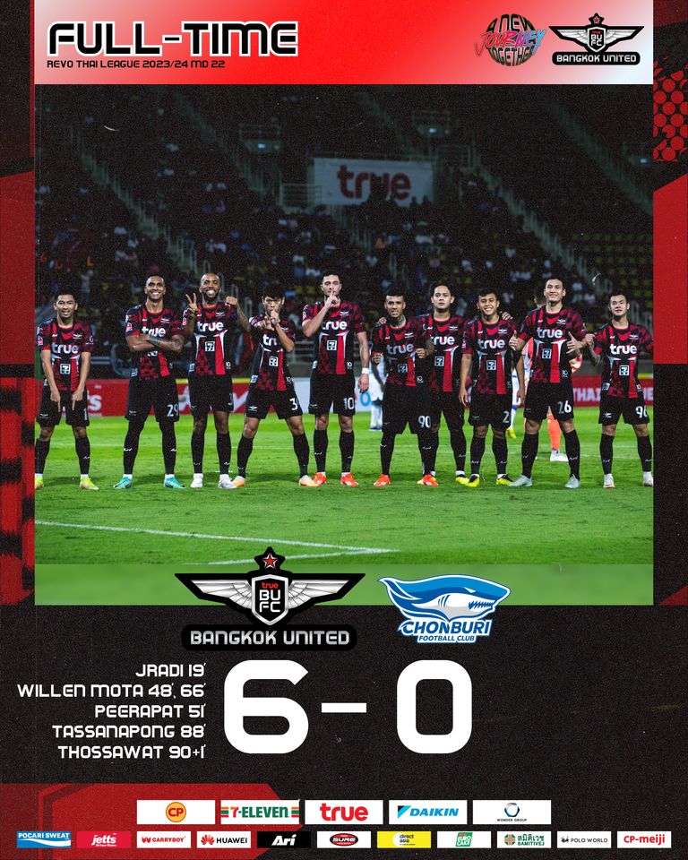 ผลบอลล่าสุด ฟุตบอล รีโว่ ไทยลีก 2023/24 แบงค็อก ยูไนเต็ด 6-0 ชลบุรี เอฟซี นัดที่ 22 ของฤดูกาล : แบงค็อก ยูไนเต็ด เปิดบ้านถล่มยับ ชลบุรี เอฟซี ในศึกไทยลีกเมื่อวันอาทิตย์ที่ผ่านมา