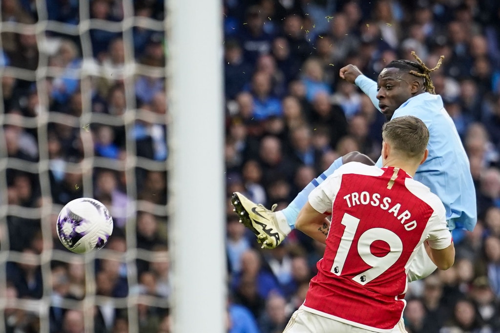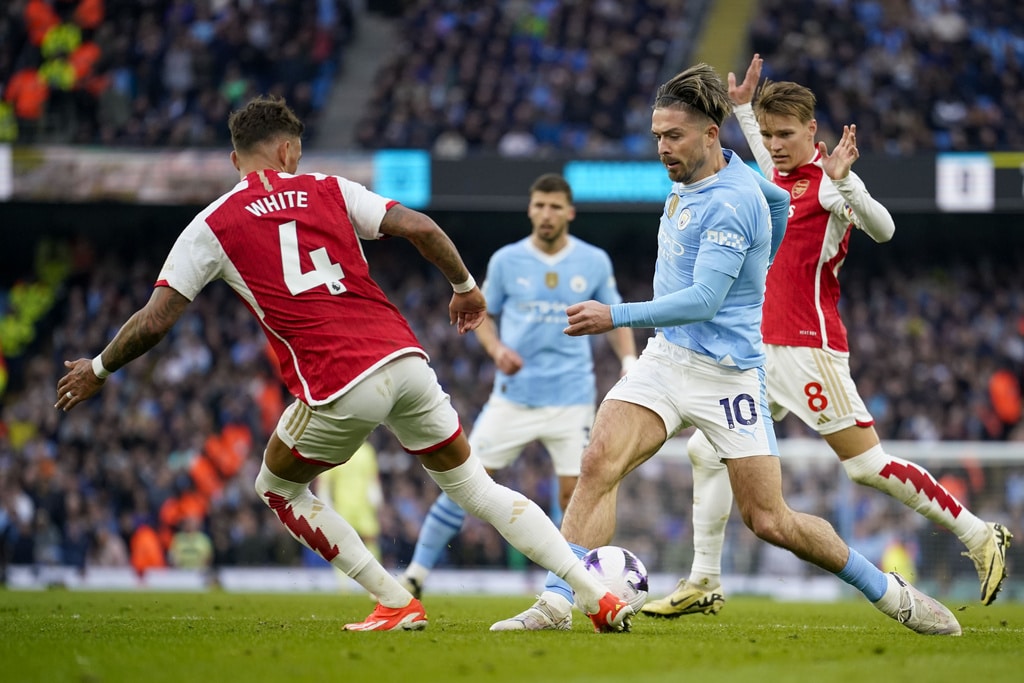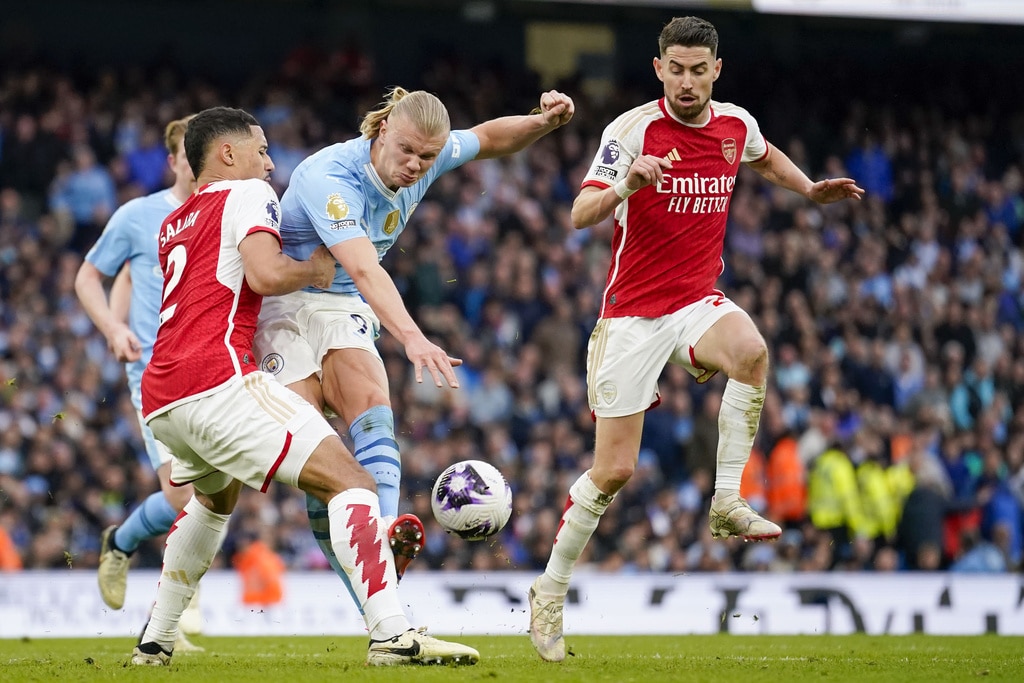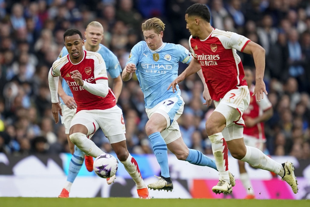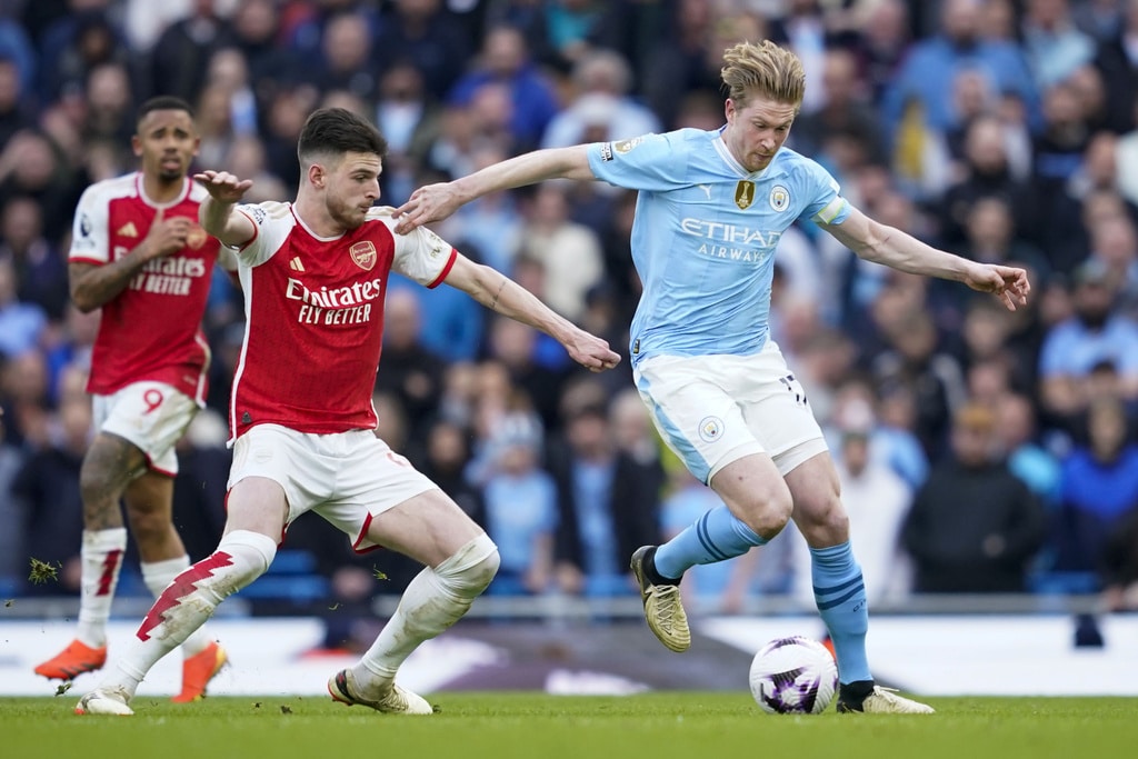Manchester City’s Kevin De Bruyne, right, duels for the ball with Arsenal’s Declan Rice during the English Premier League soccer match between Manchester City and Arsenal at the Etihad stadium in Manchester, England, Sunday, March 31, 2024. (AP Photo/Dave Thompson)Manchester City’s head coach Pep Guardiola, right, speaks with Manchester City’s Jack Grealish at the end of the English Premier League soccer match between Manchester City and Arsenal at the Etihad stadium in Manchester, England, Sunday, March 31, 2024. (AP Photo/Dave Thompson)Manchester City’s Jeremy Doku, top, duels for the ball with Arsenal’s Leandro Trossard during the English Premier League soccer match between Manchester City and Arsenal at the Etihad stadium in Manchester, England, Sunday, March 31, 2024. (AP Photo/Dave Thompson)Manchester City’s Jack Grealish, right, duels for the ball with Arsenal’s Ben White during the English Premier League soccer match between Manchester City and Arsenal at the Etihad stadium in Manchester, England, Sunday, March 31, 2024. (AP Photo/Dave Thompson)Arsenal’s Bukayo Saka, left, duels for the ball with Manchester City’s Kevin De Bruyne during the English Premier League soccer match between Manchester City and Arsenal at the Etihad stadium in Manchester, England, Sunday, March 31, 2024. (AP Photo/Dave Thompson)Arsenal’s William Saliba, left, tries to block a shot from Manchester City’s Erling Haaland during the English Premier League soccer match between Manchester City and Arsenal at the Etihad stadium in Manchester, England, Sunday, March 31, 2024. (AP Photo/Dave Thompson)Manchester City’s Erling Haaland, center right, duels for the ball with Arsenal’s William Saliba during the English Premier League soccer match between Manchester City and Arsenal at the Etihad stadium in Manchester, England, Sunday, March 31, 2024. (AP Photo/Dave Thompson)Manchester City’s Kevin De Bruyne, center, duels for the ball with Arsenal’s Gabriel, left, and Arsenal’s William Saliba during the English Premier League soccer match between Manchester City and Arsenal at the Etihad stadium in Manchester, England, Sunday, March 31, 2024. (AP Photo/Dave Thompson)