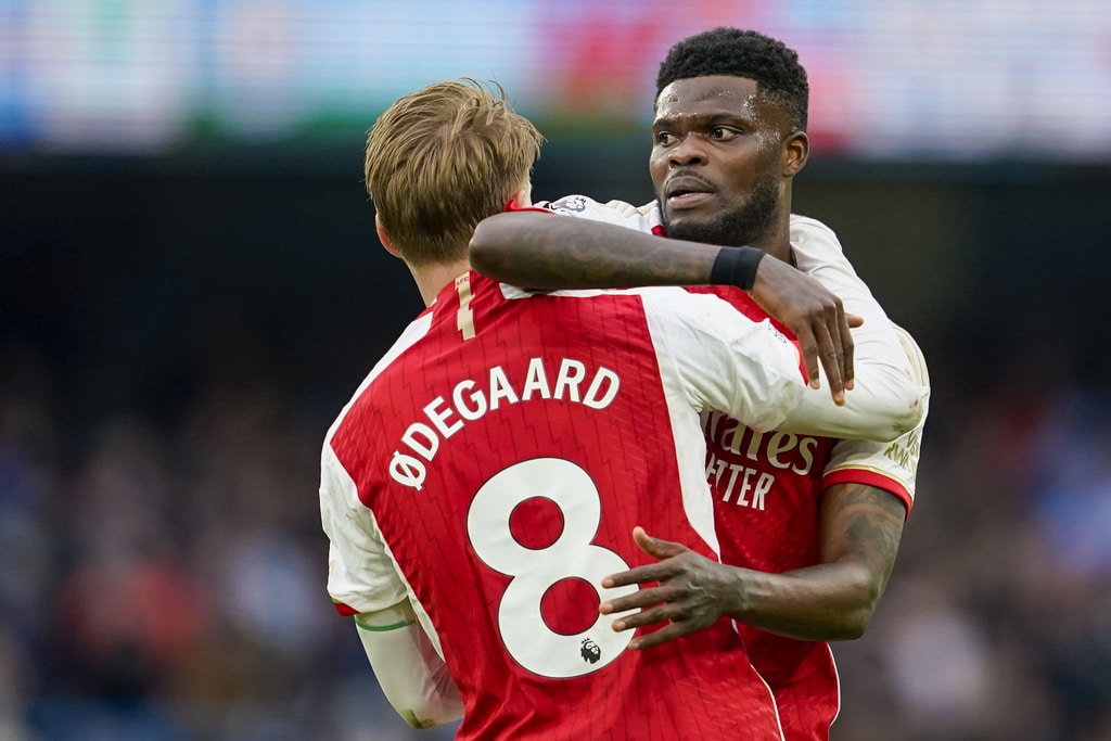 Arsenal’s Martin Odegaard, front, and Arsenal’s Thomas Partey react at the end of the English Premier League soccer match between Manchester City and Arsenal at the Etihad stadium in Manchester, England, Sunday, March 31, 2024. (AP Photo/Dave Thompson)