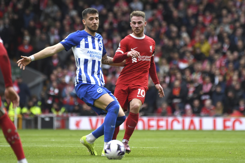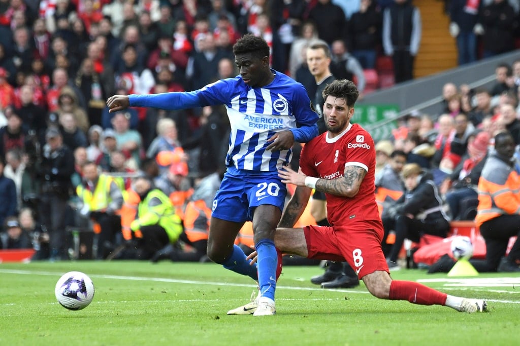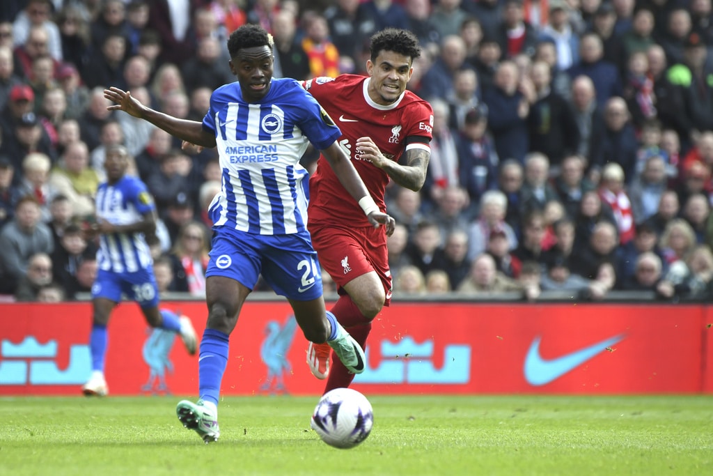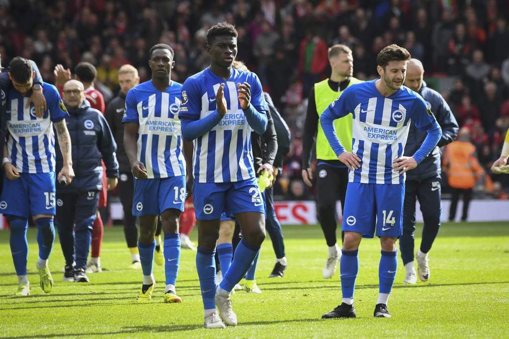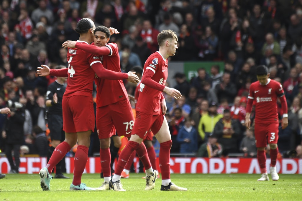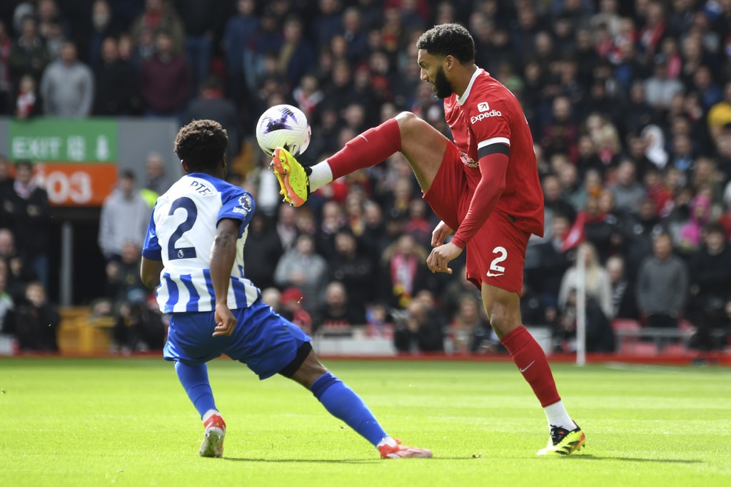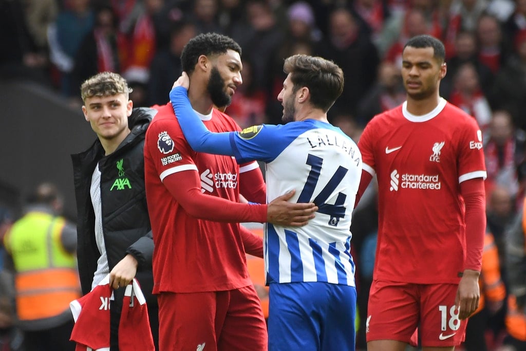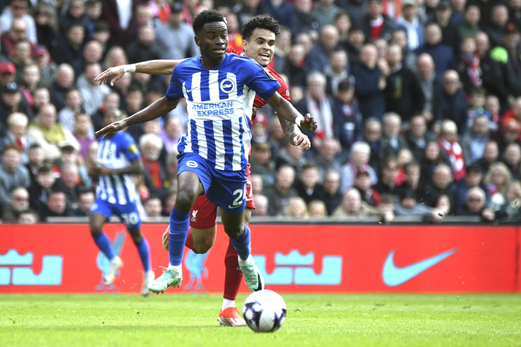 Liverpool’s Joe Gomez, right, challenges for the ball with Brighton’s Tariq Lamptey during the English Premier League soccer match between Liverpool and Brighton and Hove at Anfield Stadium in Liverpool, England, Sunday, March 31, 2024. (AP Photo/Rui Vieira)Liverpool’s Joe Gomez and Brighton’s Adam Lallana, second right, after the English Premier League soccer match between Liverpool and Brighton and Hove at Anfield Stadium in Liverpool, England, Sunday, March 31, 2024. (AP Photo/Rui Vieira)Brighton and Hove players react disappointed after the English Premier League soccer match between Liverpool and Brighton and Hove at Anfield Stadium in Liverpool, England, Sunday, March 31, 2024. (AP Photo/Rui Vieira)Liverpool’s Virgil van Dijk, left, and Liverpool’s Jarell Quansah celebrate their victory at the English Premier League soccer match between Liverpool and Brighton and Hove at Anfield Stadium in Liverpool, England, Sunday, March 31, 2024. (AP Photo/Rui Vieira)Brighton’s Carlos Baleba, left, challenges for the ball with Liverpool’s Dominik Szoboszlai during the English Premier League soccer match between Liverpool and Brighton and Hove at Anfield Stadium in Liverpool, England, Sunday, March 31, 2024. (AP Photo/Rui Vieira)Liverpool’s Alexis Mac Allister, right, challenges for the ball with Brighton’s Jakub Moder during the English Premier League soccer match between Liverpool and Brighton and Hove at Anfield Stadium in Liverpool, England, Sunday, March 31, 2024. (AP Photo/Rui Vieira)Brighton’s Simon Adingra, left, challenges for the ball with Liverpool’s Luis Diaz during the English Premier League soccer match between Liverpool and Brighton and Hove at Anfield Stadium in Liverpool, England, Sunday, March 31, 2024. (AP Photo/Rui Vieira)Brighton’s Simon Adingra, left, challenges for the ball with Liverpool’s Luis Diaz during the English Premier League soccer match between Liverpool and Brighton and Hove at Anfield Stadium in Liverpool, England, Sunday, March 31, 2024. (AP Photo/Rui Vieira)Liverpool’s Luis Diaz, right, celebrates after scoring his side’s opening goal during the English Premier League soccer match between Liverpool and Brighton and Hove at Anfield Stadium in Liverpool, England, Sunday, March 31, 2024. (AP Photo/Rui Vieira)