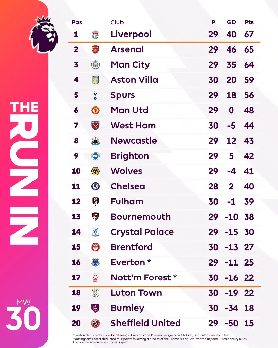 สรุปผลการแข่งขัน พรีเมียร์ลีก อังกฤษ 2023/24 หลังจบนัดที่ 30