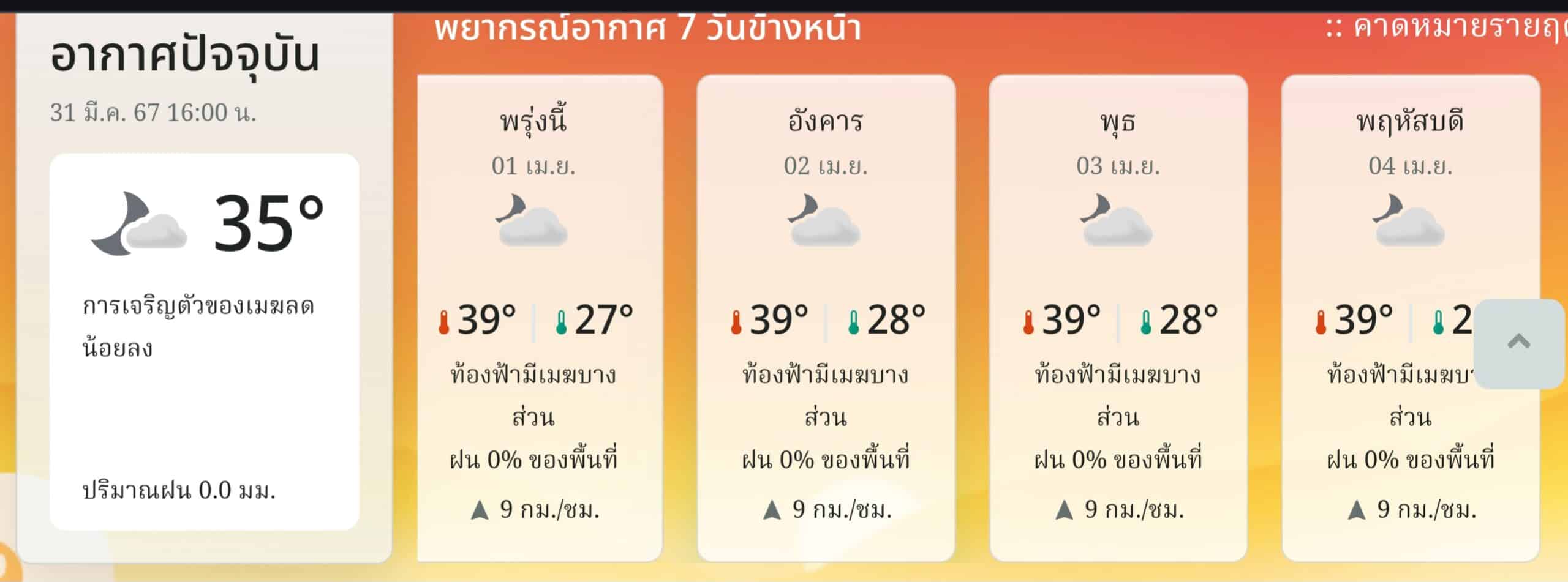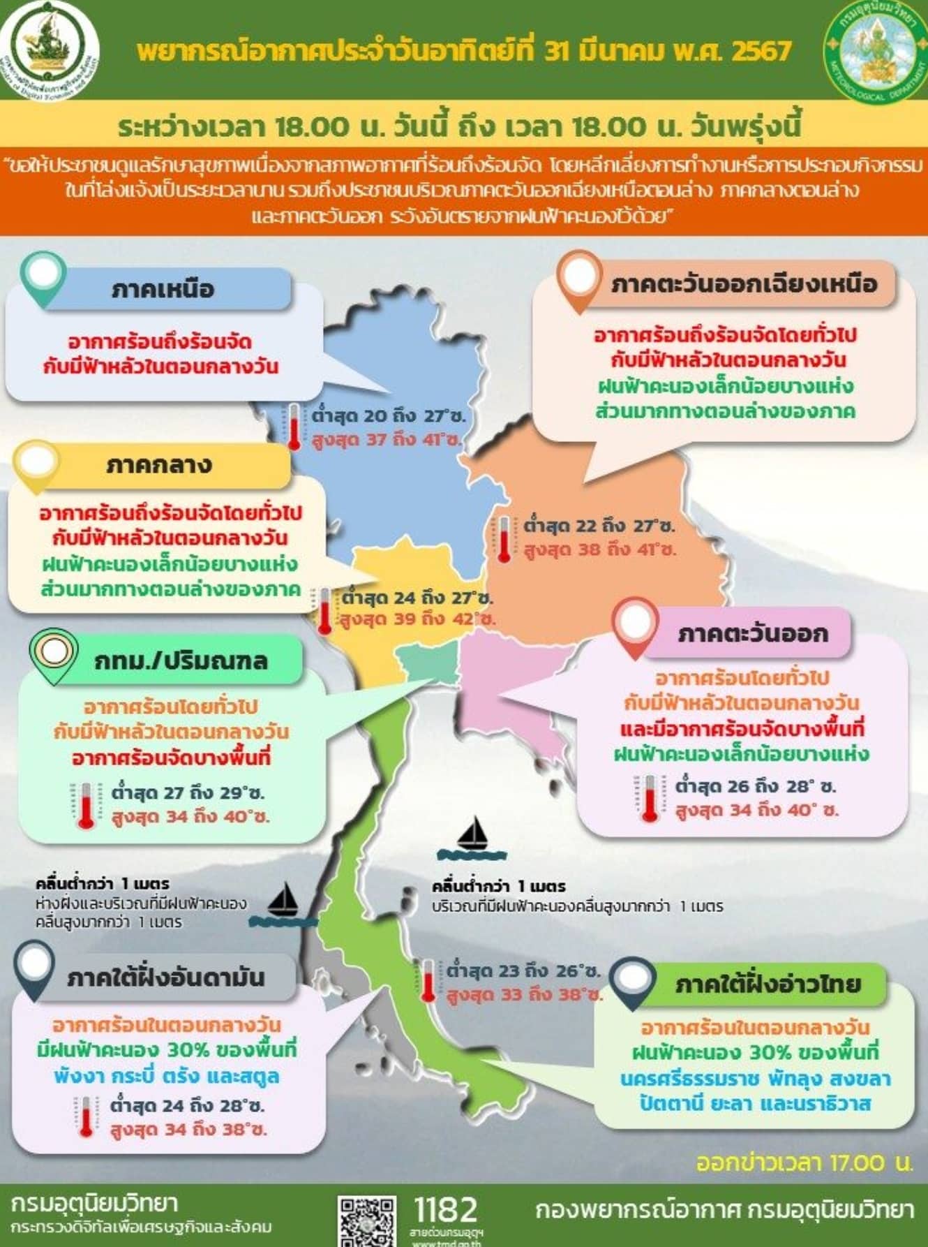 อุณหภูมิสูงสุด 37-41 องศาเซลเซียส ลมตะวันตกเฉียงใต้ ความเร็ว 5-15 กม./ชม.