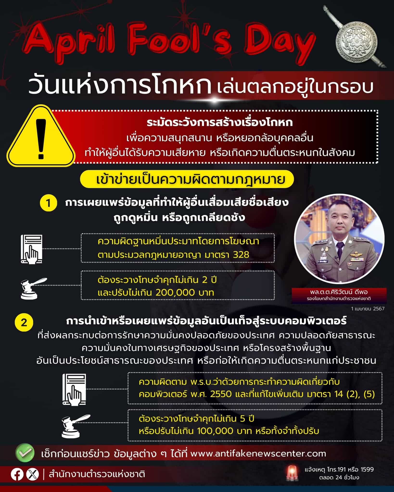สำนักงานตำรวจแห่งชาติเตือน เล่นมุก April Fool Day หรือ วันเมษาหน้าโง่ อาจผิดกฎหมายได้ ขอให้เล่นอย่างระมัดระวัง อย่าสร้างความแตกตื่น