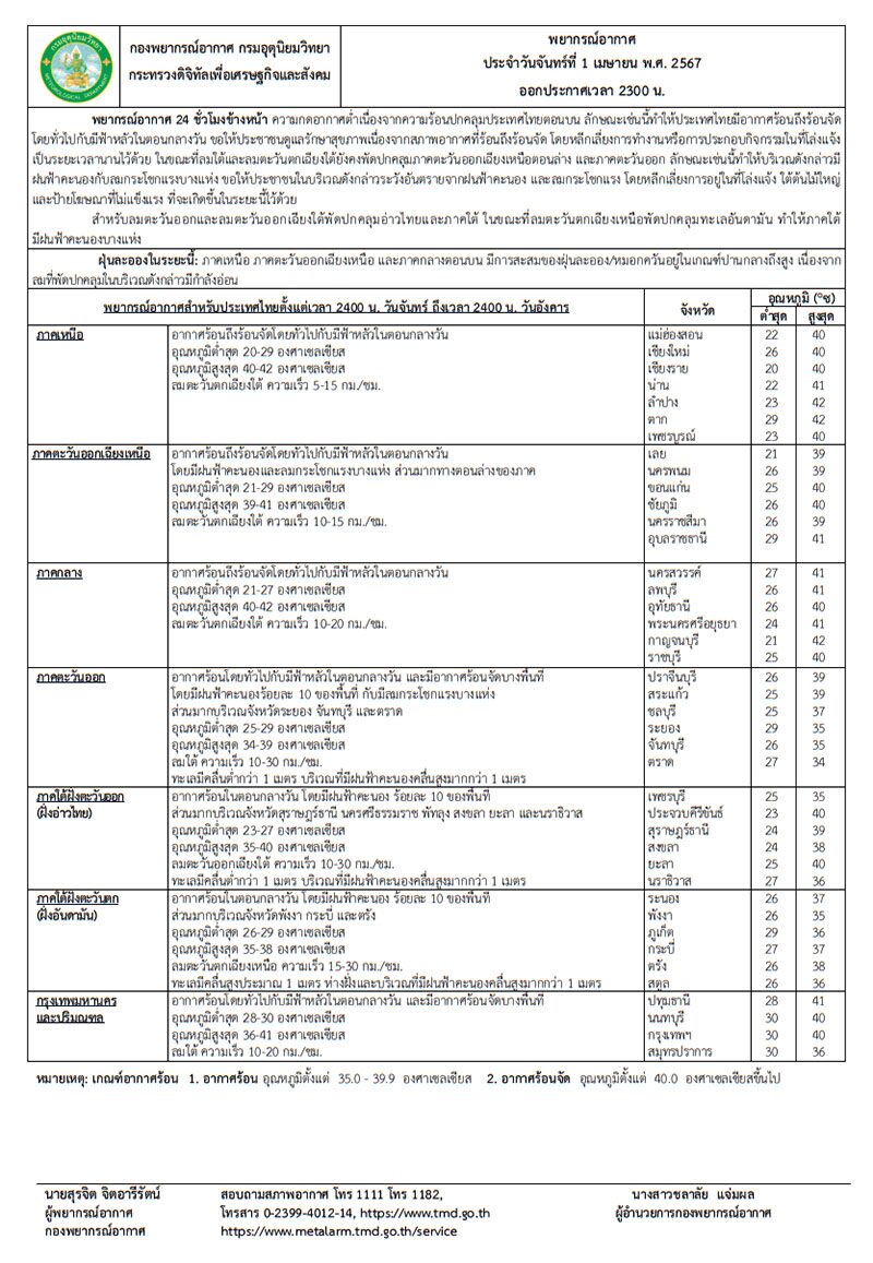 กรมอุตุนิยมวิทยา พยากรณ์อากาศ 24 ชั่วโมงข้างหน้า ความกดอากาศต่ำเนื่องจากความร้อนปกคลุมประเทศไทยตอนบน ลักษณะเช่นนี้ทำให้ประเทศไทยมีอากาศร้อนถึงร้อนจัด โดยทั่วไปกับมีฟ้าหลัวในตอนกลางวัน ขอให้ประชาชนดูแลรักษาสุขภาพเนื่องจากสภาพอากาศที่ร้อนถึงร้อนจัด โดยหลีกเลี่ยงการทำงานหรือการประกอบกิจกรรมในที่โล่งแจ้ง เป็นระยะเวลานานไว้ด้วย