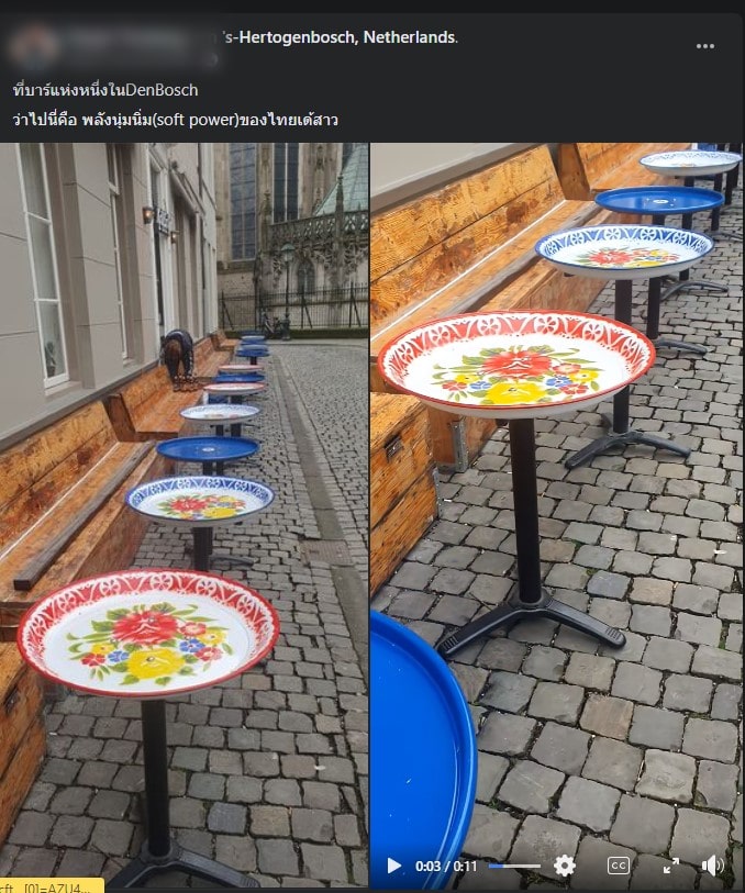 เมื่อวันเสาร์ที่ 30 มีนาคม 2567 ได้มีสาวไทยผู้อาศัยอยู่ในประเทศเนเธอแลนด์ เมืองเซร์โทเคนบอส (เดมโบส) ใช้ชื่อในบัญชีเฟซบุ๊กว่า Daojai Thudang โพสต์ภาพและคลิปบาร์แห่งหนึ่งในประเทศเนเธอร์แลนด์ ที่นำถาดเคลือบโบราณลายดอกไม้ของไทย มาประกอบกับขาตั้งกลายเป็นโต๊ะอาหารดินเนอร์หน้าร้านดีไซน์เก๋สุด ๆ