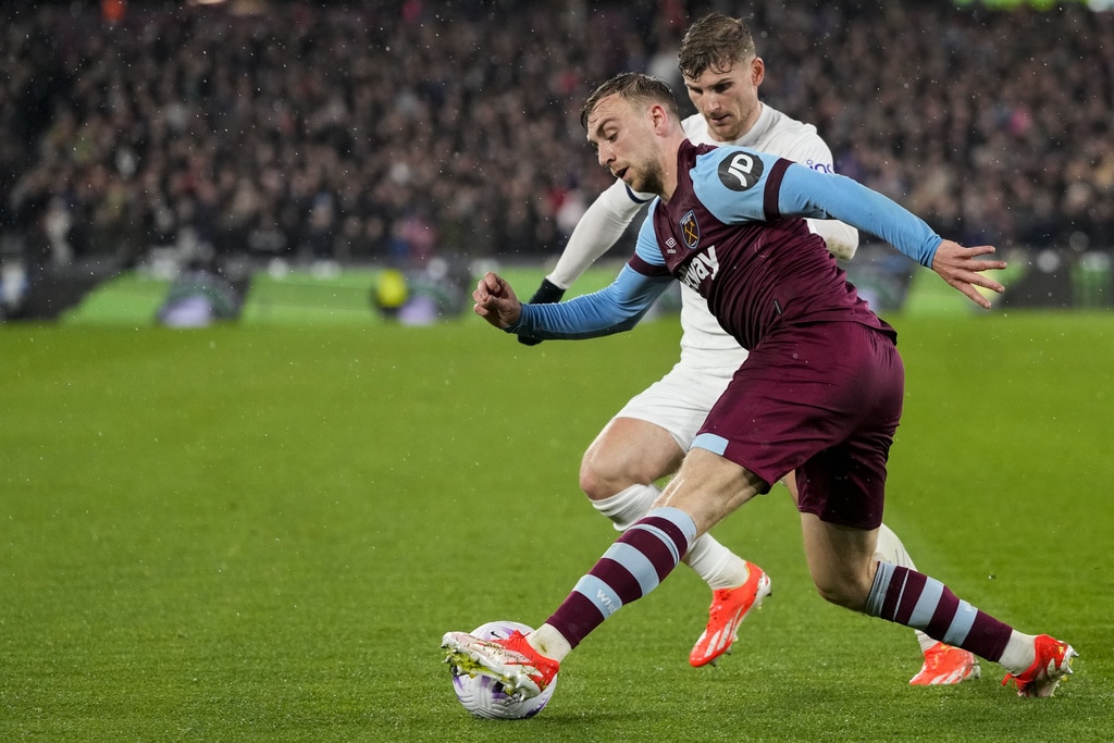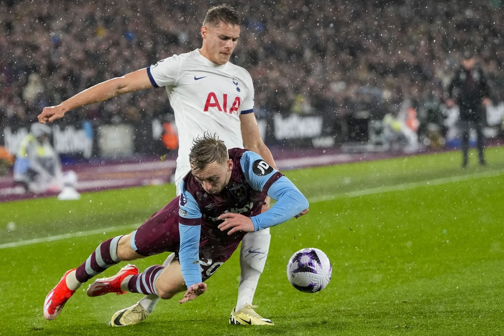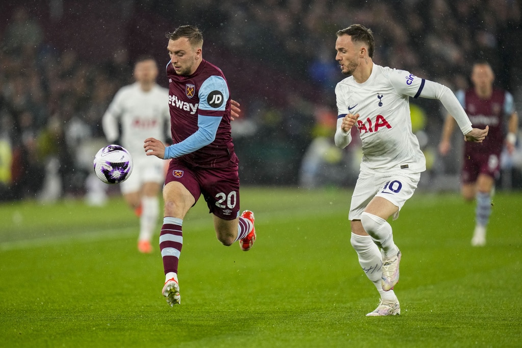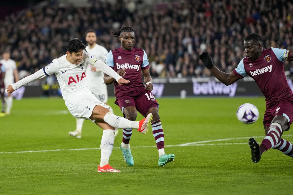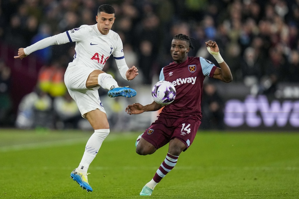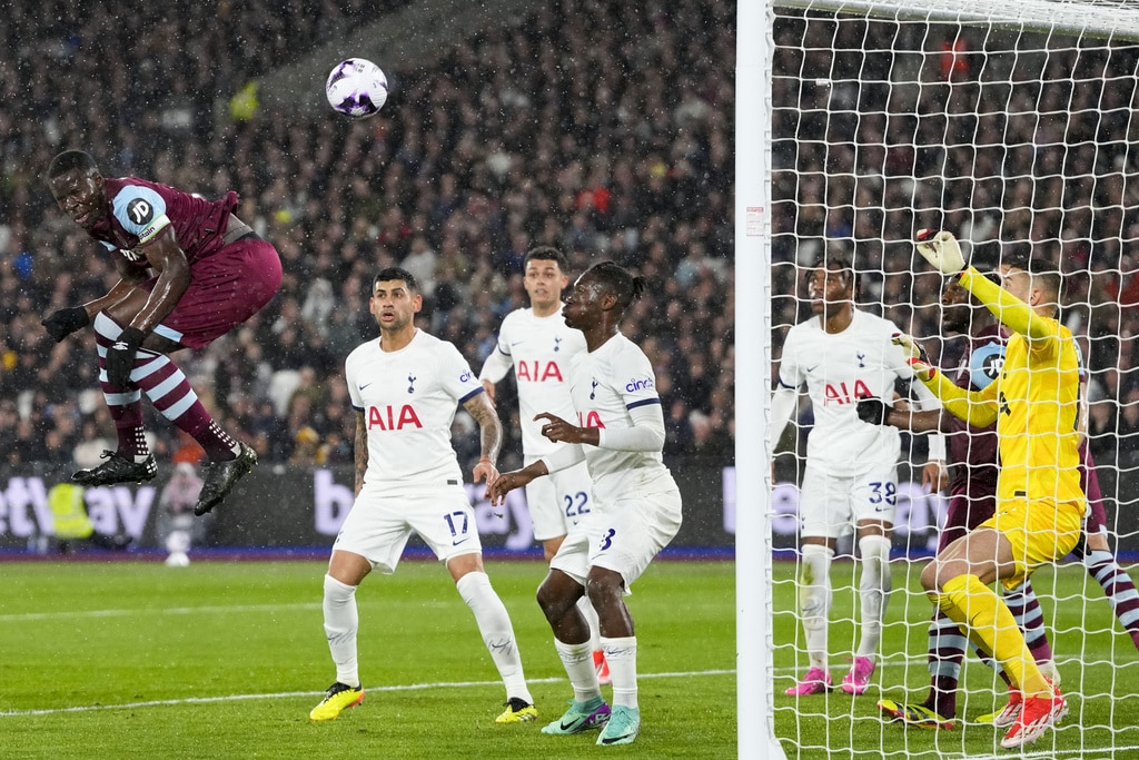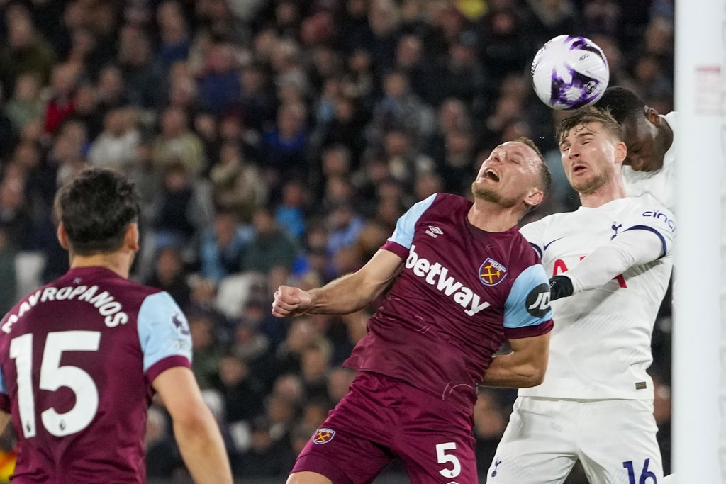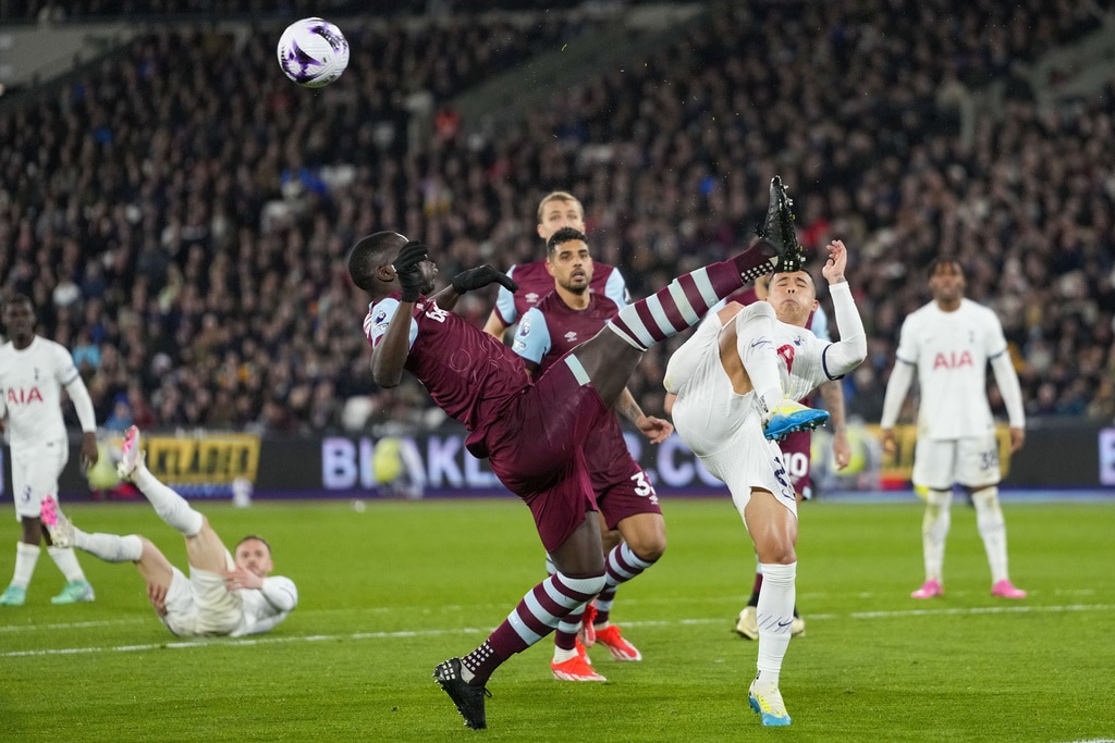 West Ham’s Jarrod Bowen, left, duels for the ball with Tottenham’s James Maddison during the English Premier League soccer match between West Ham and Tottenham, at the London stadium in London, Tuesday, April 2, 2024. (AP Photo/Kirsty Wigglesworth)Tottenham’s Timo Werner, right, jumps for the ball with West Ham’s Vladimir Coufal during the English Premier League soccer match between West Ham and Tottenham, at the London stadium in London, Tuesday, April 2, 2024. (AP Photo/Kirsty Wigglesworth)West Ham’s Kurt Zouma, right, tries to block a shot from Tottenham’s Son Heung-min during the English Premier League soccer match between West Ham and Tottenham, at the London stadium in London, Tuesday, April 2, 2024. (AP Photo/Kirsty Wigglesworth)West Ham’s Kurt Zouma, left, duels for the ball with Tottenham’s Pedro Porro during the English Premier League soccer match between West Ham and Tottenham, at the London stadium in London, Tuesday, April 2, 2024. (AP Photo/Kirsty Wigglesworth)Tottenham’s Pedro Porro, left, duels for the ball with West Ham’s Mohammed Kudus during the English Premier League soccer match between West Ham and Tottenham, at the London stadium in London, Tuesday, April 2, 2024. (AP Photo/Kirsty Wigglesworth)West Ham’s Jarrod Bowen, front, duels for the ball with Tottenham’s Timo Werner during the English Premier League soccer match between West Ham and Tottenham, at the London stadium in London, Tuesday, April 2, 2024. (AP Photo/Kirsty Wigglesworth)West Ham’s Jarrod Bowen, front, duels for the ball with Tottenham’s Micky van de Ven during the English Premier League soccer match between West Ham and Tottenham, at the London stadium in London, Tuesday, April 2, 2024. (AP Photo/Kirsty Wigglesworth)West Ham’s Kurt Zouma, right, celebrates with West Ham’s Jarrod Bowen after scoring his side’s opening goal during the English Premier League soccer match between West Ham and Tottenham, at the London stadium in London, Tuesday, April 2, 2024. (AP Photo/Kirsty Wigglesworth)West Ham’s Kurt Zouma, left, scores his side’s opening goal during the English Premier League soccer match between West Ham and Tottenham, at the London stadium in London, Tuesday, April 2, 2024. (AP Photo/Kirsty Wigglesworth)West Ham’s Michail Antonio, left, duels for the ball with Tottenham’s Son Heung-min during the English Premier League soccer match between West Ham and Tottenham, at the London stadium in London, Tuesday, April 2, 2024. (AP Photo/Kirsty Wigglesworth)