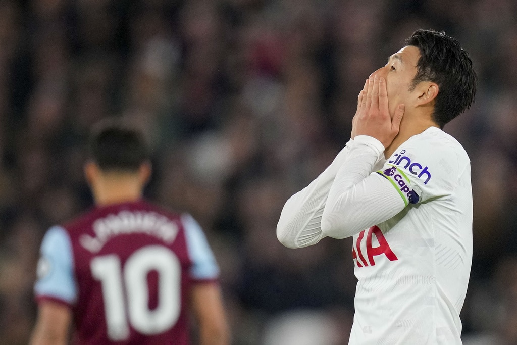 Tottenham’s Son Heung-min reacts after missing a chance to score during the English Premier League soccer match between West Ham and Tottenham, at the London stadium in London, Tuesday, April 2, 2024. (AP Photo/Kirsty Wigglesworth)