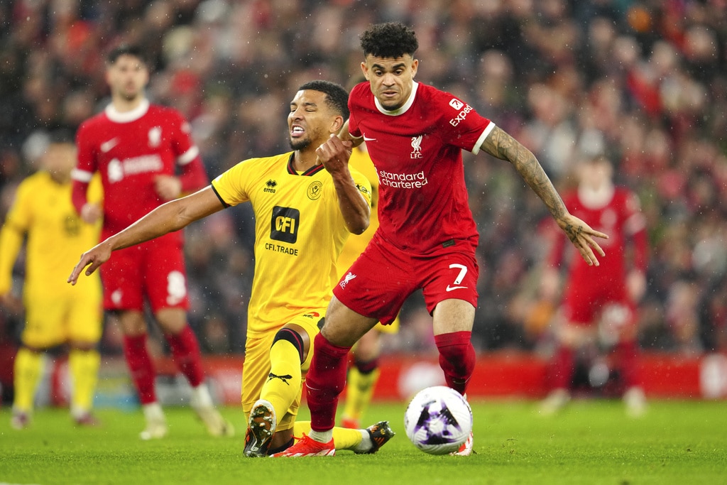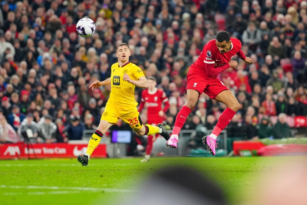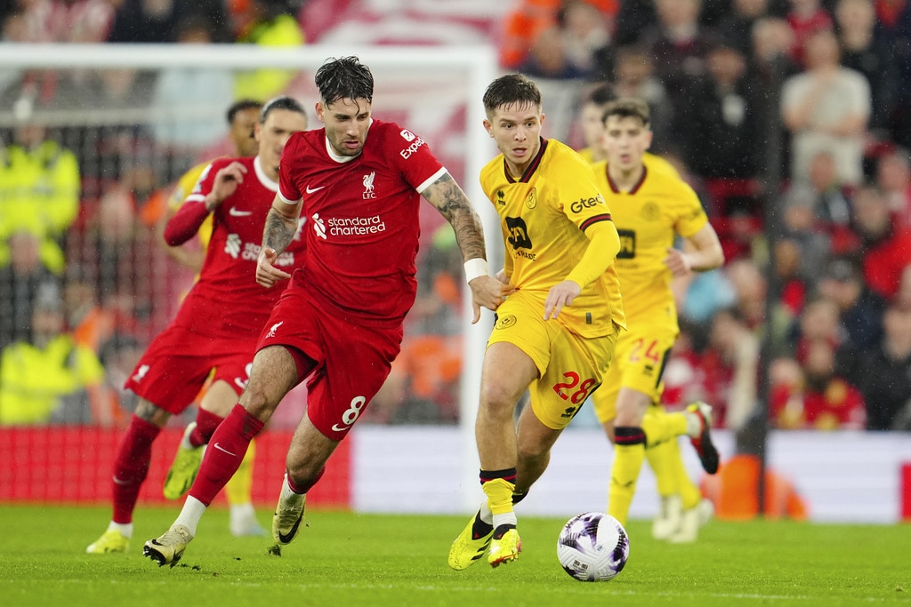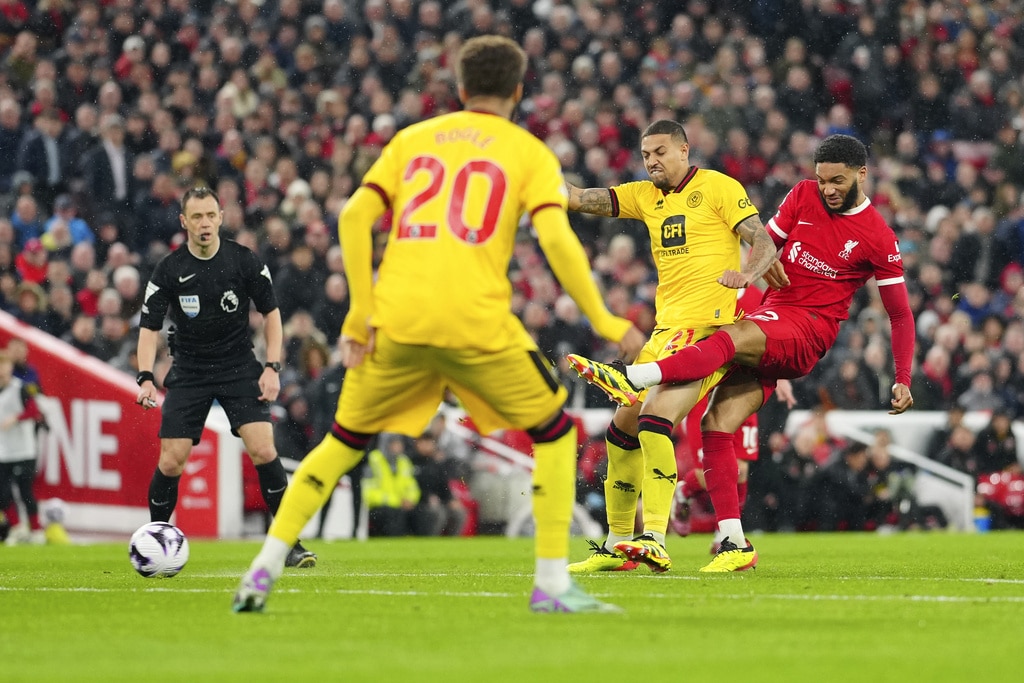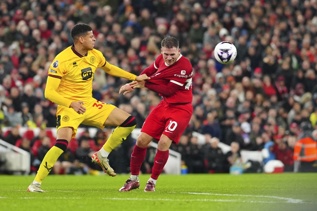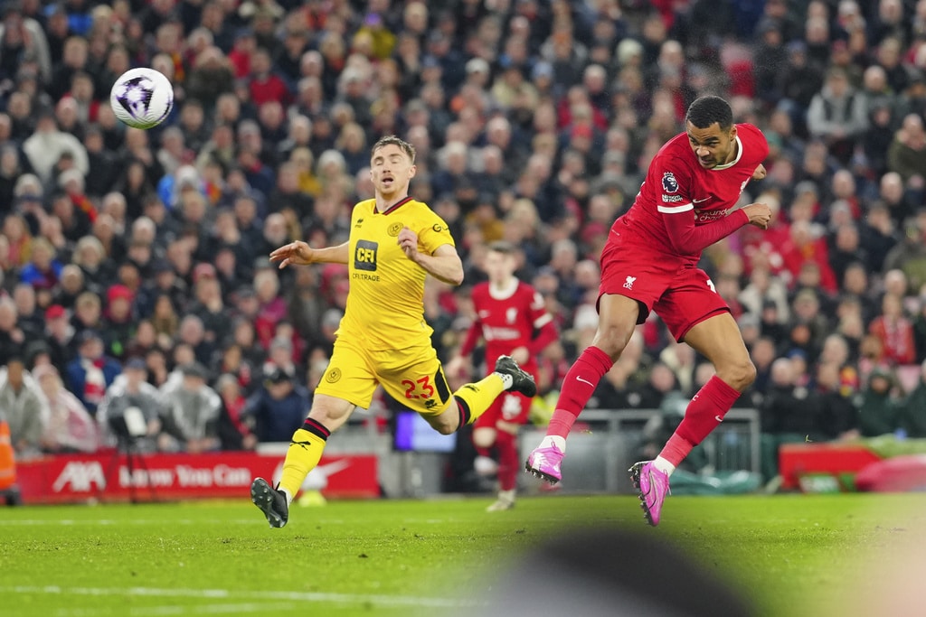Liverpool’s Conor Bradley, left, challenges for the ball with Sheffield United’s Auston Trusty during the English Premier League soccer match between Liverpool and Sheffield United at the Anfield stadium in Liverpool, England, Thursday, Apr. 4, 2024. (AP Photo/Jon Super)Liverpool’s Cody Gakpo scores his side’s third goal during the English Premier League soccer match between Liverpool and Sheffield United at the Anfield stadium in Liverpool, England, Thursday, Apr. 4, 2024. (AP Photo/Jon Super)Sheffield United’s William Osula, left, challenges for the ball with Liverpool’s Alexis Mac Allister during the English Premier League soccer match between Liverpool and Sheffield United at the Anfield stadium in Liverpool, England, Thursday, Apr. 4, 2024. (AP Photo/Jon Super)Liverpool’s Cody Gakpo scores his side’s third goal during the English Premier League soccer match between Liverpool and Sheffield United at the Anfield stadium in Liverpool, England, Thursday, Apr. 4, 2024. (AP Photo/Jon Super)Liverpool’s Alexis Mac Allister, centre, celebrates with Liverpool’s Darwin Nunez, left, and Liverpool’s Luis Diaz after scoring his side’s second goal during the English Premier League soccer match between Liverpool and Sheffield United at the Anfield stadium in Liverpool, England, Thursday, Apr. 4, 2024. (AP Photo/Jon Super)Liverpool’s Alexis Mac Allister, left, celebrates with teammates after scoring his side’s second goal during the English Premier League soccer match between Liverpool and Sheffield United at the Anfield stadium in Liverpool, England, Thursday, Apr. 4, 2024. (AP Photo/Jon Super)Liverpool’s Luis Diaz, right, challenges for the ball with Sheffield United’s Ollie Arblaster during the English Premier League soccer match between Liverpool and Sheffield United at the Anfield stadium in Liverpool, England, Thursday, Apr. 4, 2024. (AP Photo/Jon Super)Liverpool’s Joe Gomez, right, kicks the ball ahead of Sheffield United’s Vinicius Souza during the English Premier League soccer match between Liverpool and Sheffield United at the Anfield stadium in Liverpool, England, Thursday, Apr. 4, 2024. (AP Photo/Jon Super)Liverpool’s Dominik Szoboszlai, left, challenges for the ball with Sheffield United’s James McAtee during the English Premier League soccer match between Liverpool and Sheffield United at the Anfield stadium in Liverpool, England, Thursday, Apr. 4, 2024. (AP Photo/Jon Super)