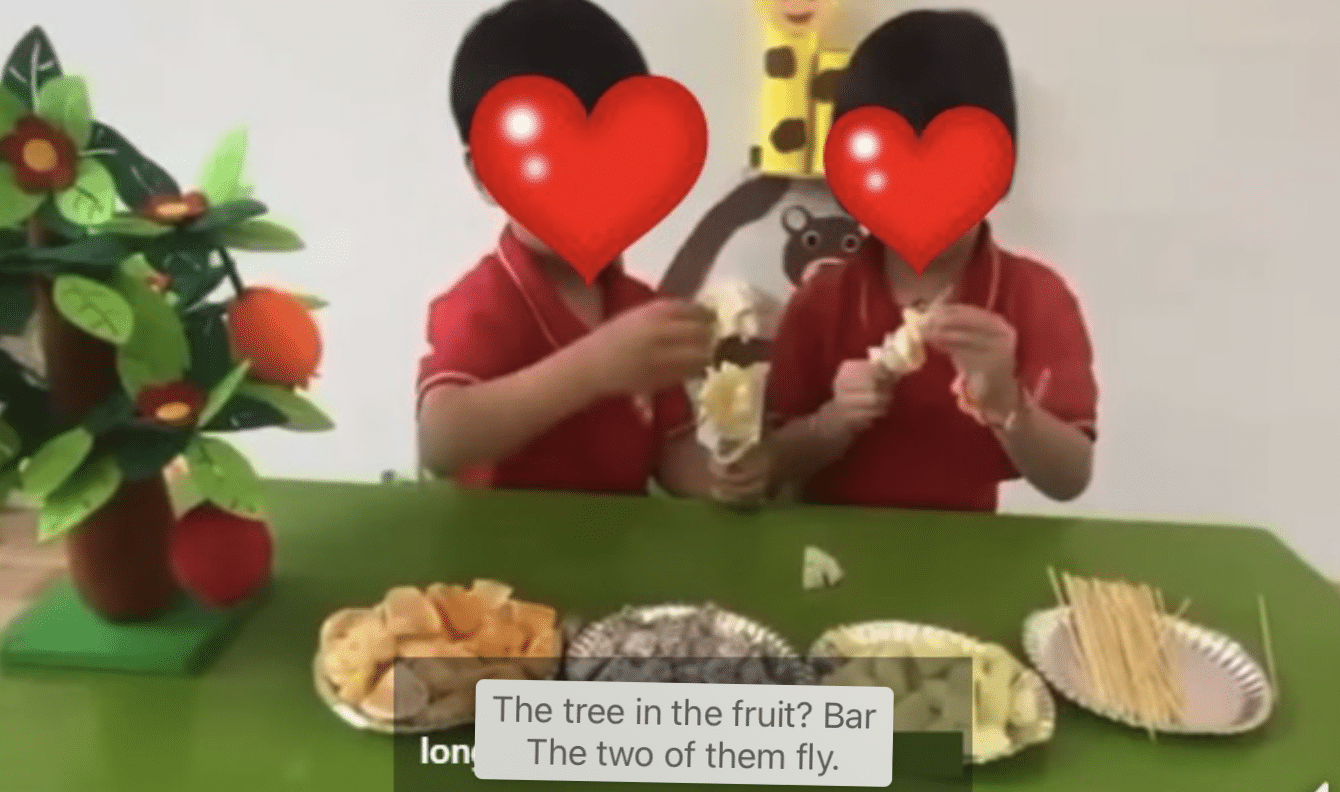 คลิปดังกล่าวแสดงภาพเด็กอนุบาล 2 คนกำลังฝึกหัดเสียบผลไม้หั่นเต๋าเข้ากับไม้เสียบ ซึ่งช่วยพัฒนาทักษะความคล่องแคล่วของนิ้วมือและแรงของมือเด็ก