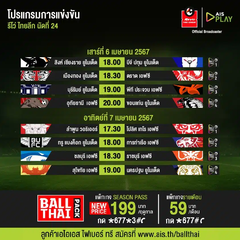 ตารางแข่งขัน รีโว่ 2023/24 ไทยลีก โปรแกรมฟุตบอลไทยลีก สัปดาห์ที่ 24 ทุกคู่ถ่ายทอดสดทาง AIS Play และ True Ball Thai
