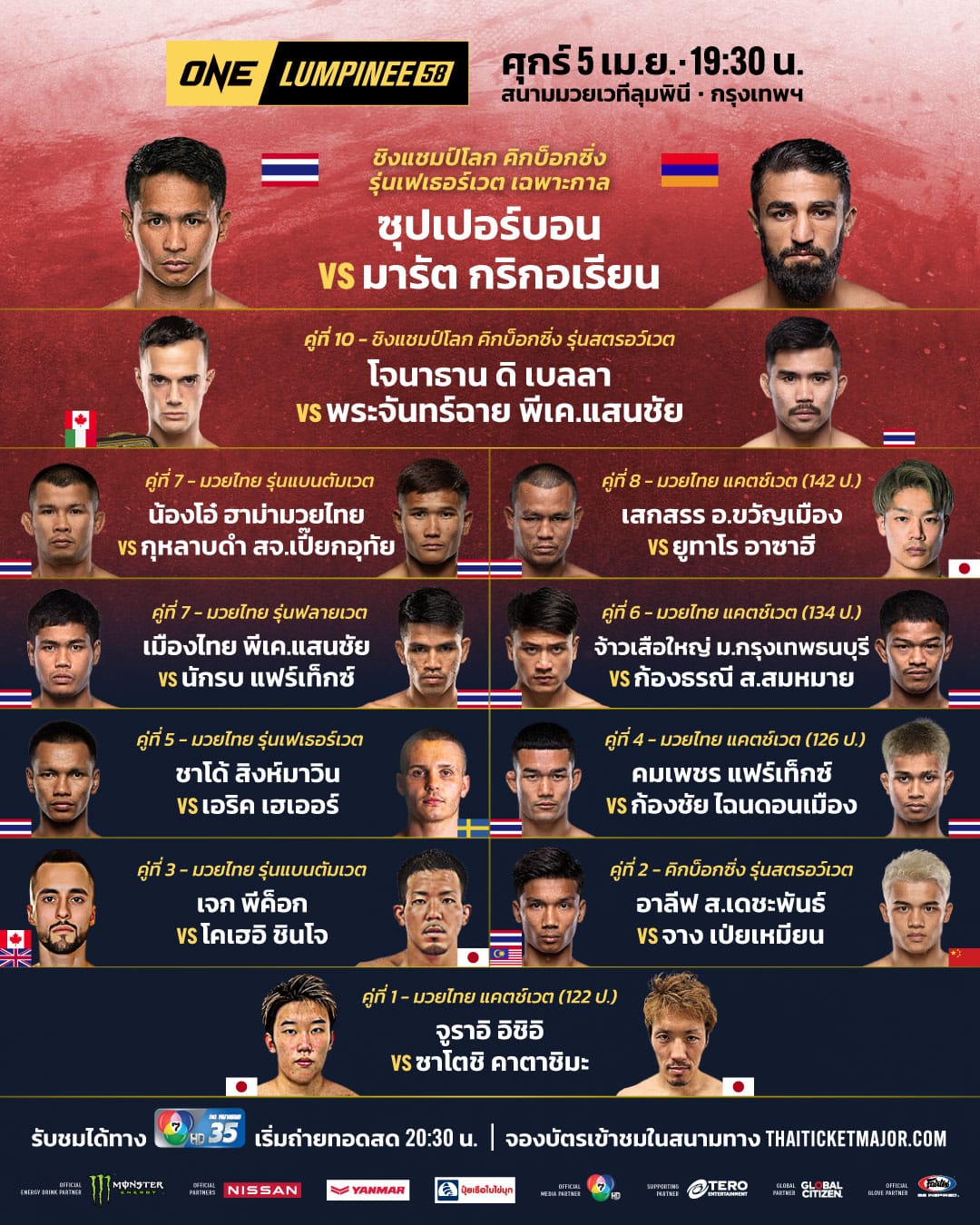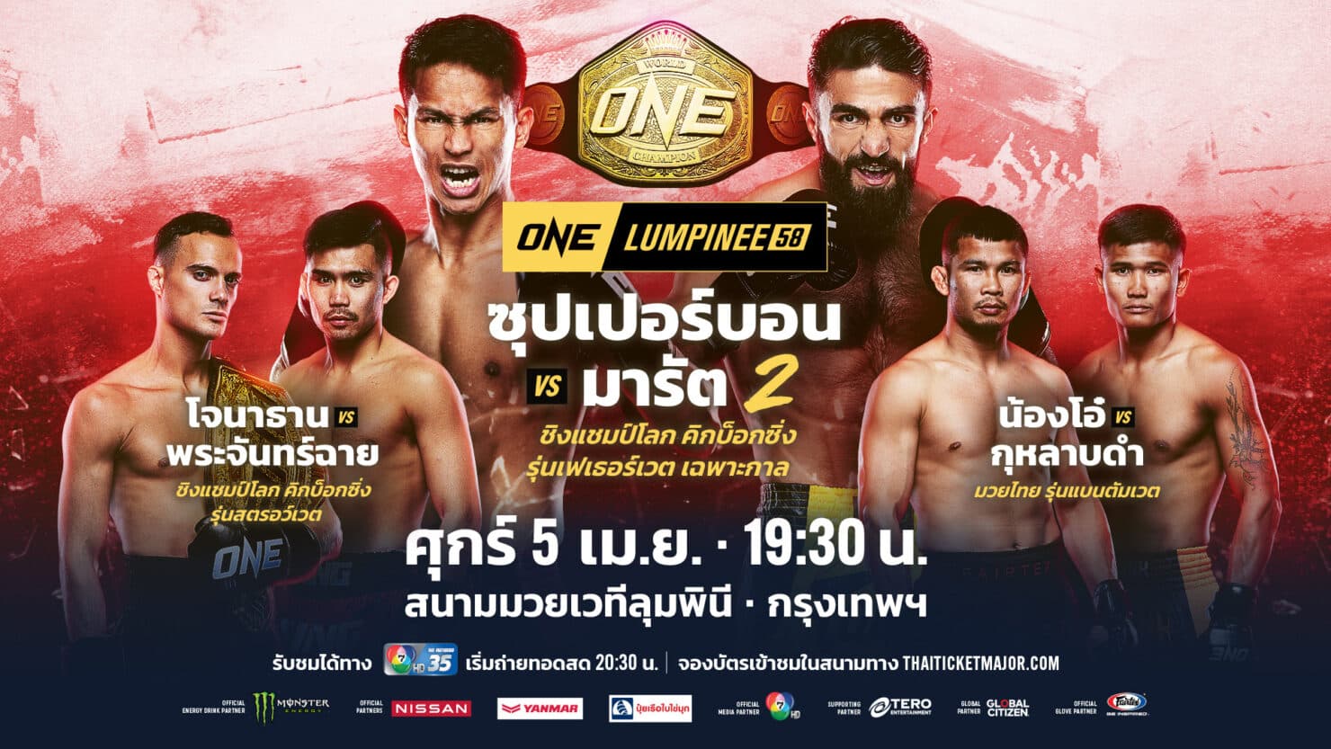 โปรแกรมมวย ONE ลุมพินี 58 สัปดาห์นี้ คู่เอก “ซุปเปอร์บอน ซุปเปอร์บอนเทรนนิงแคมป์” จอมเตะก้านคอคนดัง วัย 33 ปี จากพัทลุง เปิดศึกภาคสองกับ “มารัต กริกอเรียน” จอมบู๊พลังแกร่ง วัย 32 ปี โดยมีเข็มขัดแชมป์โลก ONE คิกบ็อกซิ่ง รุ่นเฟเธอร์เวต (145-155) เฉพาะกาล ให้แย่งชิง