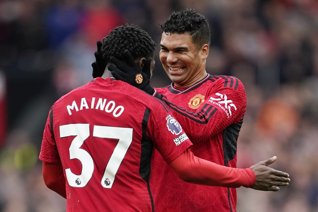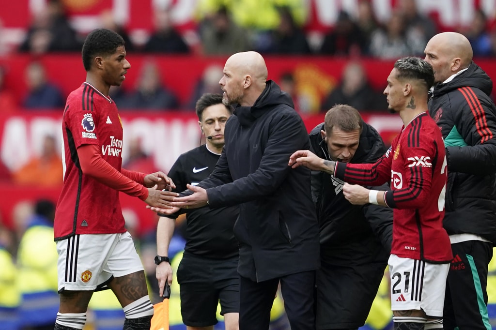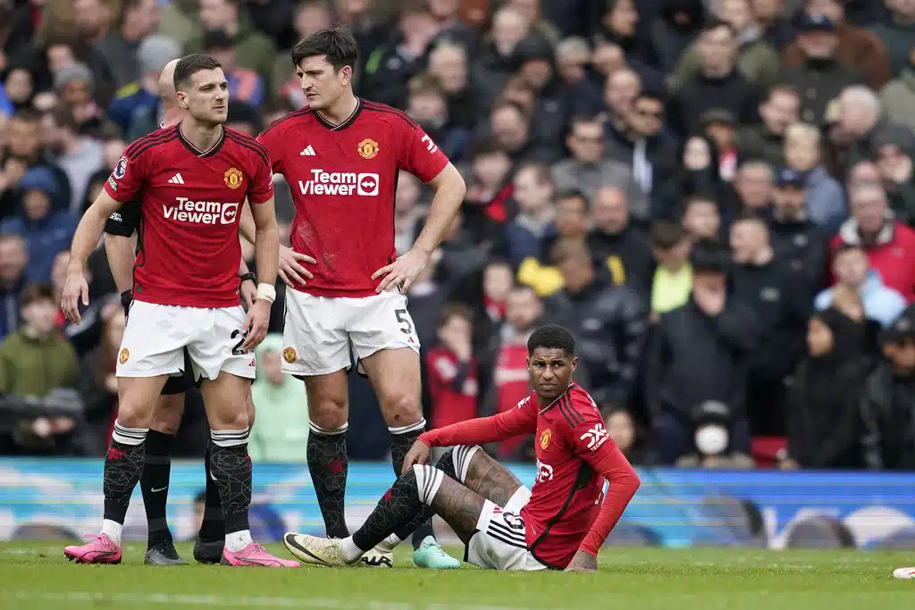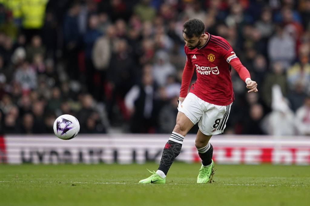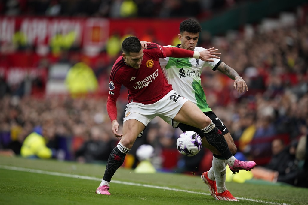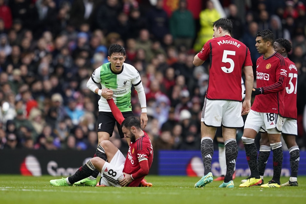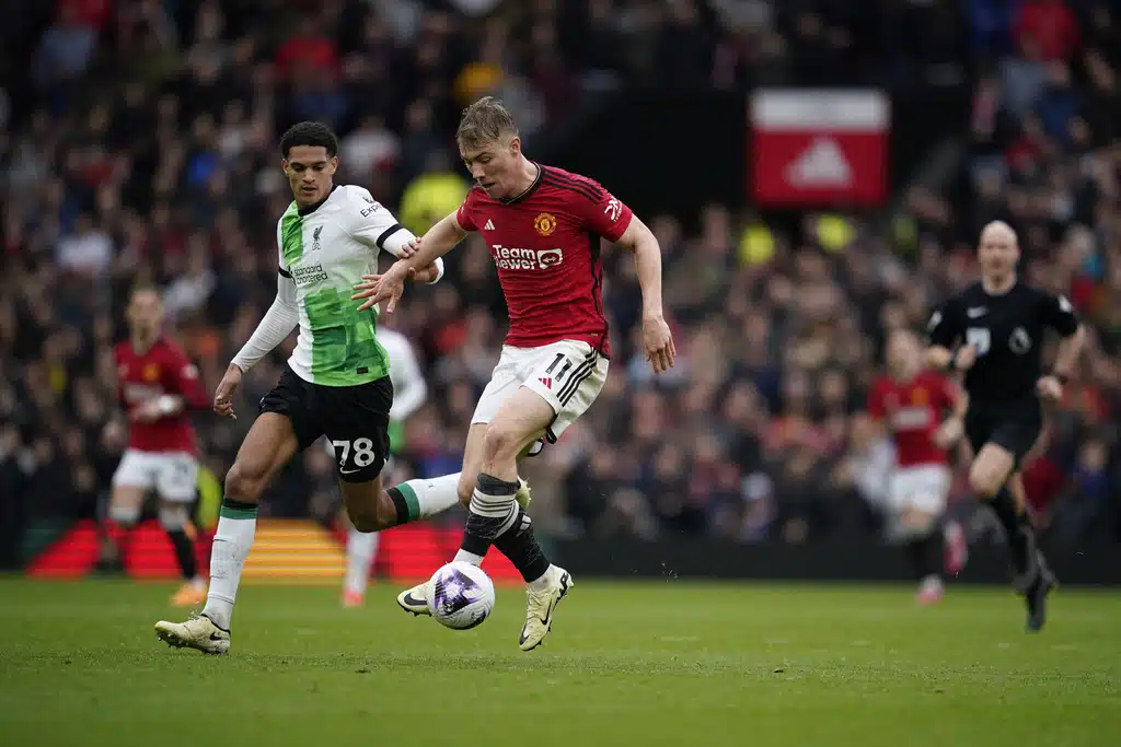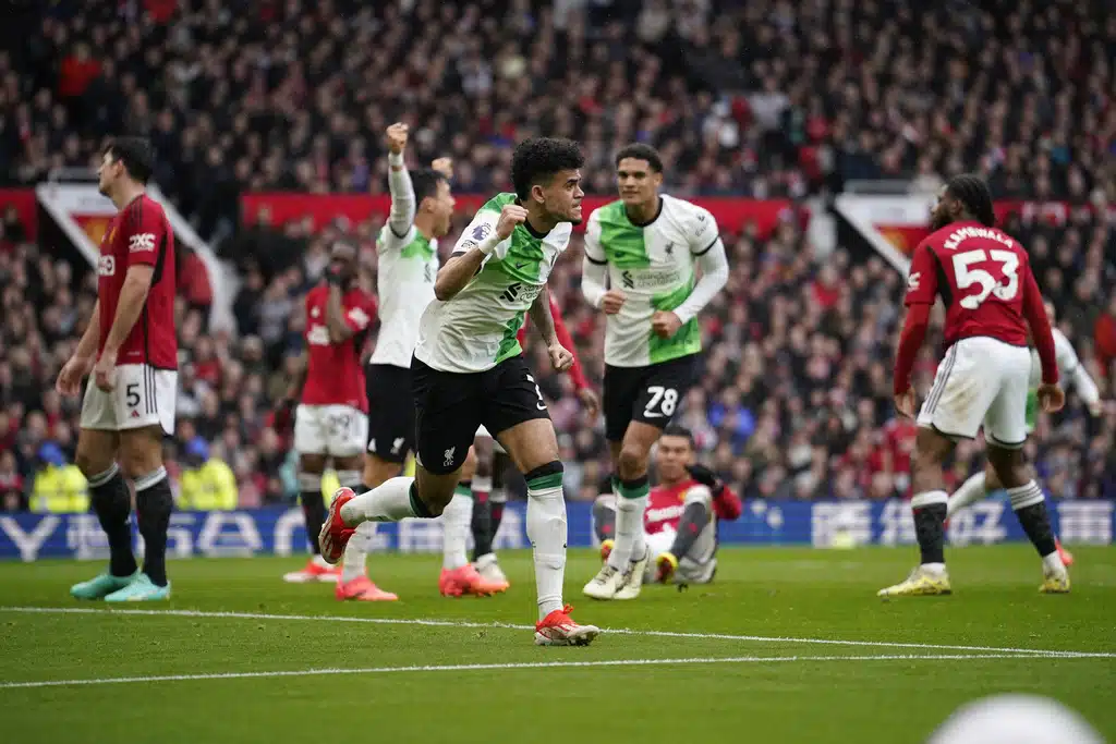 Liverpool’s Luis Diaz, centre, celebrates after scoring the opening goal during the English Premier League soccer match between Manchester United and Liverpool at the Old Trafford stadium in Manchester, England, Sunday, April 7, 2024. (AP Photo/Dave Thompson)Liverpool’s Mohamed Salah, centre left, celebrates with Harvey Elliott after scoring his side’s second goal during the English Premier League soccer match between Manchester United and Liverpool at the Old Trafford stadium in Manchester, England, Sunday, April 7, 2024. (AP Photo/Dave Thompson)Manchester United’s Marcus Rashford, right, sits on the pitch after an injury during the English Premier League soccer match between Manchester United and Liverpool at the Old Trafford stadium in Manchester, England, Sunday, April 7, 2024. (AP Photo/Dave Thompson)Manchester United’s Rasmus Hojlund, centre, and Liverpool’s Jarell Quansah challenge for the ball during the English Premier League soccer match between Manchester United and Liverpool at the Old Trafford stadium in Manchester, England, Sunday, April 7, 2024. (AP Photo/Dave Thompson)Manchester United’s Rasmus Hojlund reacts during the English Premier League soccer match between Manchester United and Liverpool at the Old Trafford stadium in Manchester, England, Sunday, April 7, 2024. (AP Photo/Dave Thompson)Manchester United’s Kobbie Mainoo, left, celebrates with Casemiro after scoring his side’s second goal during the English Premier League soccer match between Manchester United and Liverpool at the Old Trafford stadium in Manchester, England, Sunday, April 7, 2024. (AP Photo/Dave Thompson)Manchester United’s Kobbie Mainoo, centre, celebrates after scoring his side’s second goal during the English Premier League soccer match between Manchester United and Liverpool at the Old Trafford stadium in Manchester, England, Sunday, April 7, 2024. (AP Photo/Dave Thompson)Manchester United’s Kobbie Mainoo, second from right, scores his side’s second goal during the English Premier League soccer match between Manchester United and Liverpool at the Old Trafford stadium in Manchester, England, Sunday, April 7, 2024. (AP Photo/Dave Thompson)Manchester United’s head coach Erik ten Hag, centre, gestures to Manchester United’s Marcus Rashford during a substitution after an injury during the English Premier League soccer match between Manchester United and Liverpool at the Old Trafford stadium in Manchester, England, Sunday, April 7, 2024. (AP Photo/Dave Thompson)Manchester United’s Bruno Fernandes scores his side’s first goal during the English Premier League soccer match between Manchester United and Liverpool at the Old Trafford stadium in Manchester, England, Sunday, April 7, 2024. (AP Photo/Dave Thompson)Manchester United’s Diogo Dalot, left, and Liverpool’s Luis Diaz challenge for the ball during the English Premier League soccer match between Manchester United and Liverpool at the Old Trafford stadium in Manchester, England, Sunday, April 7, 2024. (AP Photo/Dave Thompson)Manchester United’s Bruno Fernandes sits on the pitch after a challenge with Liverpool’s Wataru Endo, top left, during the English Premier League soccer match between Manchester United and Liverpool at the Old Trafford stadium in Manchester, England, Sunday, April 7, 2024. (AP Photo/Dave Thompson)