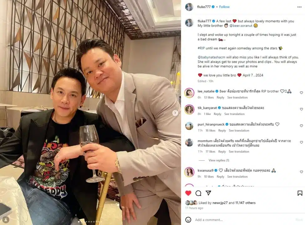 ฟลุก เกริกพล ได้โพสต์รูปภาพ พร้อมเขียนข้อความไว้อาลัยถึงเบียร์ น้องชายสุดรัก ครั้งสุดท้ายว่า “A few last but always lovely moments with you My little brother @beer.soranut I slept and woke up tonight a couple of times hoping it was just a bad dream… #RIP until we meet again someday among the stars @babynatashacm will also miss you like I will always think of you. She will always get to see your photos and clips. You will always be alive in her memory as well as mine we love you little bro April 7, 2024”
