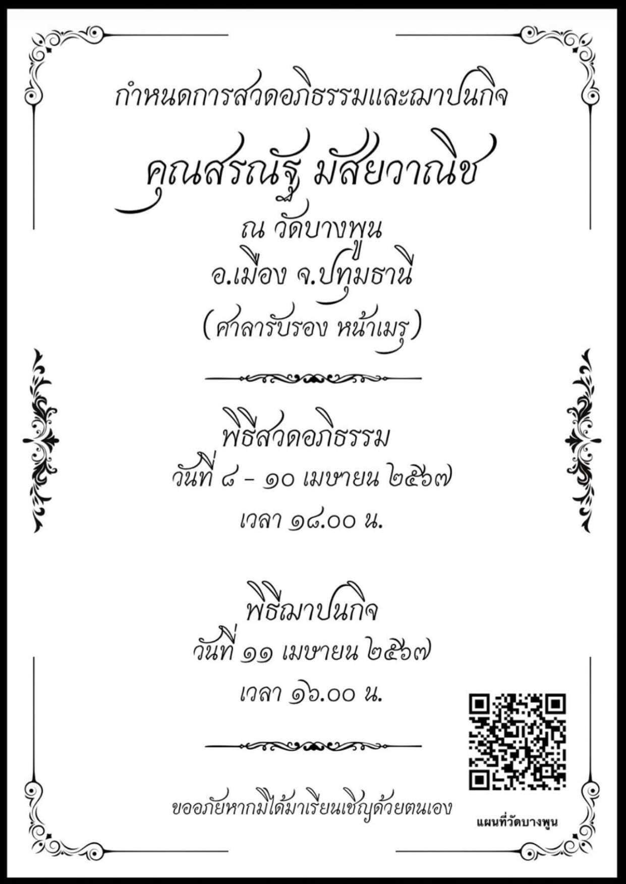 สำหรับ กำหนดการสวดอภิธรรมและฌาปนกิจ จัดขึ้น ณ วัดบางพูน อ.เมือง จ.ปทุมตาน (ศาลารับรอง หน้าเมรุ) พิธีสวดอภิธรรม วันที่ 8 – 10 เมษายน 2567 เวลา 18.00 น. พิธีฌาปนกิจ วันที่ 11 เมษายน 2567 เวลา 16.00 น.
