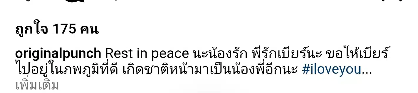 แปลเป็นไทยว่า “ช่วงเวลาสุดท้ายที่น่ารักกับเธอเสมอน้องชายของพี่ @beer.soranut คืนนี้พี่นอนหลับๆ ตื่นๆ อยากให้มันเป็นเพียงแค่ฝันร้าย… #RIP จนกว่าเราจะได้พบกันอีกท่ามกลางดวงดาว @babynatashacm จะคิดถึงลุงเบียร์เหมือนอย่างที่พี่คิดถึงหนู หนูจะได้เห็นรูปและวิดีโอของลุงเบียร์เสมอ ลุงเบียร์จะอยู่ในความทรงจำของหนูและพี่ตลอดไป พวกเรารักหนูนะน้องชายตัวเล็ก 7 เมษายน 2567″