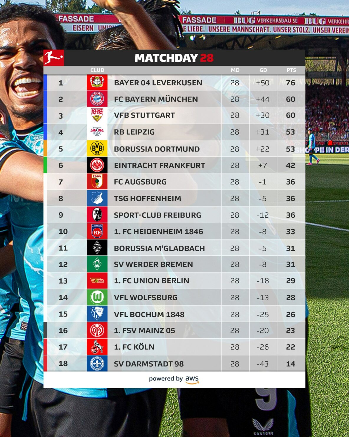 สรุปผลการแข่งขัน บุนเดสลีกา เยอรมัน 2023/24 หลังจบนัดที่ 28