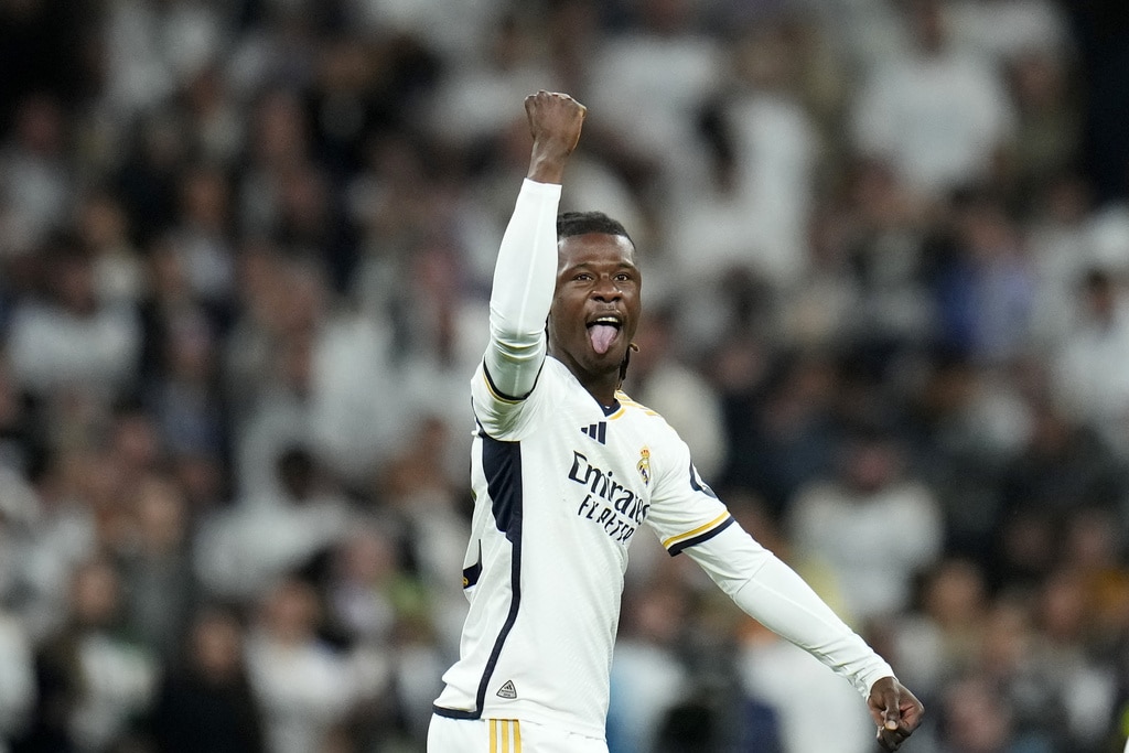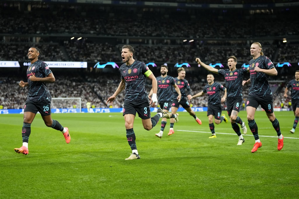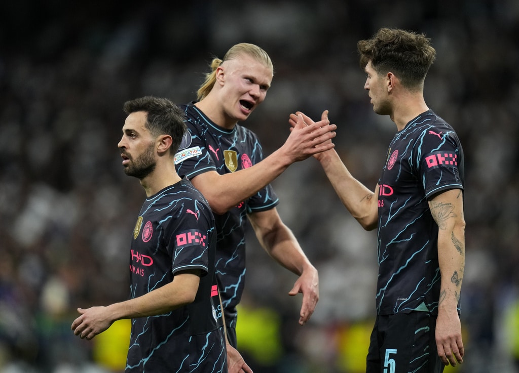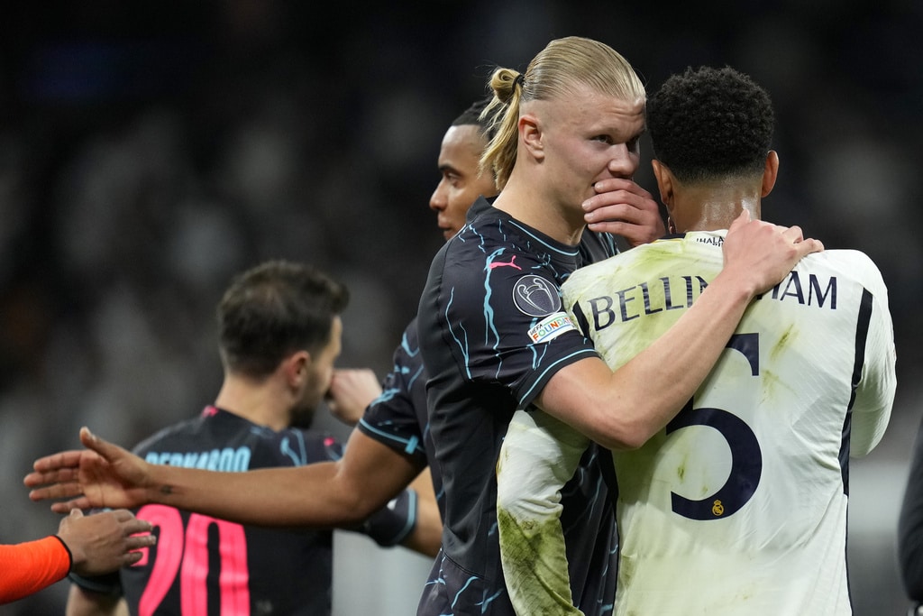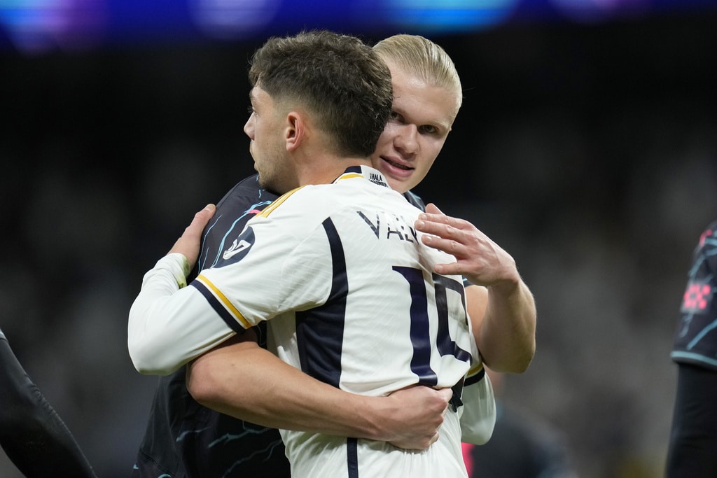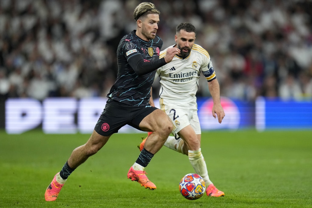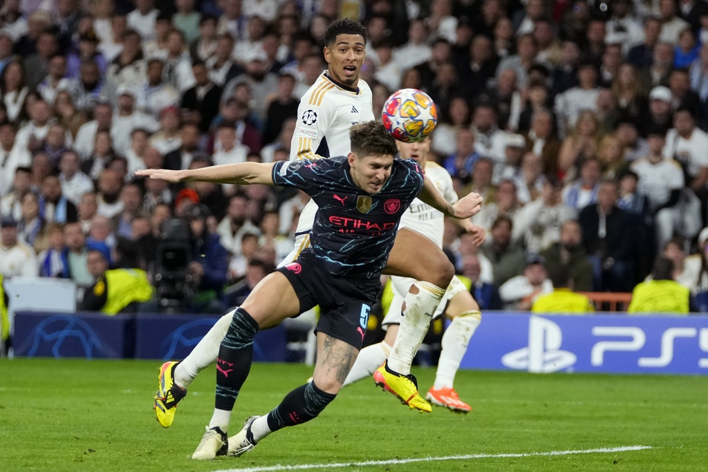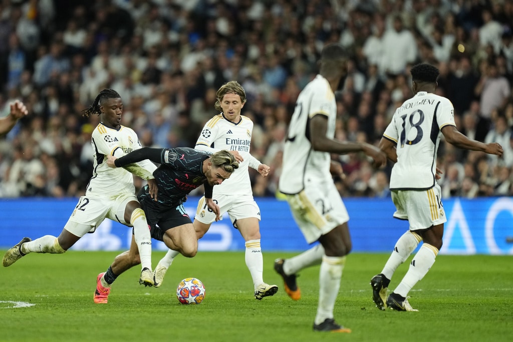 Manchester City’s Jack Grealish, second left, is challenged by Real Madrid’s Eduardo Camavinga, left, and Real Madrid’s Luka Modric, center, during the Champions League quarterfinal first leg soccer match between Real Madrid and Manchester City at the Santiago Bernabeu stadium in Madrid, Spain, Tuesday, April 9, 2024. (AP Photo/Jose Breton)Real Madrid’s Eduardo Camavinga celebrates scoring his side’s first goal during the Champions League quarterfinal first leg soccer match between Real Madrid and Manchester City at the Santiago Bernabeu stadium in Madrid, Spain, Tuesday, April 9, 2024. (AP Photo/Manu Fernandez)Manchester City players celebrate as Bernardo Silva scoring his side’s first goal during the Champions League quarterfinal first leg soccer match between Real Madrid and Manchester City at the Santiago Bernabeu stadium in Madrid, Spain, Tuesday, April 9, 2024. (AP Photo/Manu Fernandez)Manchester City’s Erling Haaland speaks with Real Madrid’s Jude Bellingham at the end of the Champions League quarterfinal first leg soccer match between Real Madrid and Manchester City at the Santiago Bernabeu stadium in Madrid, Spain, Tuesday, April 9, 2024. (AP Photo/Manu Fernandez)Manchester City’s Erling Haaland shakes hands with John Stones at the end of the Champions League quarterfinal first leg soccer match between Real Madrid and Manchester City at the Santiago Bernabeu stadium in Madrid, Spain, Tuesday, April 9, 2024. (AP Photo/Manu Fernandez)Manchester City’s Erling Haaland hugs Real Madrid’s Federico Valverde at the end of the Champions League quarterfinal first leg soccer match between Real Madrid and Manchester City at the Santiago Bernabeu stadium in Madrid, Spain, Tuesday, April 9, 2024. (AP Photo/Manu Fernandez)Manchester City’s Jack Grealish fights for the ball with Real Madrid’s Dani Carvajal during the Champions League quarterfinal first leg soccer match between Real Madrid and Manchester City at the Santiago Bernabeu stadium in Madrid, Spain, Tuesday, April 9, 2024. (AP Photo/Manu Fernandez)Manchester City’s Jack Grealish, left, heads the ball past Real Madrid’s Dani Carvajal during the Champions League quarterfinal first leg soccer match between Real Madrid and Manchester City at the Santiago Bernabeu stadium in Madrid, Spain, Tuesday, April 9, 2024. (AP Photo/Jose Breton)Real Madrid’s Jude Bellingham fights for the ball with Manchester City’s John Stones during the Champions League quarterfinal first leg soccer match between Real Madrid and Manchester City at the Santiago Bernabeu stadium in Madrid, Spain, Tuesday, April 9, 2024. (AP Photo/Manu Fernandez)Manchester City’s Phil Foden, right, is challenged by Real Madrid’s Eduardo Camavinga during the Champions League quarterfinal first leg soccer match between Real Madrid and Manchester City at the Santiago Bernabeu stadium in Madrid, Spain, Tuesday, April 9, 2024. (AP Photo/Jose Breton)