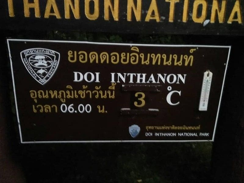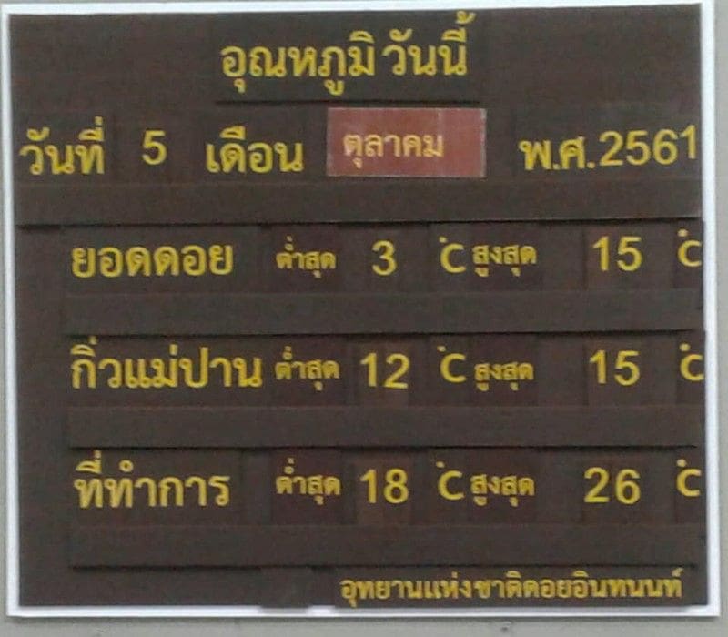 รายงานล่าสุดเมื่อช่วงเช้าวันที่ 5 ตุลาคม ณ บริเวณยอดดอยอินทนนท์ อุณหภูมิลดต่ำลงถึง 3 องศาเซลเซียส และมีหมอกหนา