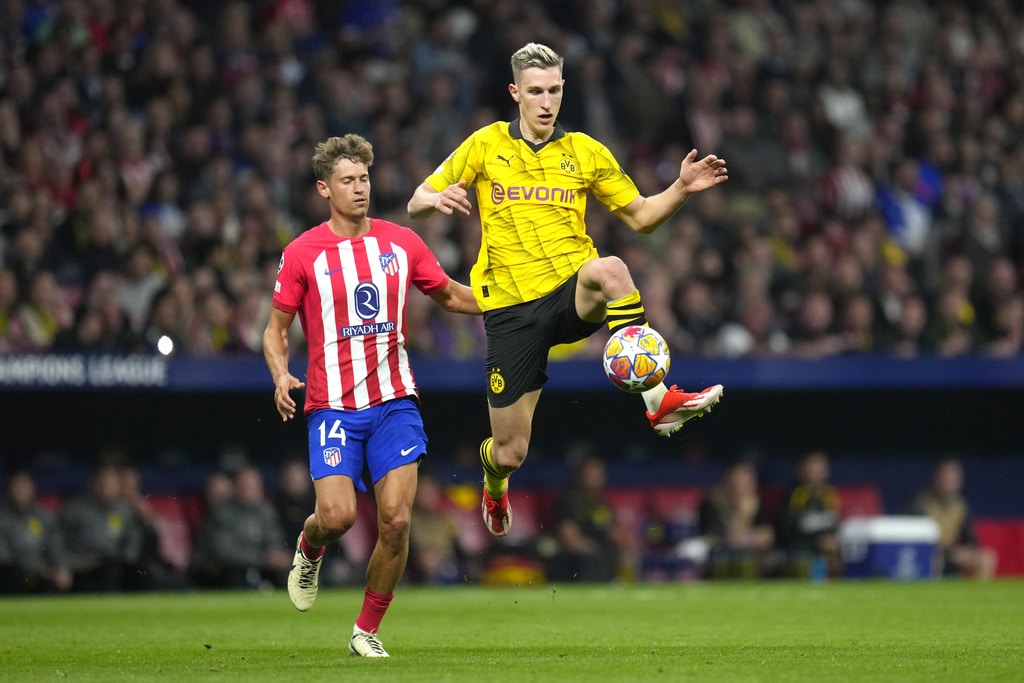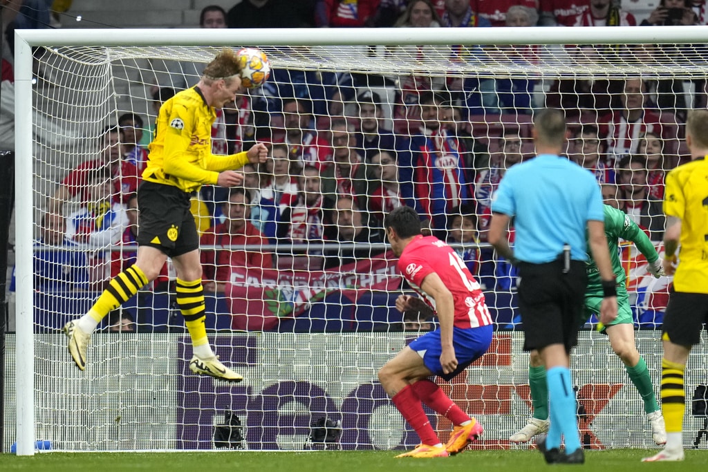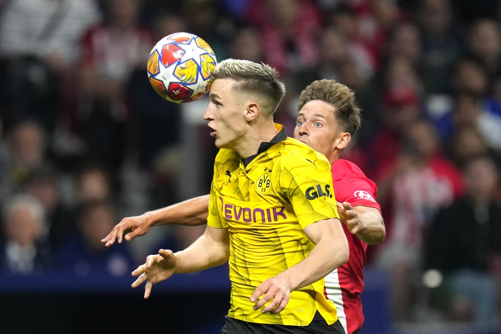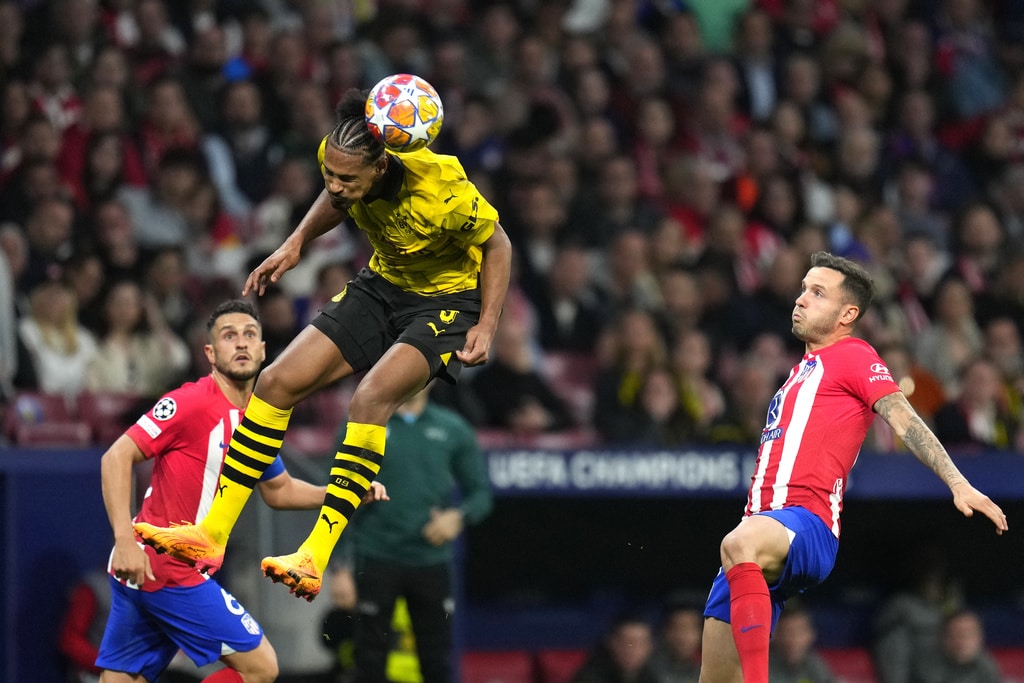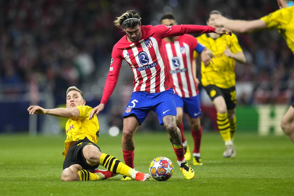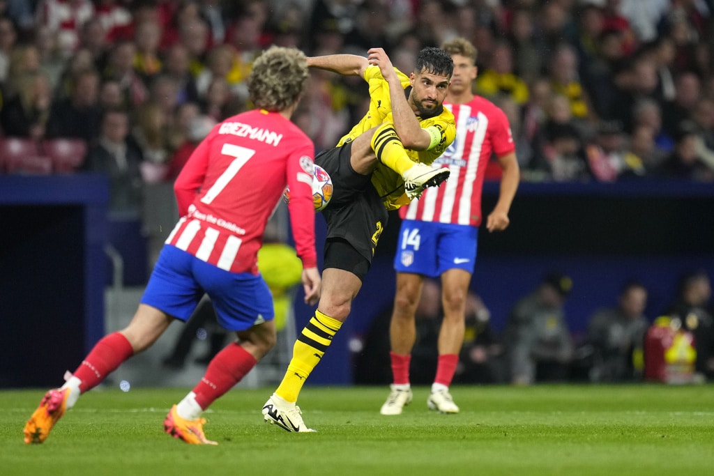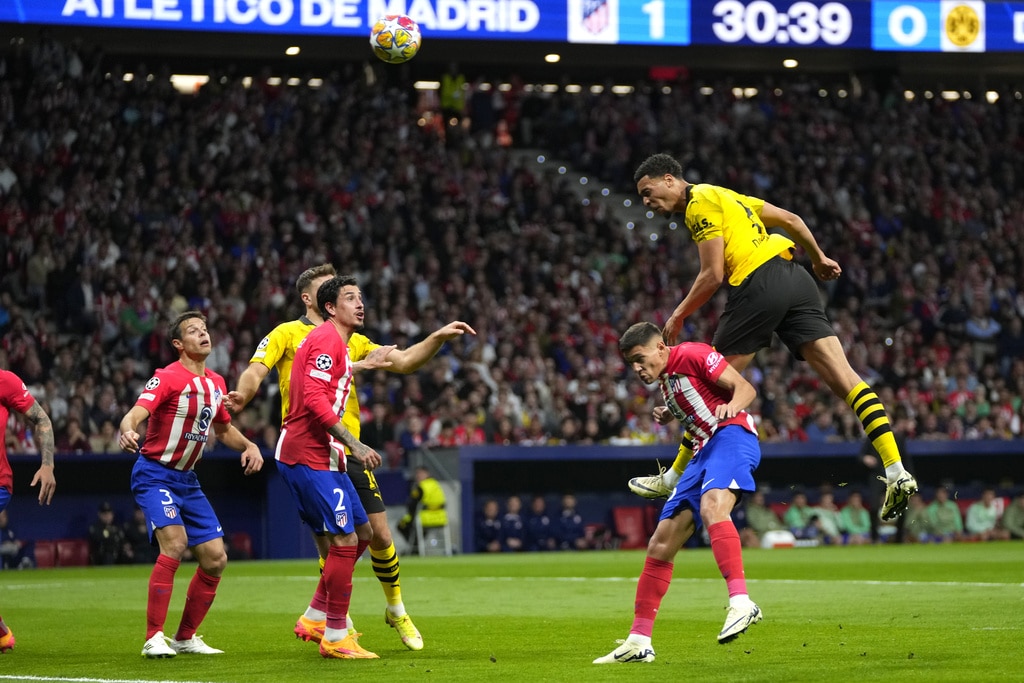 Atletico Madrid’s Antoine Griezmann, right, heads the ball during the Champions League quarterfinal soccer match between Atletico Madrid and Borussia Dortmund at the Metropolitano stadium in Madrid, Spain, Wednesday, April 10, 2024. (AP Photo/Manu Fernandez)Atletico Madrid’s Antoine Griezmann and Atletico Madrid’s Rodrigo De Paul celebrate their victory at the Champions League quarterfinal soccer match between Atletico Madrid and Borussia Dortmund at the Metropolitano stadium in Madrid, Spain, Wednesday, April 10, 2024. (AP Photo/Manu Fernandez)Dortmund’s Sebastien Haller, centre, heads the ball during the Champions League quarterfinal soccer match between Atletico Madrid and Borussia Dortmund at the Metropolitano stadium in Madrid, Spain, Wednesday, April 10, 2024. (AP Photo/Manu Fernandez)Dortmund’s Nico Schlotterbeck, left, challenges for the ball with Atletico Madrid’s Marcos Llorente during the Champions League quarterfinal soccer match between Atletico Madrid and Borussia Dortmund at the Metropolitano stadium in Madrid, Spain, Wednesday, April 10, 2024. (AP Photo/Manu Fernandez)Dortmund’s Sebastien Haller, left, celebrates with teammates after scoring his side’s opening goal during the Champions League quarterfinal soccer match between Atletico Madrid and Borussia Dortmund at the Metropolitano stadium in Madrid, Spain, Wednesday, April 10, 2024. (AP Photo/Manu Fernandez)Dortmund’s Julian Brandt heads the ball during the Champions League quarterfinal soccer match between Atletico Madrid and Borussia Dortmund at the Metropolitano stadium in Madrid, Spain, Wednesday, April 10, 2024. (AP Photo/Manu Fernandez)Dortmund’s Nico Schlotterbeck, right, controls the ball in the air ahead of Atletico Madrid’s Marcos Llorente during the Champions League quarterfinal soccer match between Atletico Madrid and Borussia Dortmund at the Metropolitano stadium in Madrid, Spain, Wednesday, April 10, 2024. (AP Photo/Manu Fernandez)Dortmund’s Emre Can, centre, kicks the ball ahead of Atletico Madrid’s Antoine Griezmann during the Champions League quarterfinal soccer match between Atletico Madrid and Borussia Dortmund at the Metropolitano stadium in Madrid, Spain, Wednesday, April 10, 2024. (AP Photo/Manu Fernandez)Atletico Madrid’s Rodrigo De Paul, centre, challenges for the ball with Dortmund’s Nico Schlotterbeck, left, during the Champions League quarterfinal soccer match between Atletico Madrid and Borussia Dortmund at the Metropolitano stadium in Madrid, Spain, Wednesday, April 10, 2024. (AP Photo/Manu Fernandez)Dortmund’s Felix Nmecha, right, makes an attempt to score during the Champions League quarterfinal soccer match between Atletico Madrid and Borussia Dortmund at the Metropolitano stadium in Madrid, Spain, Wednesday, April 10, 2024. (AP Photo/Manu Fernandez)