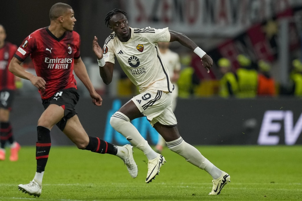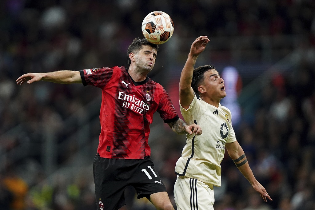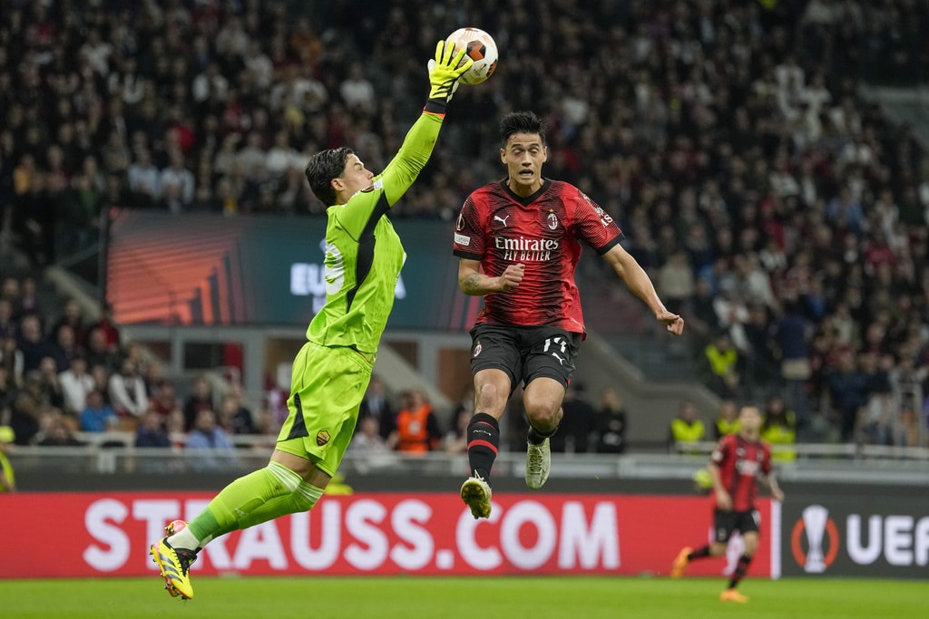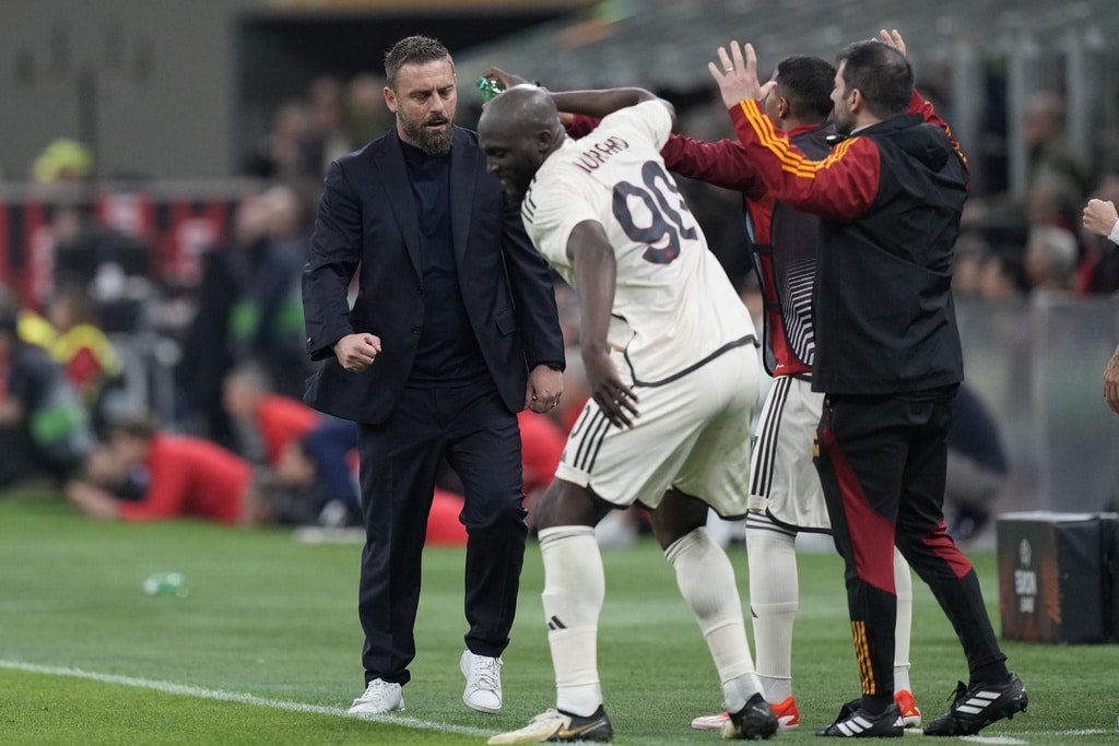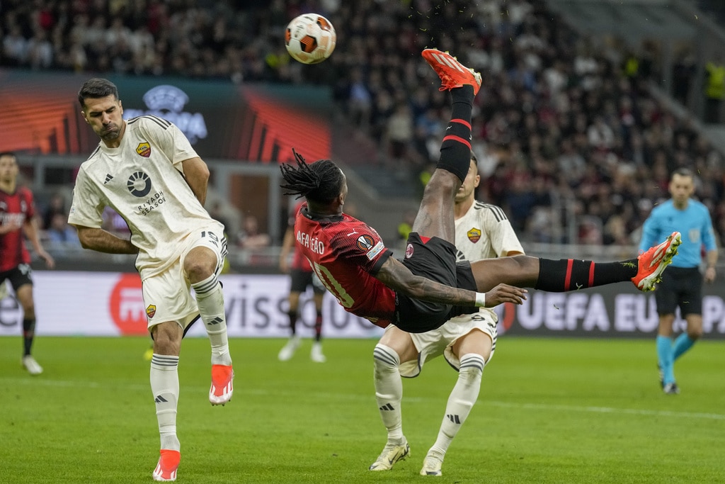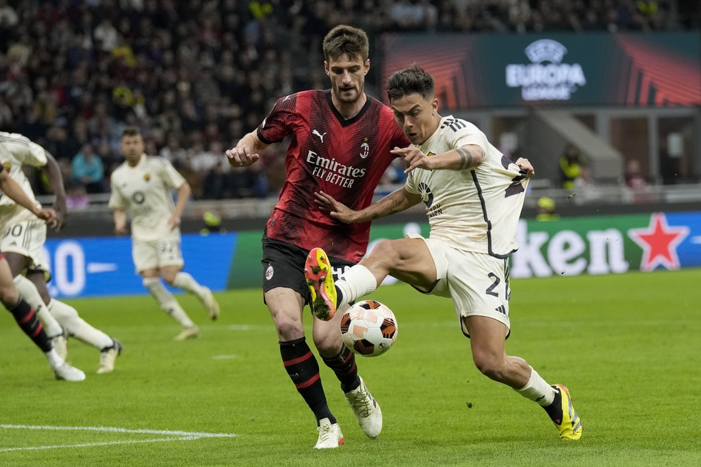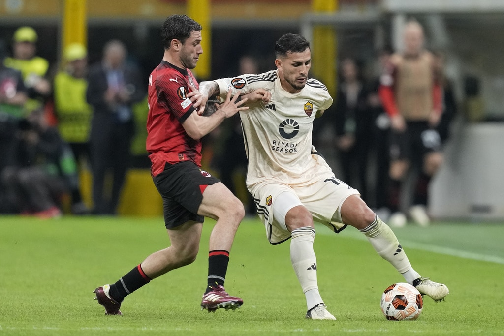 From left, Roma’s Bryan Cristante, AC Milan’s Rafael Leao and Roma’s Zeki Celik fight for the ball during the Europa League quarterfinal first leg soccer match between AC Milan and Roma at the San Siro Stadium, in Milan, Italy, Thursday, April 11, 2024. (AP Photo/Antonio Calanni)AC Milan’s Davide Calabria, left, and Roma’s Leandro Paredes fight for the ball during the Europa League quarterfinal first leg soccer match between AC Milan and Roma at the San Siro Stadium, in Milan, Italy, Thursday, April 11, 2024. (AP Photo/Antonio Calanni)Roma’s head coach Daniele De Rossi, left, and Roma’s Romelu Lukaku celebrate at the end of the Europa League quarterfinal first leg soccer match between AC Milan and Roma at the San Siro Stadium, in Milan, Italy, Thursday, April 11, 2024. (AP Photo/Antonio Calanni)Roma’s Tammy Abraham in action during the Europa League quarterfinal first leg soccer match between AC Milan and Roma at the San Siro Stadium, in Milan, Italy, Thursday, April 11, 2024. (AP Photo/Antonio Calanni)Roma’s head coach Daniele De Rossi, second from left, celebrates at the end of the Europa League quarterfinal first leg soccer match between AC Milan and Roma at the San Siro Stadium, in Milan, Italy, Thursday, April 11, 2024. (AP Photo/Antonio Calanni)AC Milan’s Christian Pulisic fights for head ball ball with AS Roma’s Paulo Dybala during the Europa League soccer match between AC Milan and AS Roma at the San Siro Stadium, Thursday, April 11 2024, in Milan, Italy. (Spada/LaPresse via AP)AC Milan’s Matteo Gabbia, left, and Roma’s Paulo Dybala fight for the ball during the Europa League quarterfinal first leg soccer match between AC Milan and Roma at the San Siro Stadium, in Milan, Italy, Thursday, April 11, 2024. (AP Photo/Antonio Calanni)AC Milan’s Rafael Leao does an overhead kick during the Europa League quarterfinal first leg soccer match between AC Milan and Roma at the San Siro Stadium, in Milan, Italy, Thursday, April 11, 2024. (AP Photo/Antonio Calanni)Roma’s goalkeeper Mile Svilar, left, saves on AC Milan’s Tijjani Reijnders during the Europa League quarterfinal first leg soccer match between AC Milan and Roma at the San Siro Stadium, in Milan, Italy, Thursday, April 11, 2024. (AP Photo/Antonio Calanni)