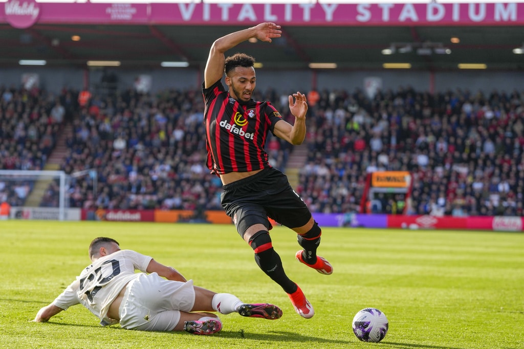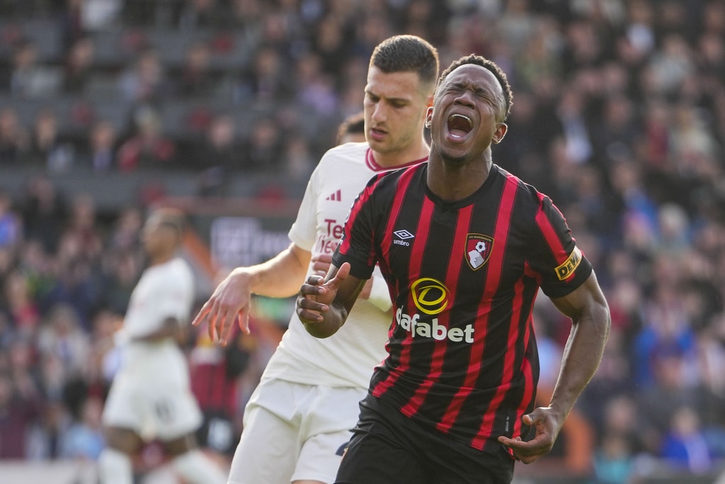 Bournemouth’s Luis Sinisterra reacts after missing a chance to score during the English Premier League soccer match between Bournemouth and Manchester United, at The Vitality Stadium in Bournemouth, England, Saturday, April 13, 2024. (AP Photo/Kirsty Wigglesworth)
