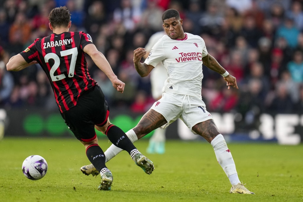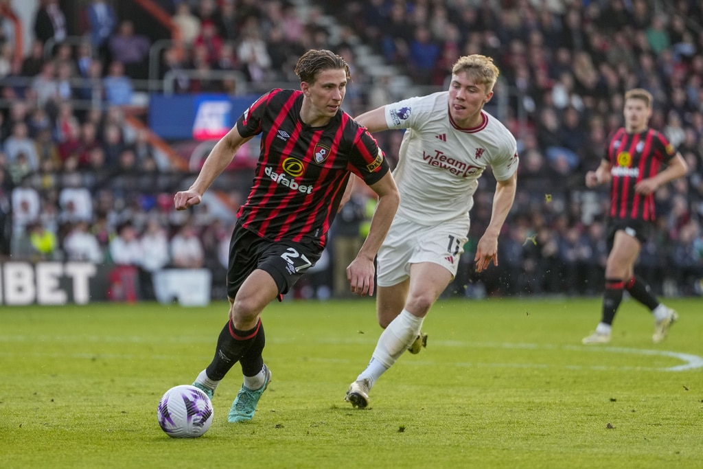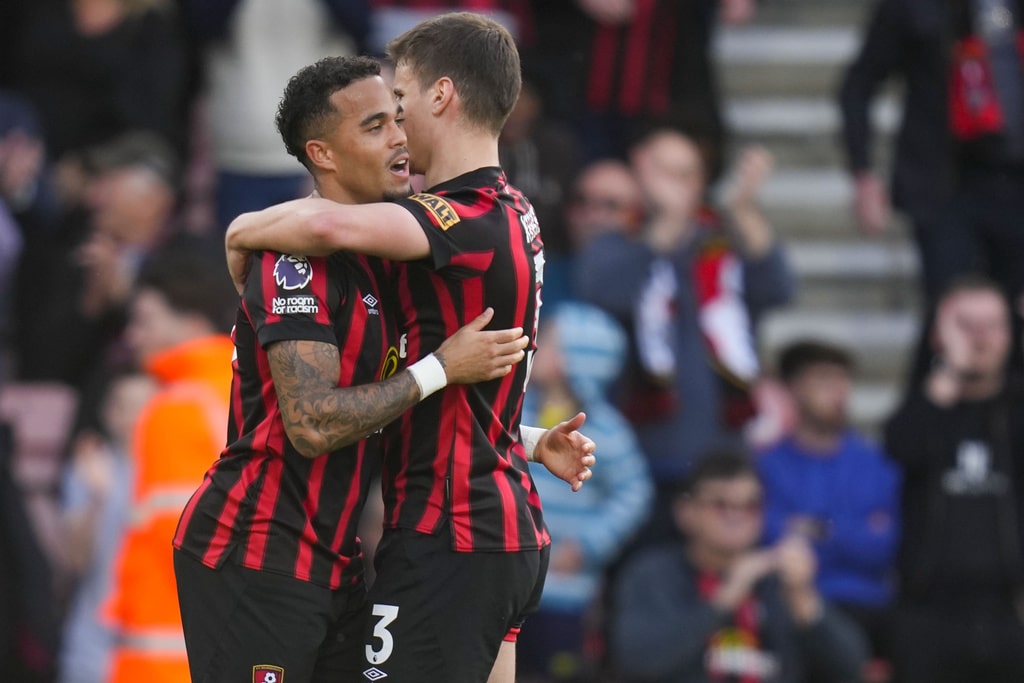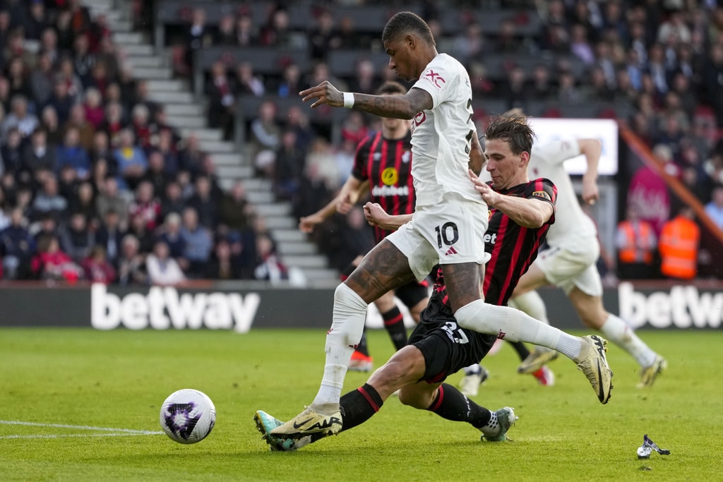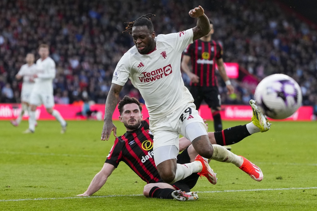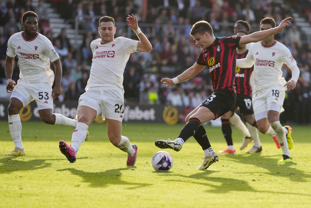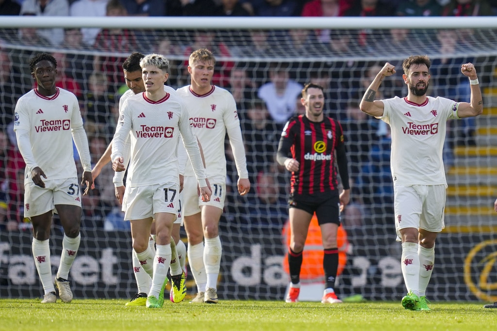 Bournemouth’s Justin Kluivert, left, celebrates with Bournemouth’s Milos Kerkez after scoring his side’s second goal during the English Premier League soccer match between Bournemouth and Manchester United, at The Vitality Stadium in Bournemouth, England, Saturday, April 13, 2024. (AP Photo/Kirsty Wigglesworth)Manchester United’s Aaron Wan-Bissaka, front, duels for the ball with Bournemouth’s Lewis Cook during the English Premier League soccer match between Bournemouth and Manchester United, at The Vitality Stadium in Bournemouth, England, Saturday, April 13, 2024. (AP Photo/Kirsty Wigglesworth)Manchester United’s Marcus Rashford, top, duels for the ball with Bournemouth’s Illya Zabarnyi during the English Premier League soccer match between Bournemouth and Manchester United, at The Vitality Stadium in Bournemouth, England, Saturday, April 13, 2024. (AP Photo/Kirsty Wigglesworth)Manchester United’s Marcus Rashford, right, duels for the ball with Bournemouth’s Illya Zabarnyi during the English Premier League soccer match between Bournemouth and Manchester United, at The Vitality Stadium in Bournemouth, England, Saturday, April 13, 2024. (AP Photo/Kirsty Wigglesworth)Bournemouth’s Illya Zabarnyi, left, duels for the ball with Manchester United’s Rasmus Hojlund during the English Premier League soccer match between Bournemouth and Manchester United, at The Vitality Stadium in Bournemouth, England, Saturday, April 13, 2024. (AP Photo/Kirsty Wigglesworth)Manchester United’s Aaron Wan-Bissaka, left, duels for the ball with Bournemouth’s Dango Ouattara during the English Premier League soccer match between Bournemouth and Manchester United, at The Vitality Stadium in Bournemouth, England, Saturday, April 13, 2024. (AP Photo/Kirsty Wigglesworth)Manchester United’s Diogo Dalot, second left, tries to block a shot from Bournemouth’s Milos Kerkez during the English Premier League soccer match between Bournemouth and Manchester United, at The Vitality Stadium in Bournemouth, England, Saturday, April 13, 2024. (AP Photo/Kirsty Wigglesworth)Manchester United’s Diogo Dalot, left, duels for the ball with Bournemouth’s Lloyd Kelly during the English Premier League soccer match between Bournemouth and Manchester United, at The Vitality Stadium in Bournemouth, England, Saturday, April 13, 2024. (AP Photo/Kirsty Wigglesworth)Manchester United’s Bruno Fernandes, right, celebrates after scoring his side’s opening goal during the English Premier League soccer match between Bournemouth and Manchester United, at The Vitality Stadium in Bournemouth, England, Saturday, April 13, 2024. (AP Photo/Kirsty Wigglesworth)
