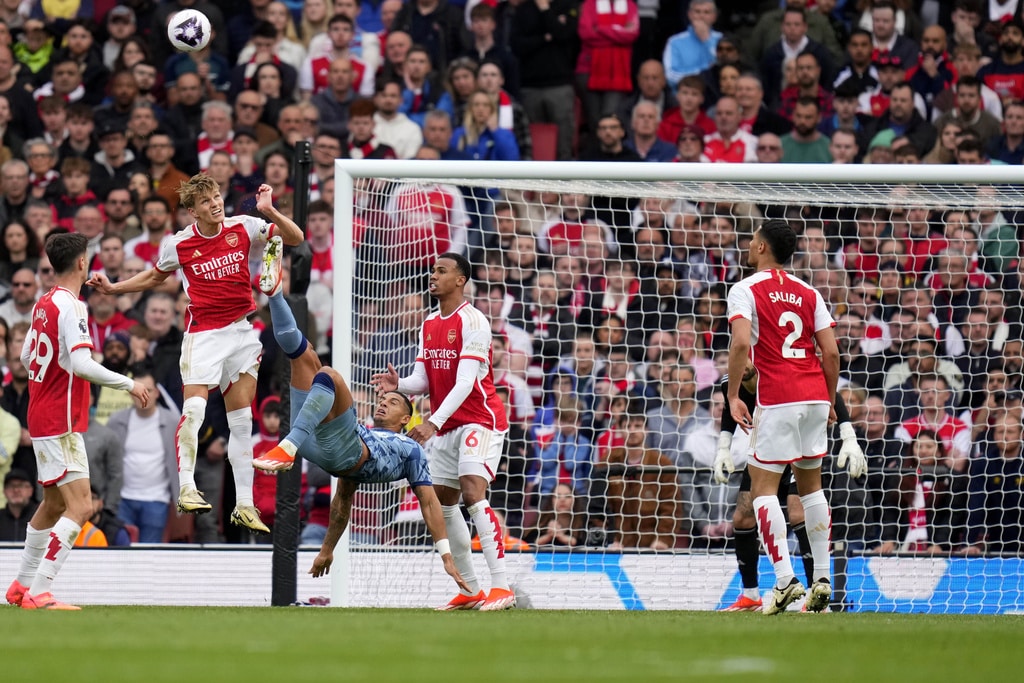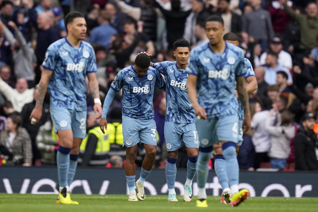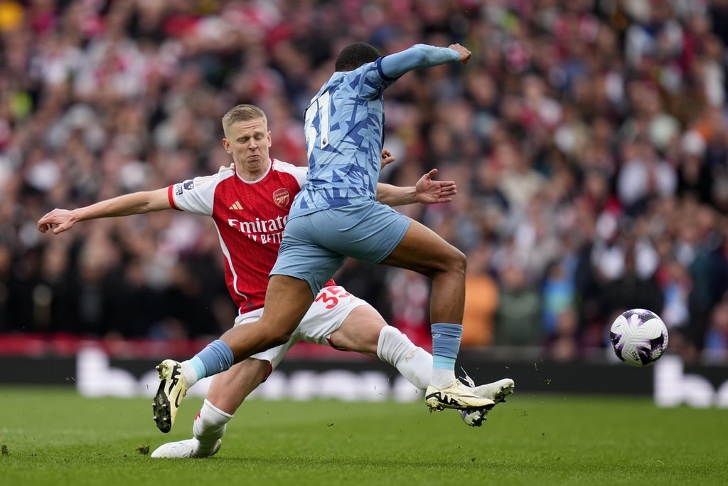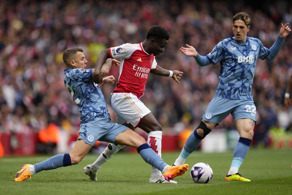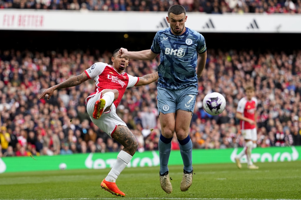 Aston Villa’s Lucas Digne, left, Arsenal’s Bukayo Saka, center, and Aston Villa’s Nicolo Zaniolo challenge for the ball during the English Premier League soccer match between Arsenal and Aston Villa at the Emirates stadium in London, Sunday, April 14, 2024. (AP Photo/Kirsty Wigglesworth)Aston Villa’s Ollie Watkins, background right, and Aston Villa’s Leon Bailey celebrate after scoring during the English Premier League soccer match between Arsenal and Aston Villa at the Emirates stadium in London, Sunday, April 14, 2024. (AP Photo/Kirsty Wigglesworth)Arsenal’s Oleksandr Zinchenko, background, and Aston Villa’s Leon Bailey challenge for the ball during the English Premier League soccer match between Arsenal and Aston Villa at the Emirates stadium in London, Sunday, April 14, 2024. (AP Photo/Kirsty Wigglesworth)Aston Villa’s Ezri Konsa, right, and Arsenal’s Gabriel Martinelli challenge for the ball during the English Premier League soccer match between Arsenal and Aston Villa at the Emirates stadium in London, Sunday, April 14, 2024. (AP Photo/Kirsty Wigglesworth)Aston Villa’s Diego Carlos trie an overhead kick during the English Premier League soccer match between Arsenal and Aston Villa at the Emirates stadium in London, Sunday, April 14, 2024. (AP Photo/Kirsty Wigglesworth)Arsenal’s Gabriel Jesus, left, and Aston Villa’s John McGinn challenge for the ball during the English Premier League soccer match between Arsenal and Aston Villa at the Emirates stadium in London, Sunday, April 14, 2024. (AP Photo/Kirsty Wigglesworth)Arsenal’s Gabriel Jesus reacts during the English Premier League soccer match between Arsenal and Aston Villa at the Emirates stadium in London, Sunday, April 14, 2024. (AP Photo/Kirsty Wigglesworth)Aston Villa’s Lucas Digne, from left, Arsenal’s Gabriel Jesus, Aston Villa’s Lucas Digne, Arsenal’s Kai Havertz and Aston Villa’s Ollie Watkins go for header during the English Premier League soccer match between Arsenal and Aston Villa at the Emirates stadium in London, Sunday, April 14, 2024. (AP Photo/Kirsty Wigglesworth)Arsenal’s Leandro Trossard reacts during the English Premier League soccer match between Arsenal and Aston Villa at the Emirates stadium in London, Sunday, April 14, 2024. (AP Photo/Kirsty Wigglesworth)Arsenal’s William Saliba, center, Aston Villa’s Alex Moreno, left, and Aston Villa’s Youri Tielemans challenge for the ball during the English Premier League soccer match between Arsenal and Aston Villa at the Emirates stadium in London, Sunday, April 14, 2024. (AP Photo/Kirsty Wigglesworth)