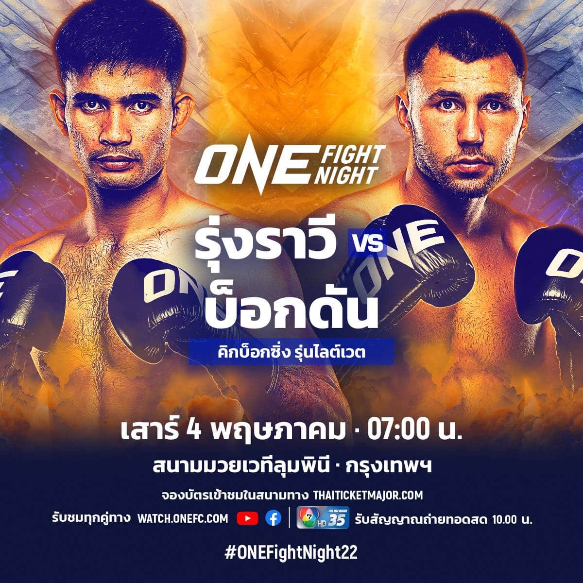 “รุ่งราวี ศิษย์สองพี่น้อง” มวยซ้ายหนักแรง วัย 28 ปี จากอุบลราชธานี พร้อมออกล่าชัยชนะไฟต์ที่ 2 ติดต่อกันบนเวทีระดับโลก โดยคราวนี้ขอสลับมาโชว์ฝีมือในกติกาคิกบ็อกซิ่ง พบกับ “บ็อกดัน ชูมารอฟ” นักสู้ฝีมืออันตราย วัย 27 ปี จากบัลแกเรีย ที่ฟอร์มกำลังร้อนแรงถล่มคู่ชกแบบไม่ครบยกมา 2 ไฟต์รวด โดยจะประชันฝีมือกันภายใต้กติกาคิกบ็อกซิ่ง รุ่นไลต์เวต (155 – 170 ป.) ในศึก ONE Fight Night 22 ที่จะถ่ายทอดสดจากสนามมวยเวทีลุมพินี (รามอินทรา) วันเสาร์ที่ 4 พ.ค.นี้ เริ่มเวลา 07.00 น.