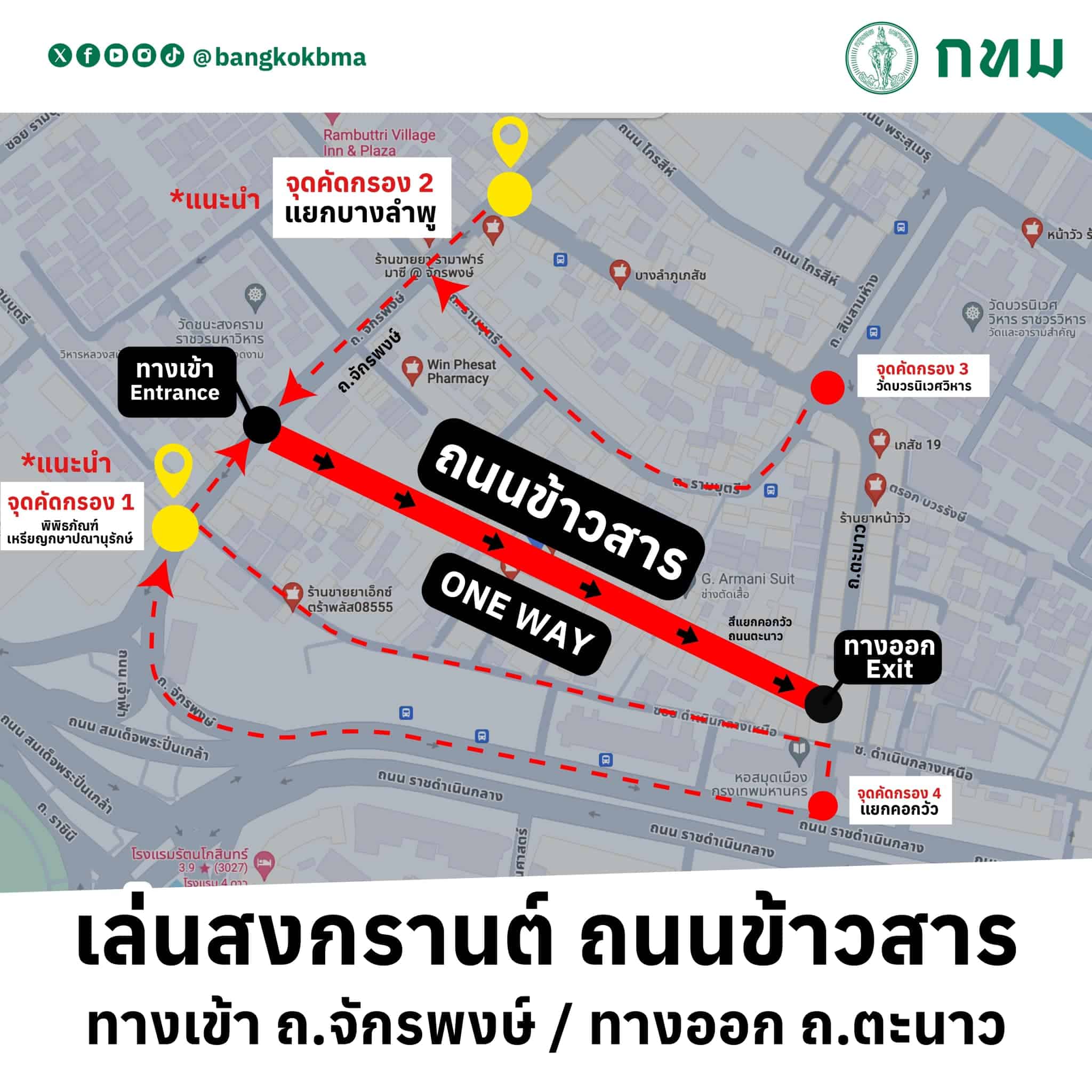 เพจ กรุงเทพมหานคร ได้โพสต์ข้อความเฟซบุ๊ก เปิดเส้นทางเข้างาน สงกรานต์ถนนข้าวสาร 1 ทางเข้า มาได้ 4 เส้นทาง ย้ำ! เดินเล่นน้ำแบบ One Way