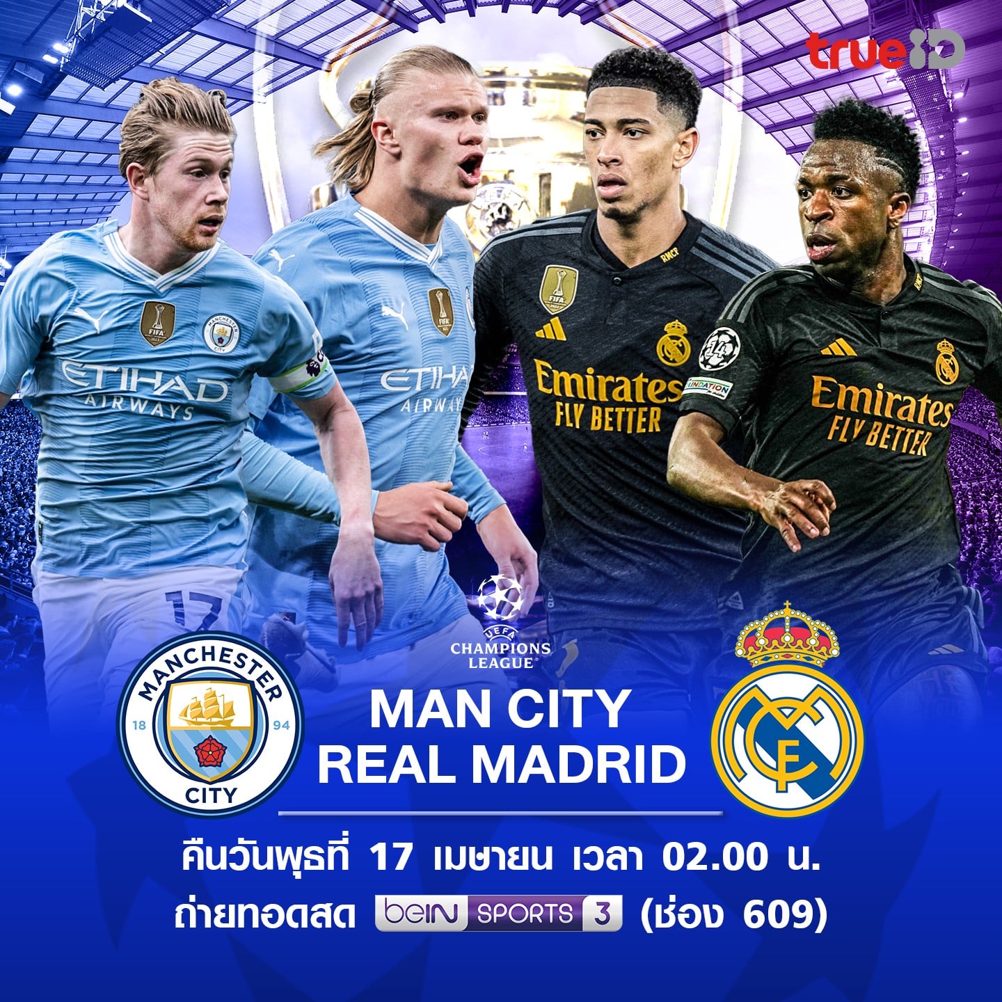 17 เมษายน 67 ถ่ายทอดสด ฟุตบอล ยูฟ่า แชมเปี้ยนส์ลีก ฤดูกาล 2023/24 รอบ 8 ทีมสุดท้ายนัดที่สอง ระหว่าง แมนซิตี้ VS เรอัล มาดริด ที่สนาม เอติฮัด สเตเดี้ยม แข่งขันเวลา 02:00 น. ตามเวลาประเทศไทย พร้อมถ่ายทอดสดทางช่อง beIN Sports 3