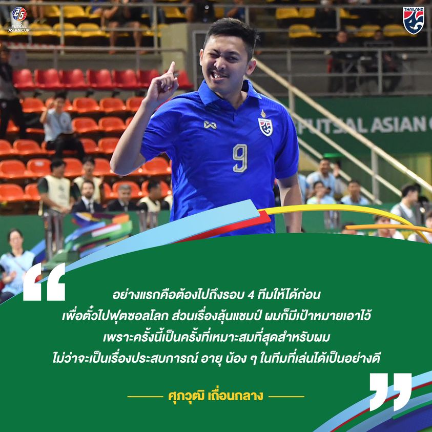 “เป้าหมายส่วนตัวของผมในตอนนี้ อย่างแรกคือต้องไปให้ถึงรอบ 4 ทีมให้ได้ก่อน เพื่อที่จะได้ตั๋วไปเล่นฟุตซอลโลก2024 รอบสุดท้าย ส่วนเรื่องลุ้นแชมป์ผมก็มีเป้าหมายเอาไว้ เพราะครั้งนี้เป็นครั้งที่เหมาะสมที่สุดสำหรับตัวผม ไม่ว่าจะเป็นเรื่องประสบการณ์ , เรื่องอายุ และเรื่องน้องๆในทีมที่เล่นได้เป็นอย่างดี และครั้งนี้ก็จัดที่ประเทศไทย และเชื่อว่าแฟนบอลทุกๆท่านจะสนับสนุนพวกเราและพวกเราก็มั่นใจว่าเราจะทำผลงานออกมาได้ดีที่สุด”