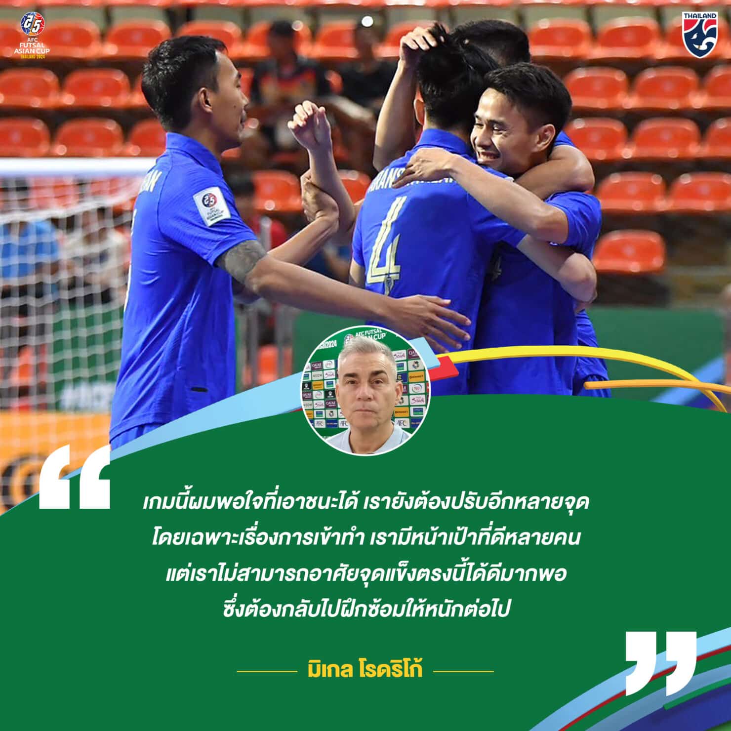หลังจากที่ ทีมชาติไทย เอาชนะ ทีมชาติจีน 3-1 ในนัดแรกของการแข่งขัน ฟุตซอล เอเชียนคัพ 2024 กลุ่มเอ มิเกล โรดริโก้ กุนซือชาวสเปนของทีมชาติไทย กล่าวหลังจบเกมว่า “เกมนี้ผมพอใจที่เอาชนะได้ตามที่หวังไว้ เนื่องจากเป็นเกมแรกย่อมมีความกดดันเสมอ ช่วงต้นเกมนักเตะเจอความกดดัน แต่พอได้ประตูแรกแล้วทุกคนเล่นได้ผ่อนคลายมากขึ้น ส่วนในครึ่งหลังจีนเล่นเพาเวอร์เพลย์ ทำให้ได้ครองบอลมาก แต่ก็ไม่ได้สร้างความกดดันอะไร แต่เราเองก็ยังหาโอกาสทำประตูเพิ่มไม่ได้”